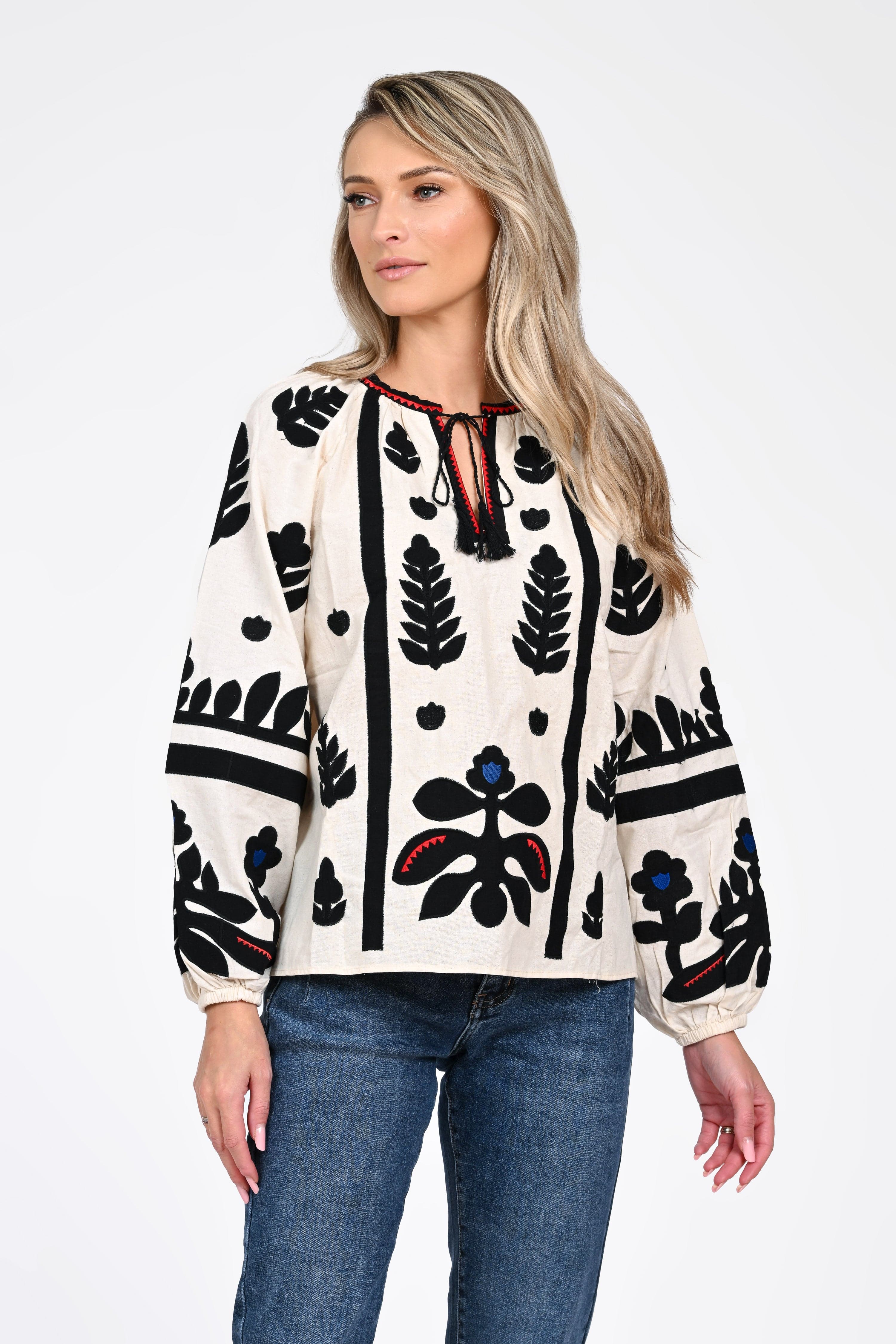 Modelul are o croială lejeră, care oferă libertate de mișcare și se potrivește armonios diferitelor tipuri de siluetă. Mânecile lungi, ușor bufante, adaugă un aer feminin și boem, iar decolteul cu șnur și ciucuri completează look-ul cu un accent autentic și rafinat.