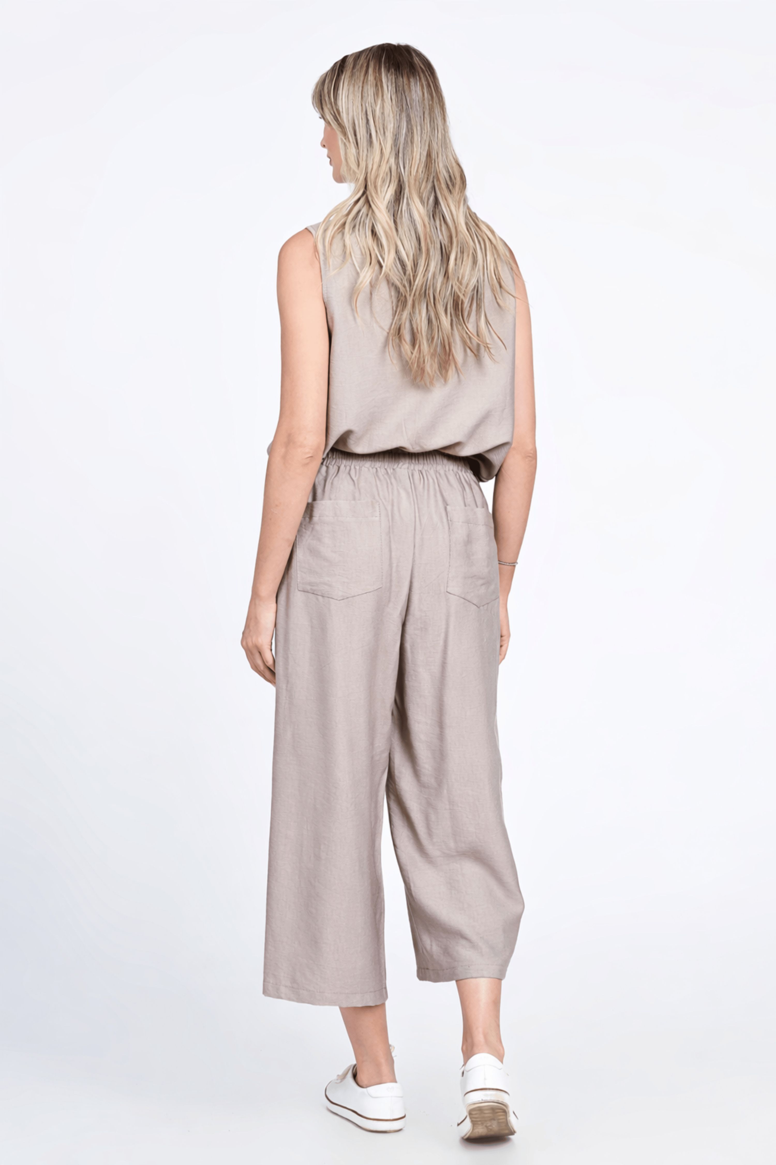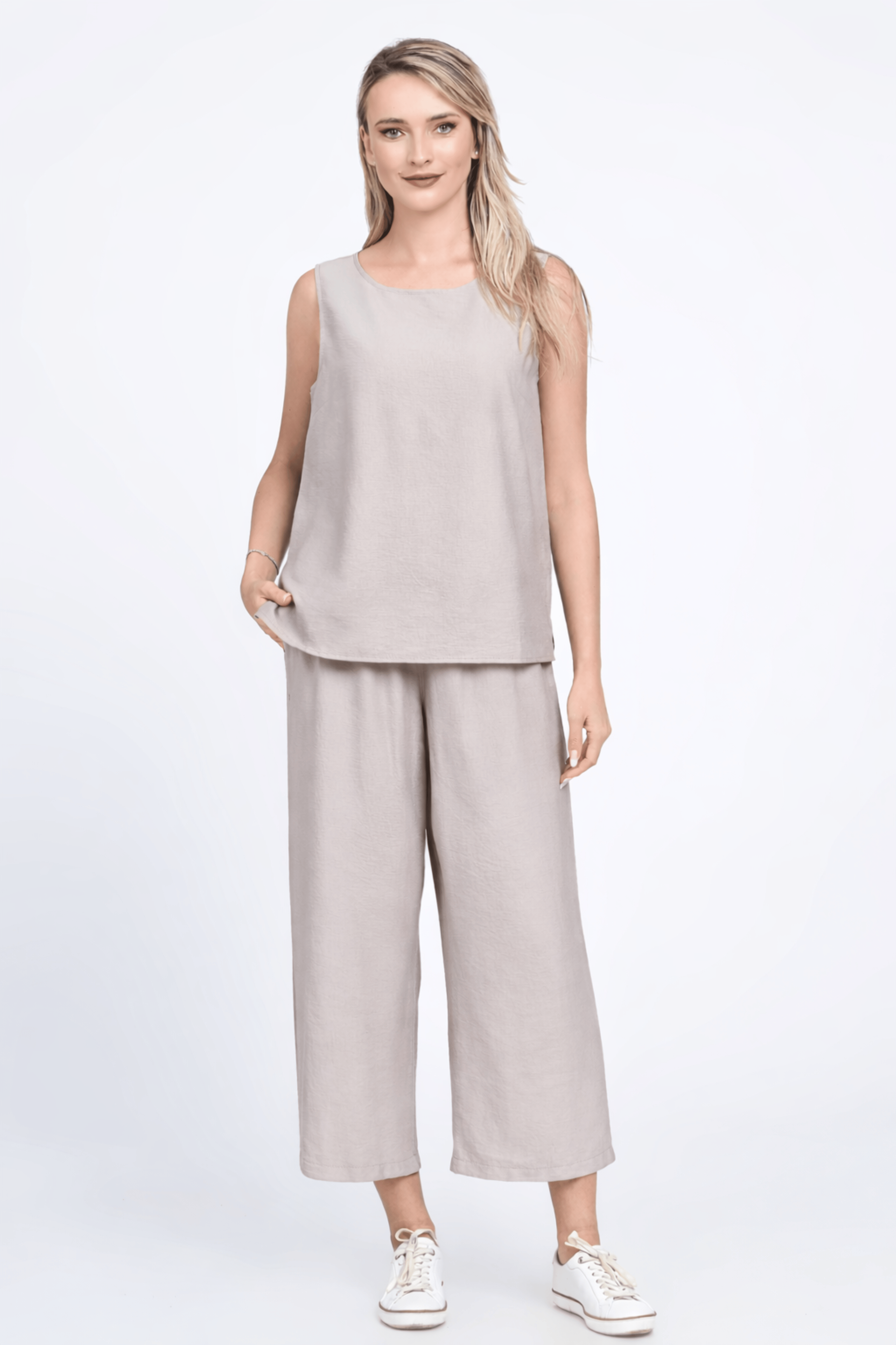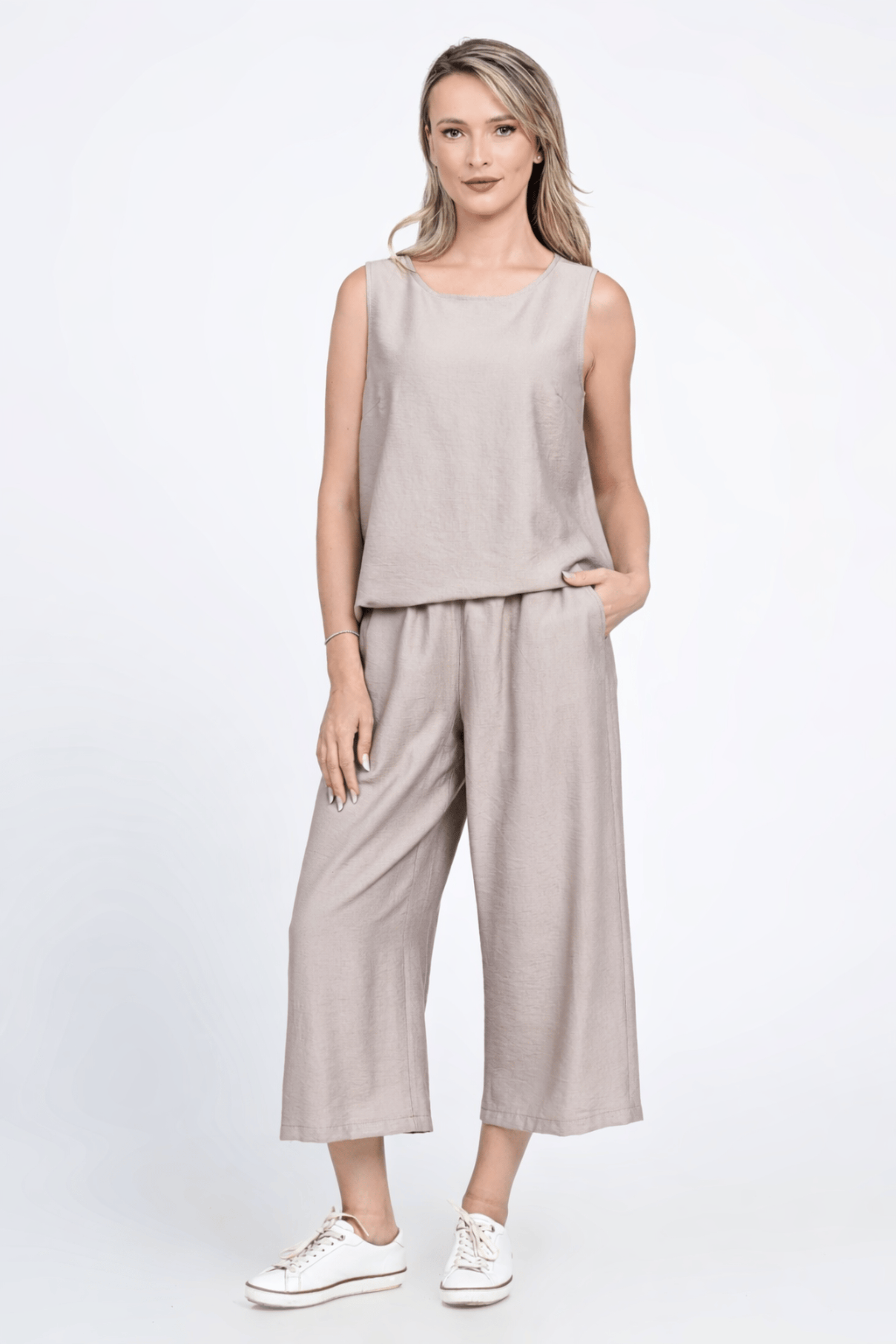 Compleu lejer din viscoza, ideal pt zilele calduroase, un mix perfect intre confort si stil..Topul este simplu, croi in A, cu slituri laterale si decolteu rotund, intr-o culoare neutra (bej taupe).