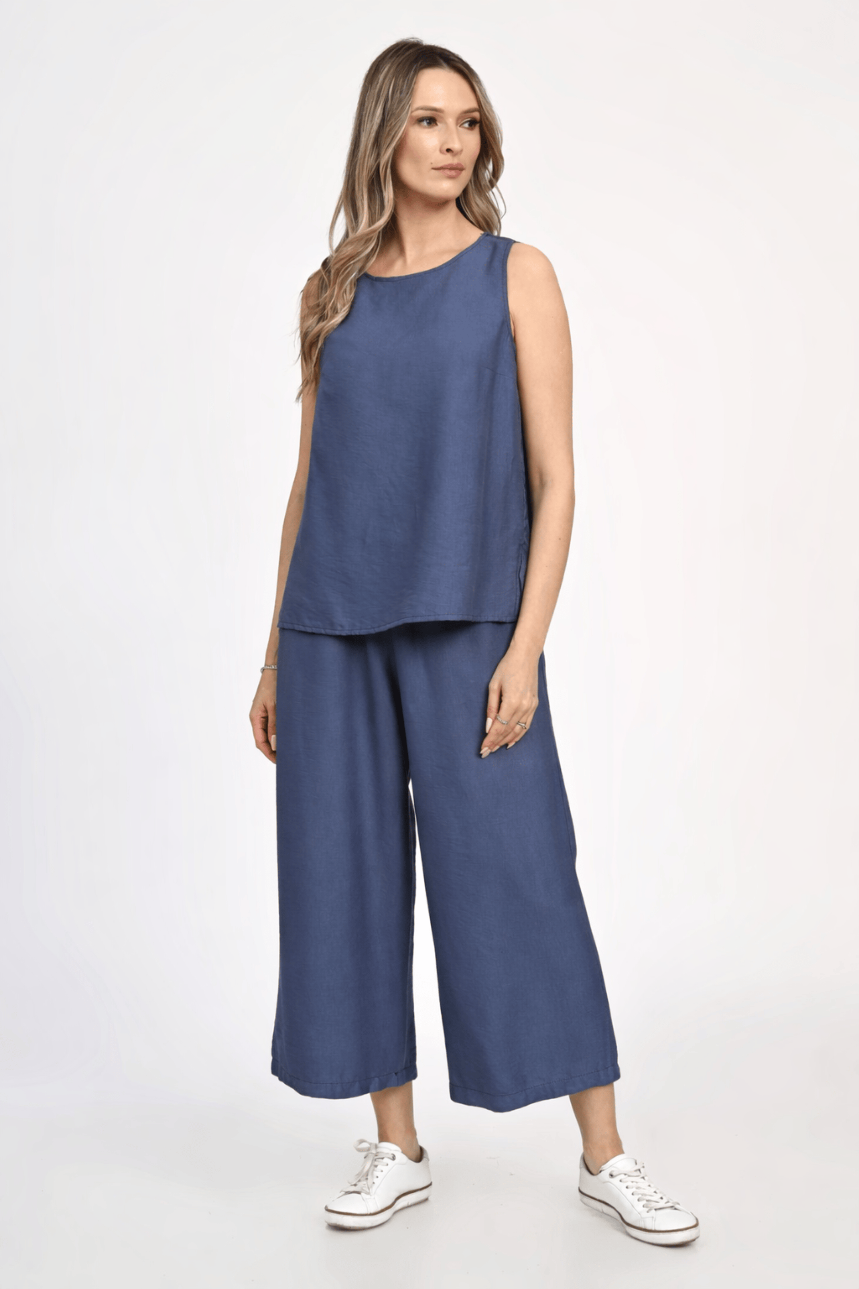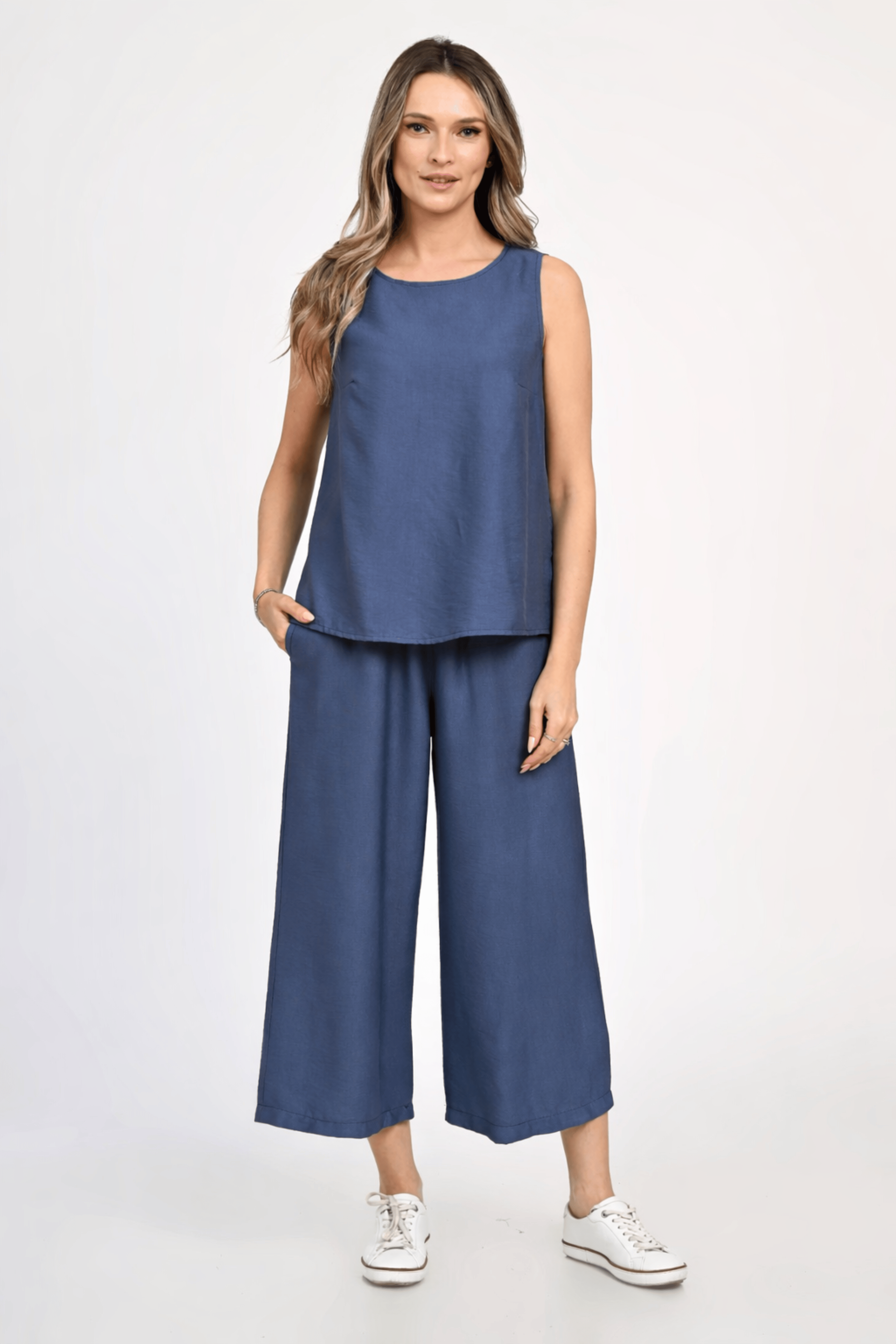 Compleu compus din bluza fara maneci si pantaloni largi 3/4, confectionat dintr-un amestec de viscoza texturata, asemanatoare inului, la fel de racoroasa dar mai fluida.