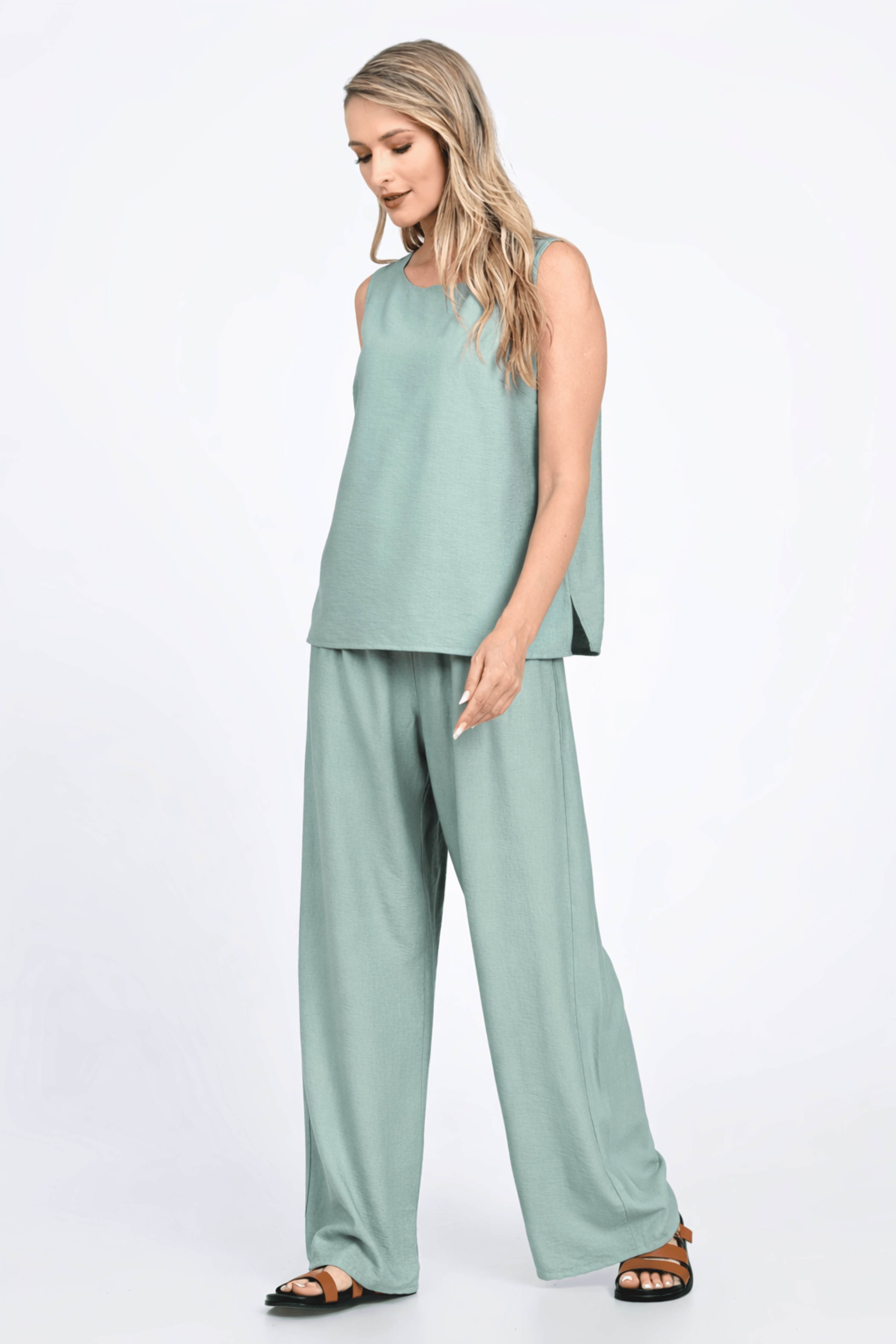 Compleu de vara compus din pantaloni lungi si bluza fara maneci, confectionata dintr-un amestec de viscoza texturata, cu aspect de in, o tesatura naturala, respirabila, perfecta pt anotimpul cald.