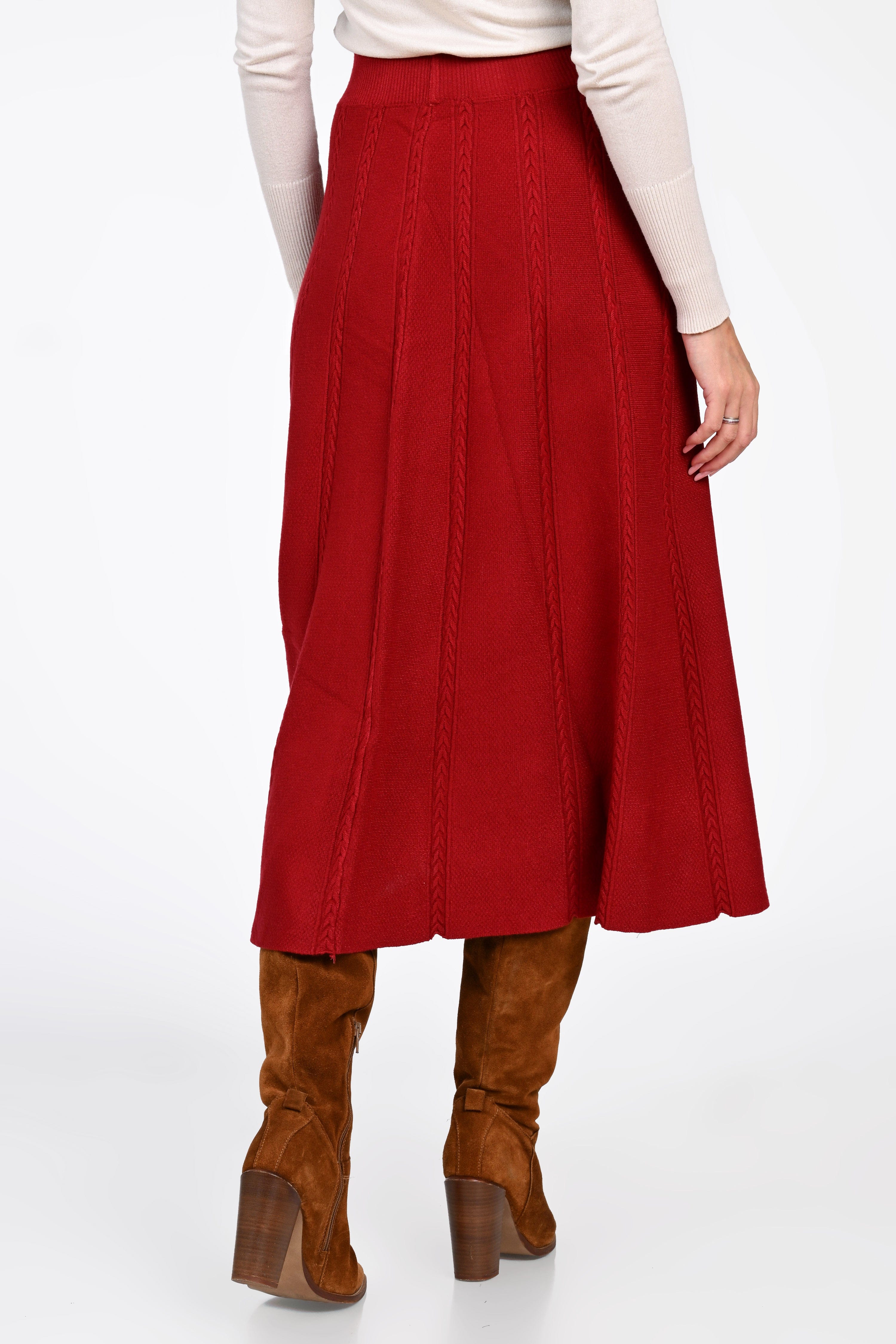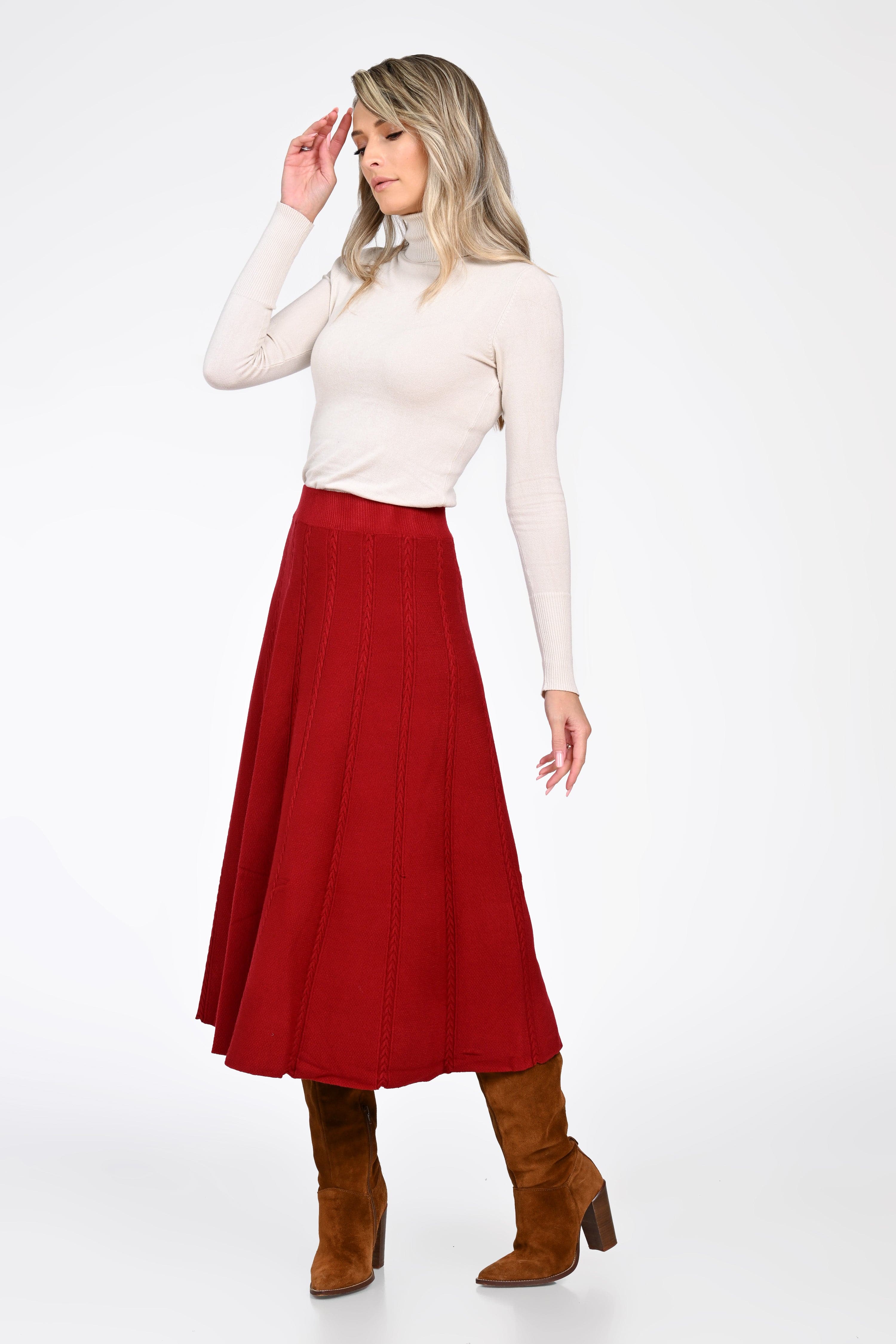 Fusta Adelina este alegerea ideală pentru zilele în care vrei să îmbini confortul cu eleganța. Croită din tricot moale și călduros, cu texturi verticale care alungesc vizual silueta, această fustă midi roșie adaugă feminitate și stil oricărei ținute.