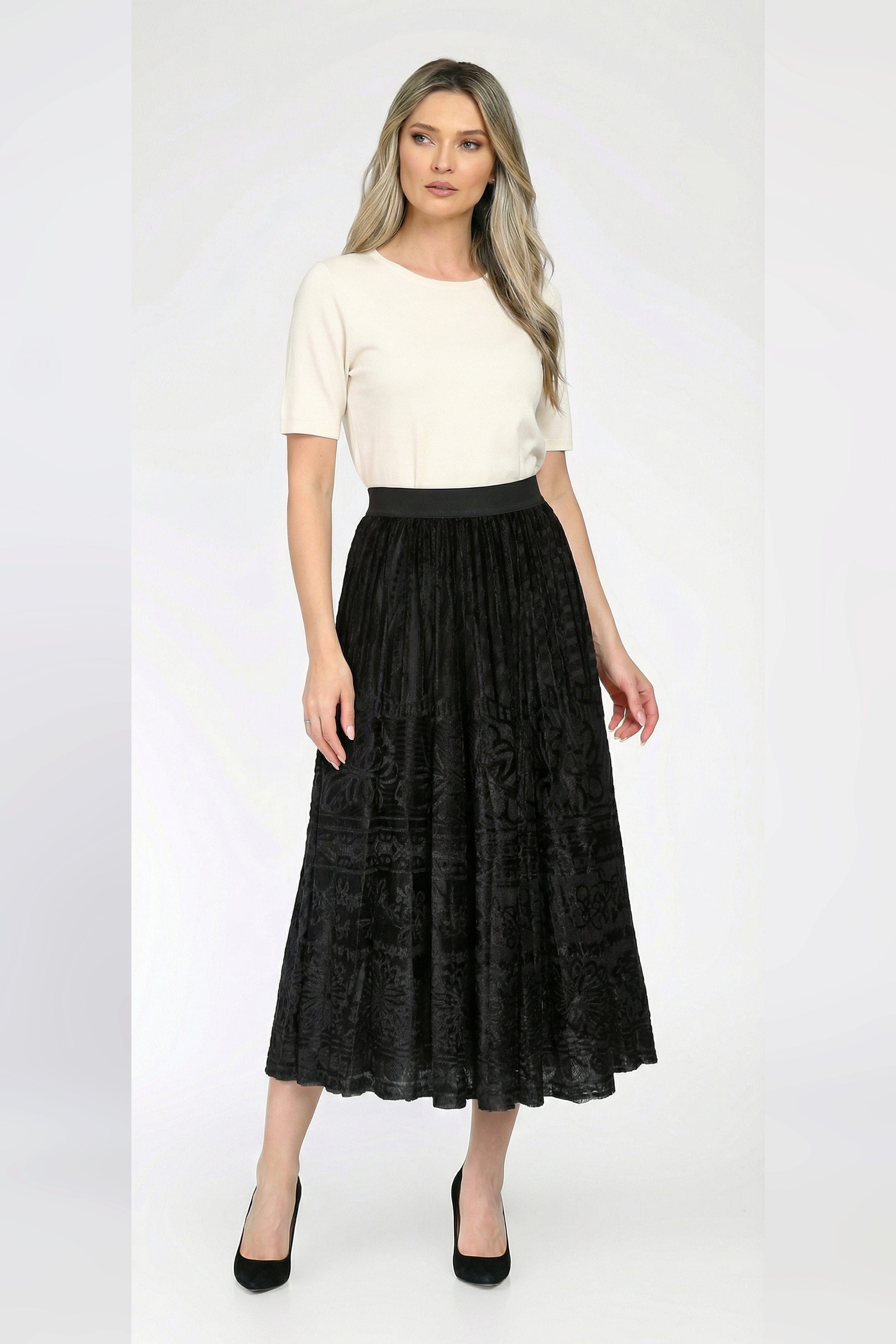 Fusta „Amelia” impresionează prin eleganța sa atemporală și rafinamentul discret al detaliilor. Croiala midi, amplă și fluidă, creează o siluetă feminină și grațioasă, punând în valoare talia datorită beteliei elastice care oferă confort și versatilitate.