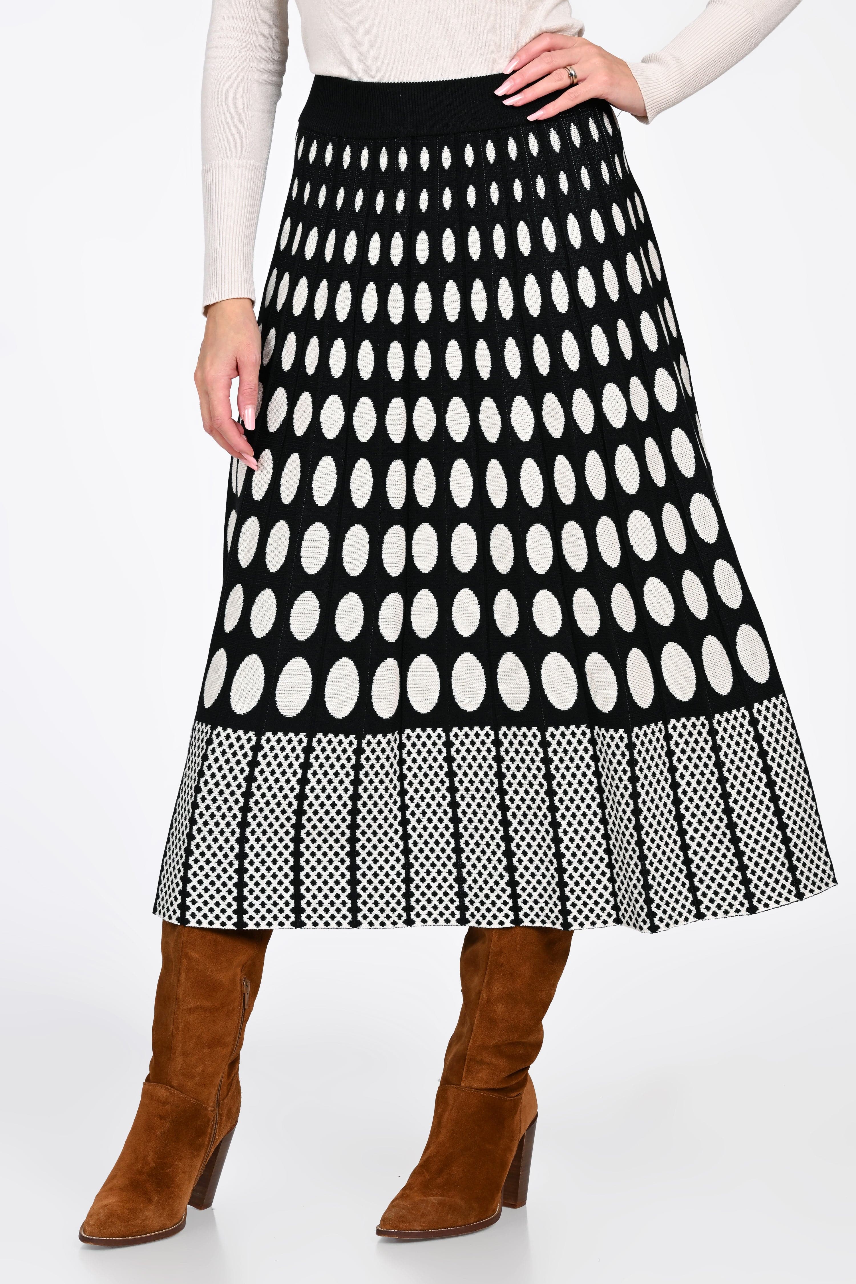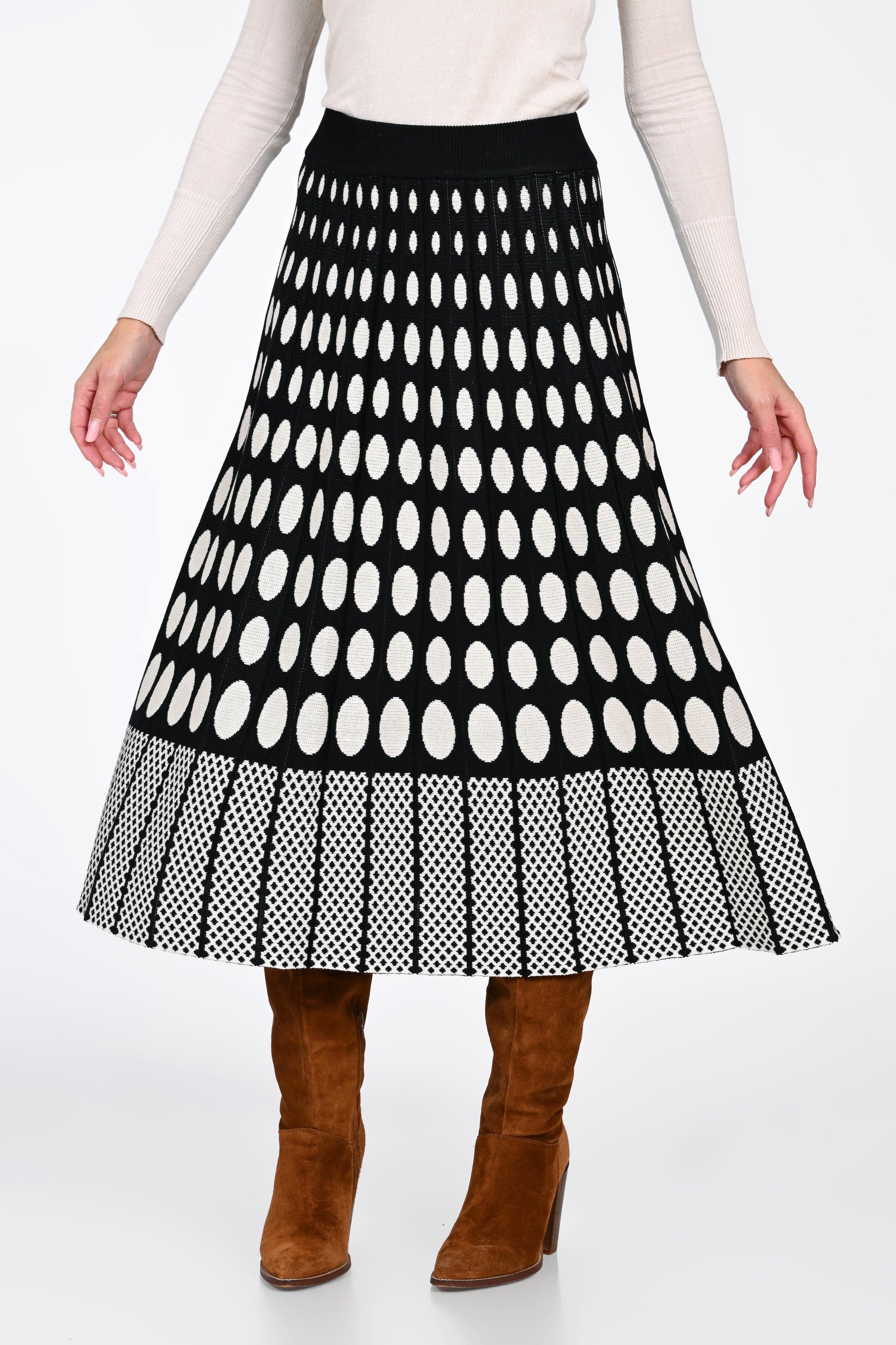 Fusta Leona este creată pentru femeile care adoră piesele statement, pline de personalitate. Construită din tricot fin și elastic, această fustă midi combină negrul intens cu motive grafice albe, rezultând un design modern, elegant și ușor de integrat în ținute de zi sau office.