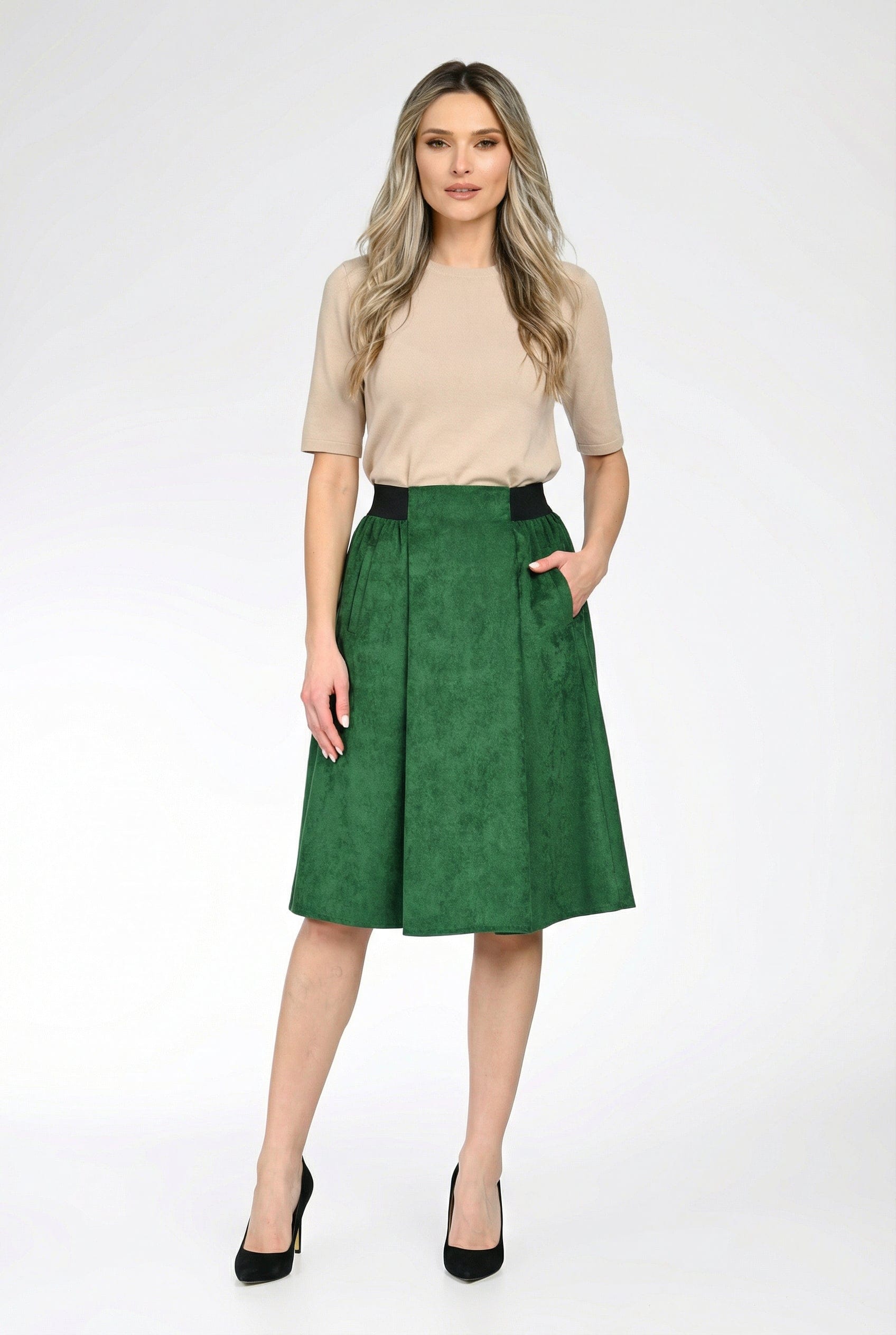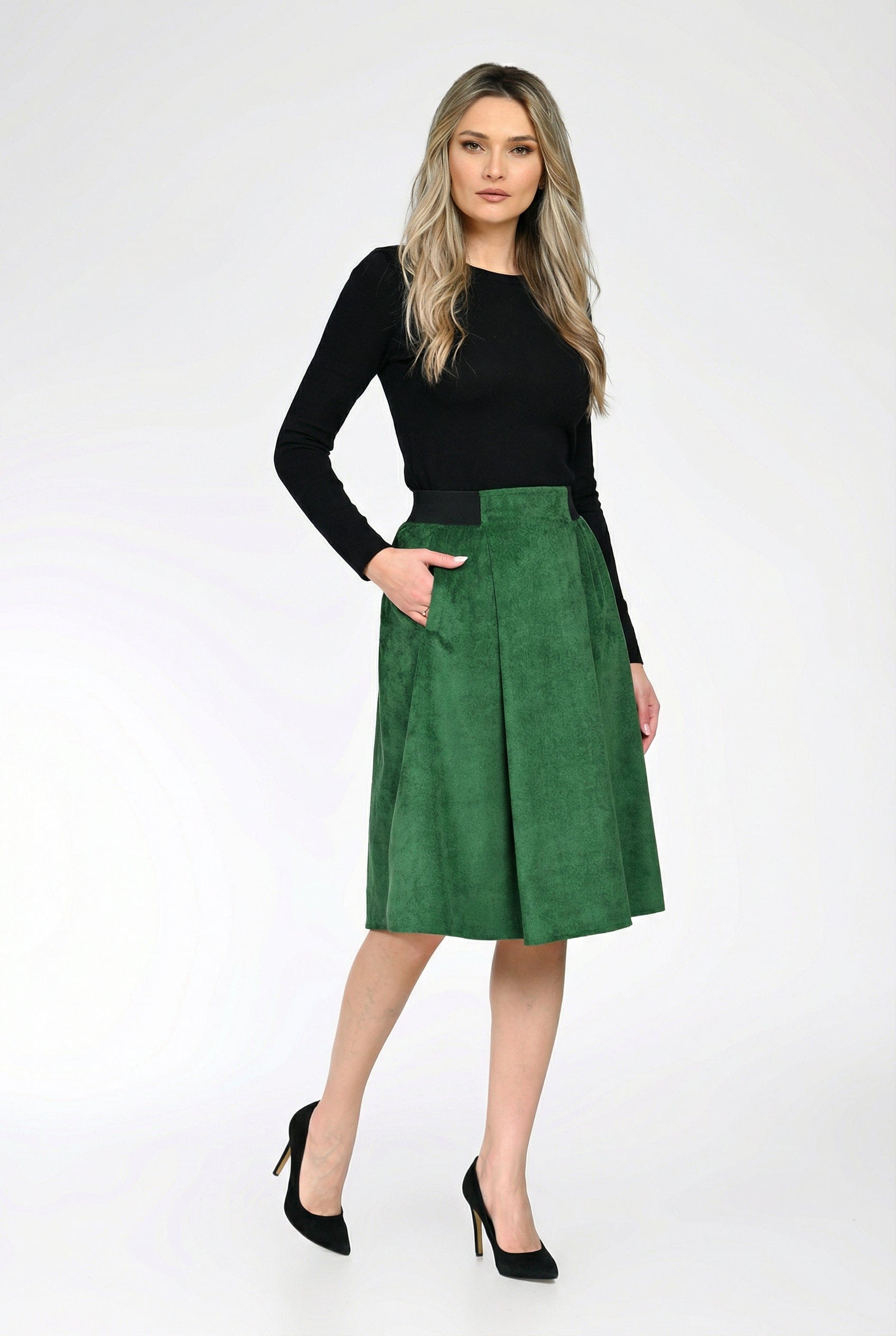 Clara este o fustă midi elegantă, realizată din raiat moale, ideală pentru sezonul rece. Croiala lejeră oferă confort și libertate de mișcare, iar talie elastică asigură o potrivire plăcută pe corp, accentuând discret talia.