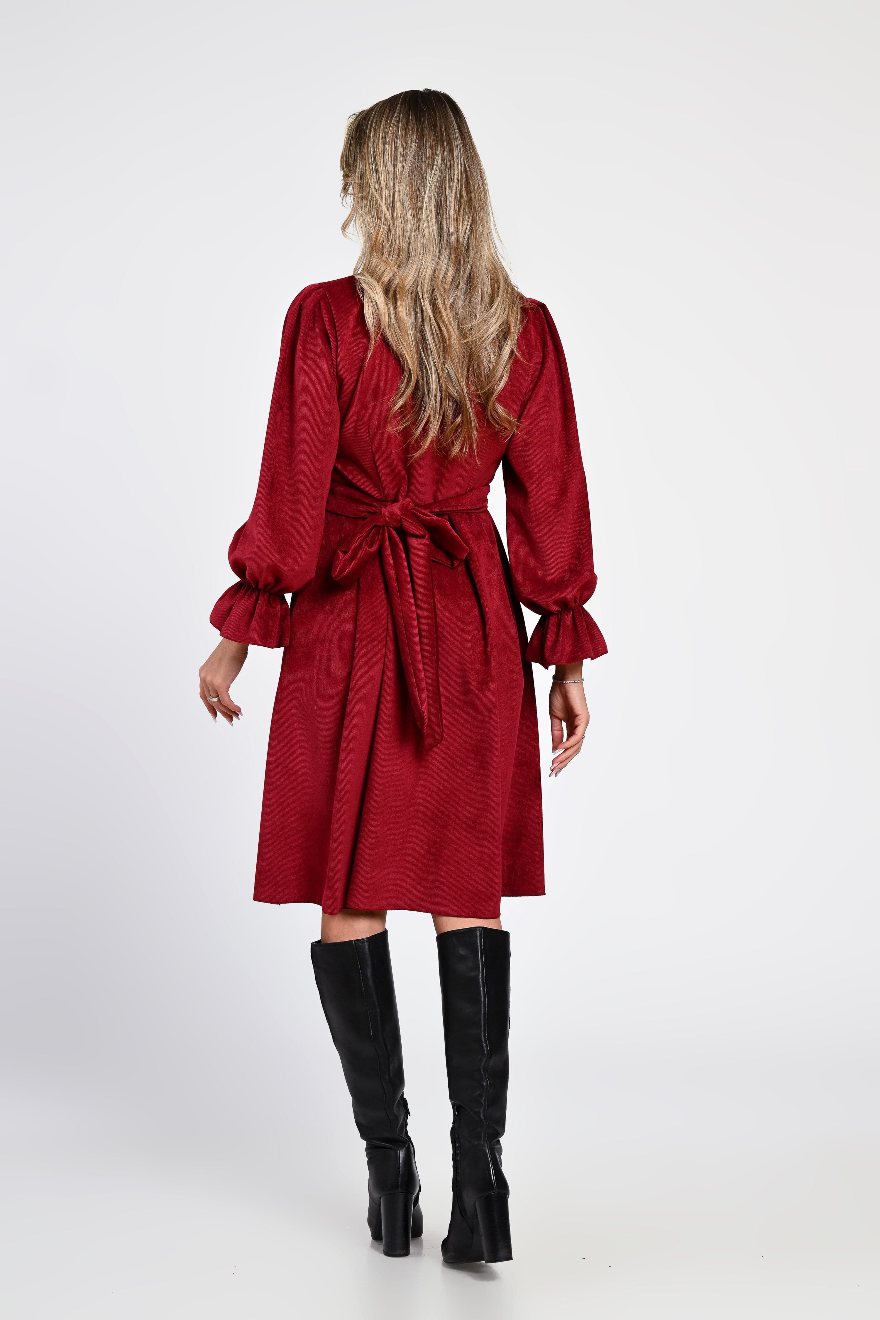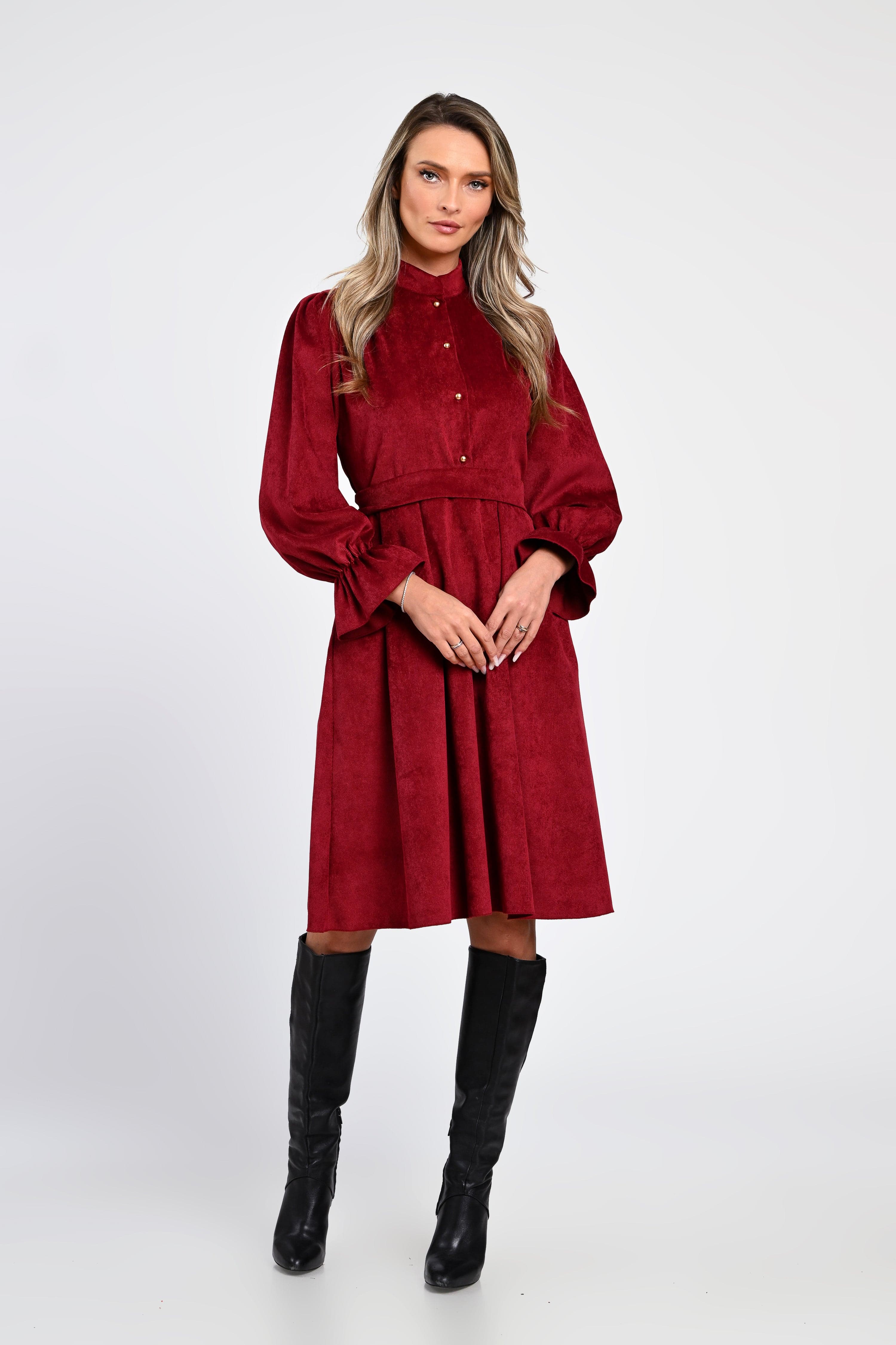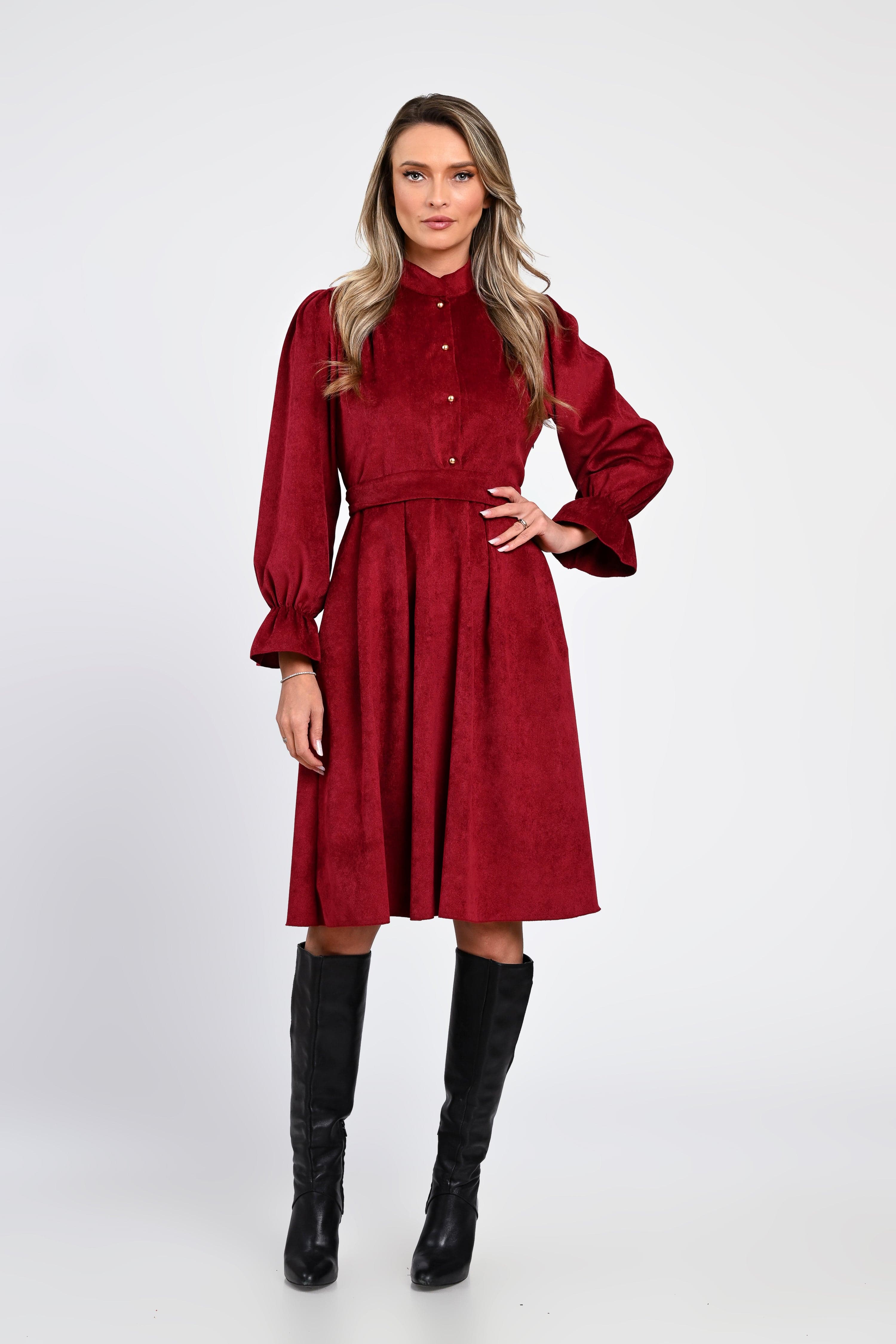 Rochia Eveline îmbină eleganța clasică cu rafinamentul detaliilor moderne. Realizată din material raiat moale și confortabil, această rochie midi impresionează prin croiala feminină și detaliile subtile – gulerul înalt și nasturii decorativi aurii adaugă un aer sofisticat. Mânecile lungi cu manșete ușor bufante și buzunarele laterale sporesc confortul, făcând din acest model o alegere ideală pentru birou sau întâlniri de sezon. Nuanța intensă de bordo aduce un plus de eleganță oricărei ținute.