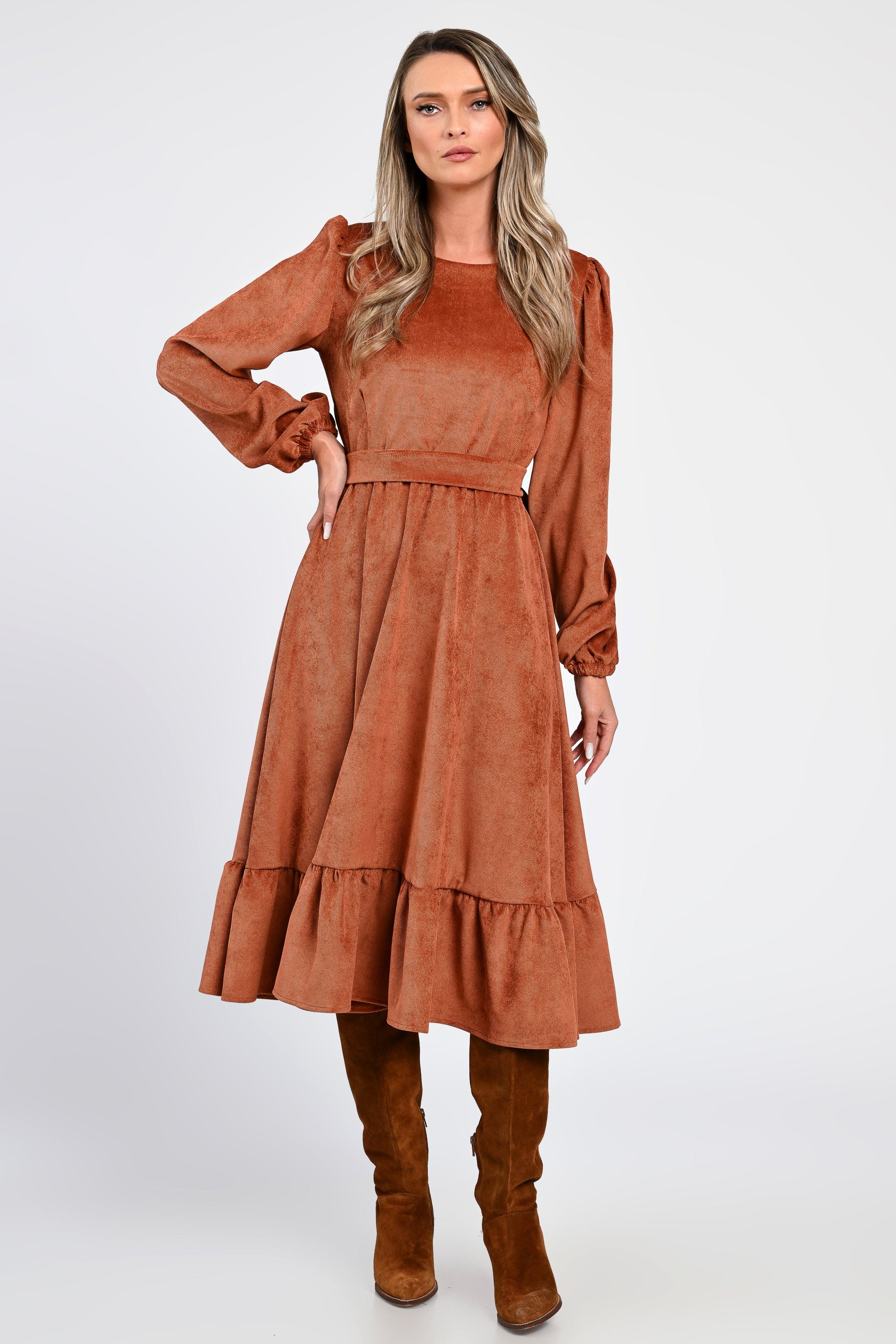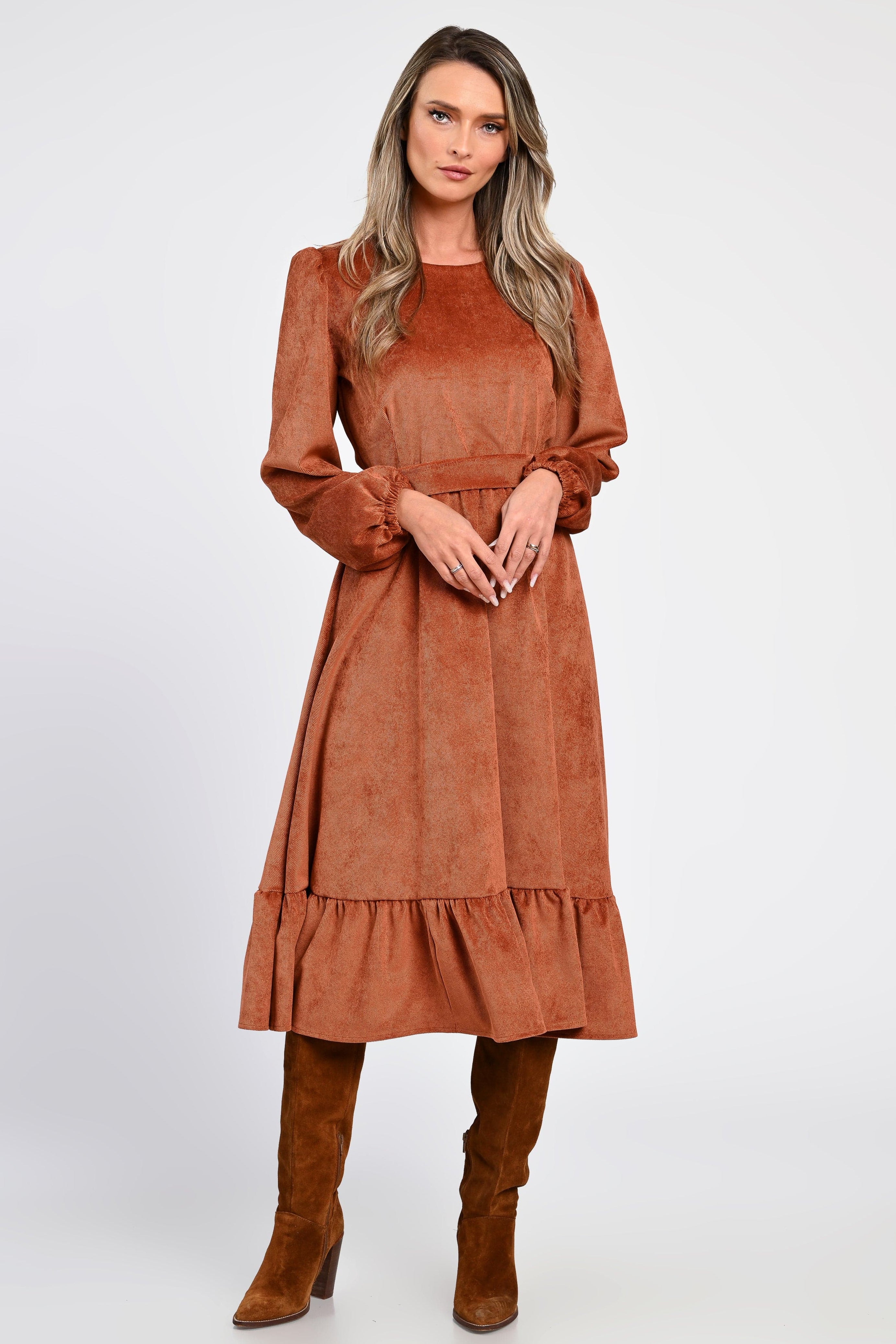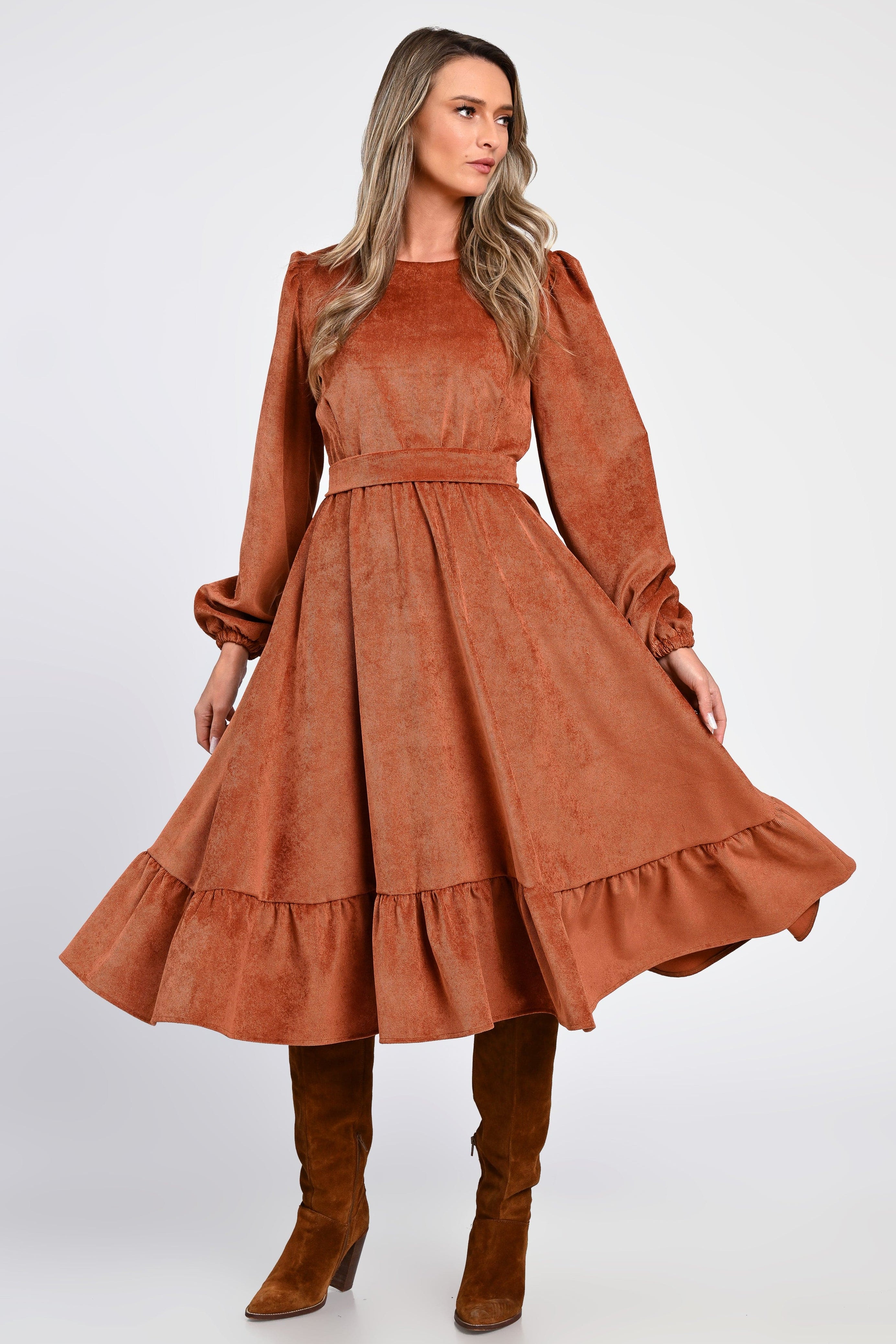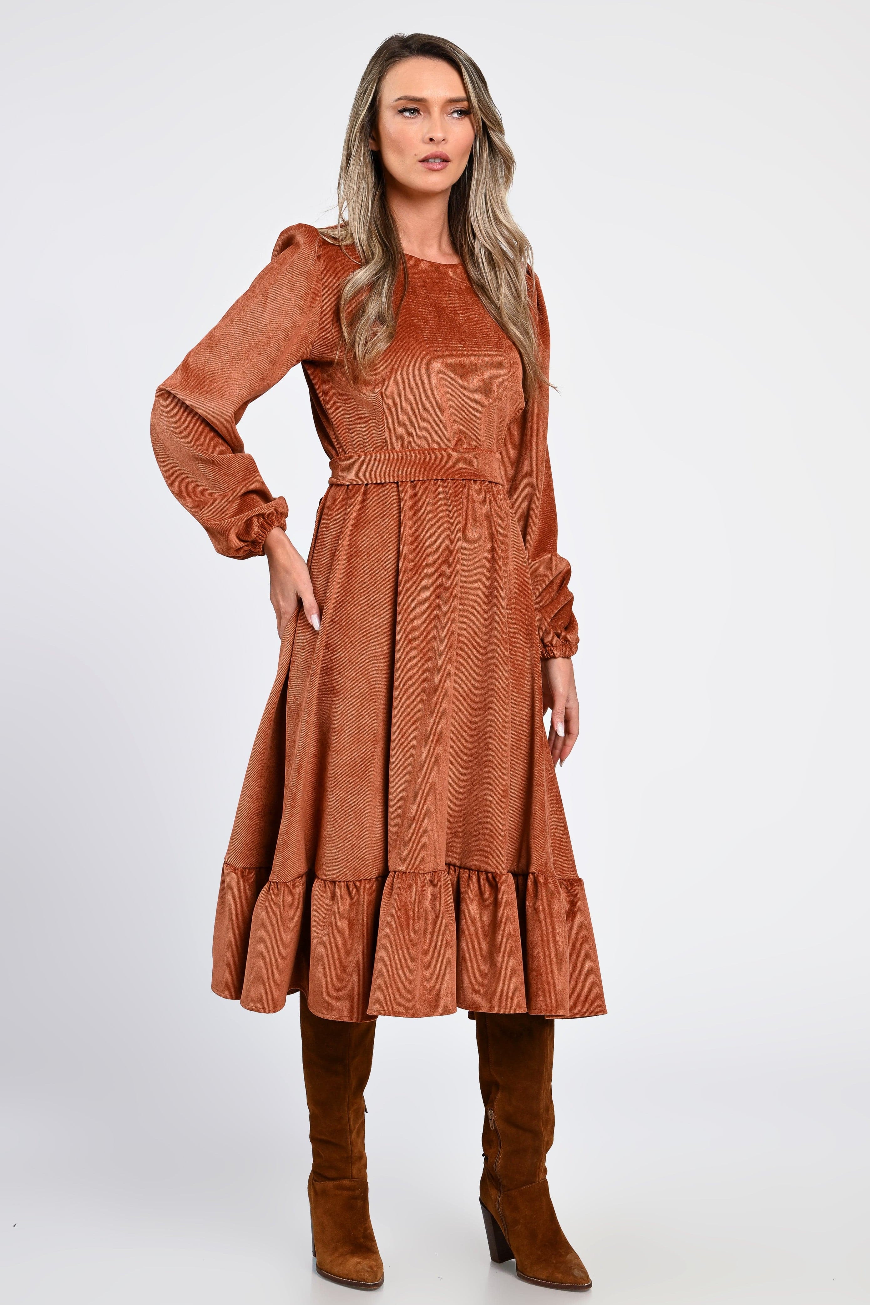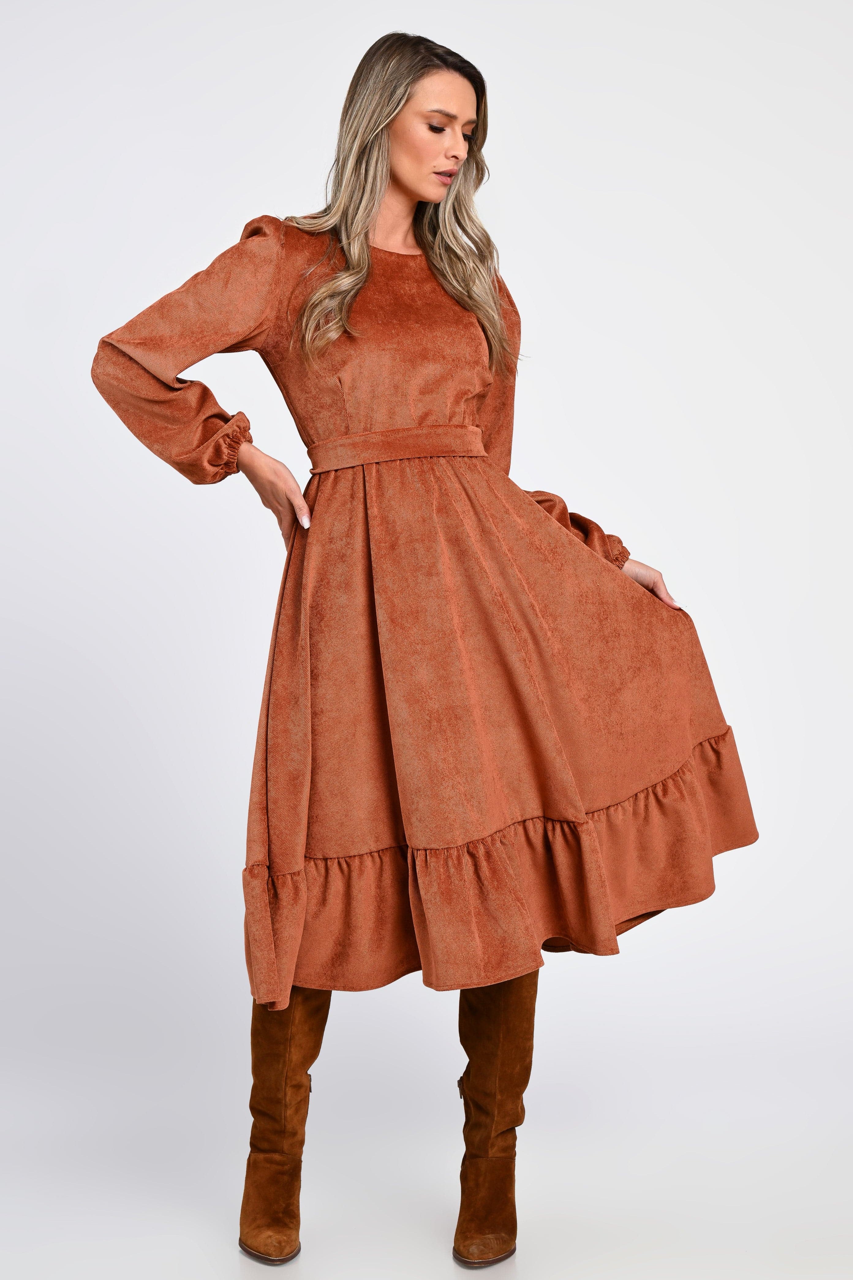 Rochia Irina te învăluie într-o eleganță naturală, cu o textură moale de raiat catifelat și o nuanță caldă de cărămiziu, perfectă pentru zilele aurii ale toamnei.