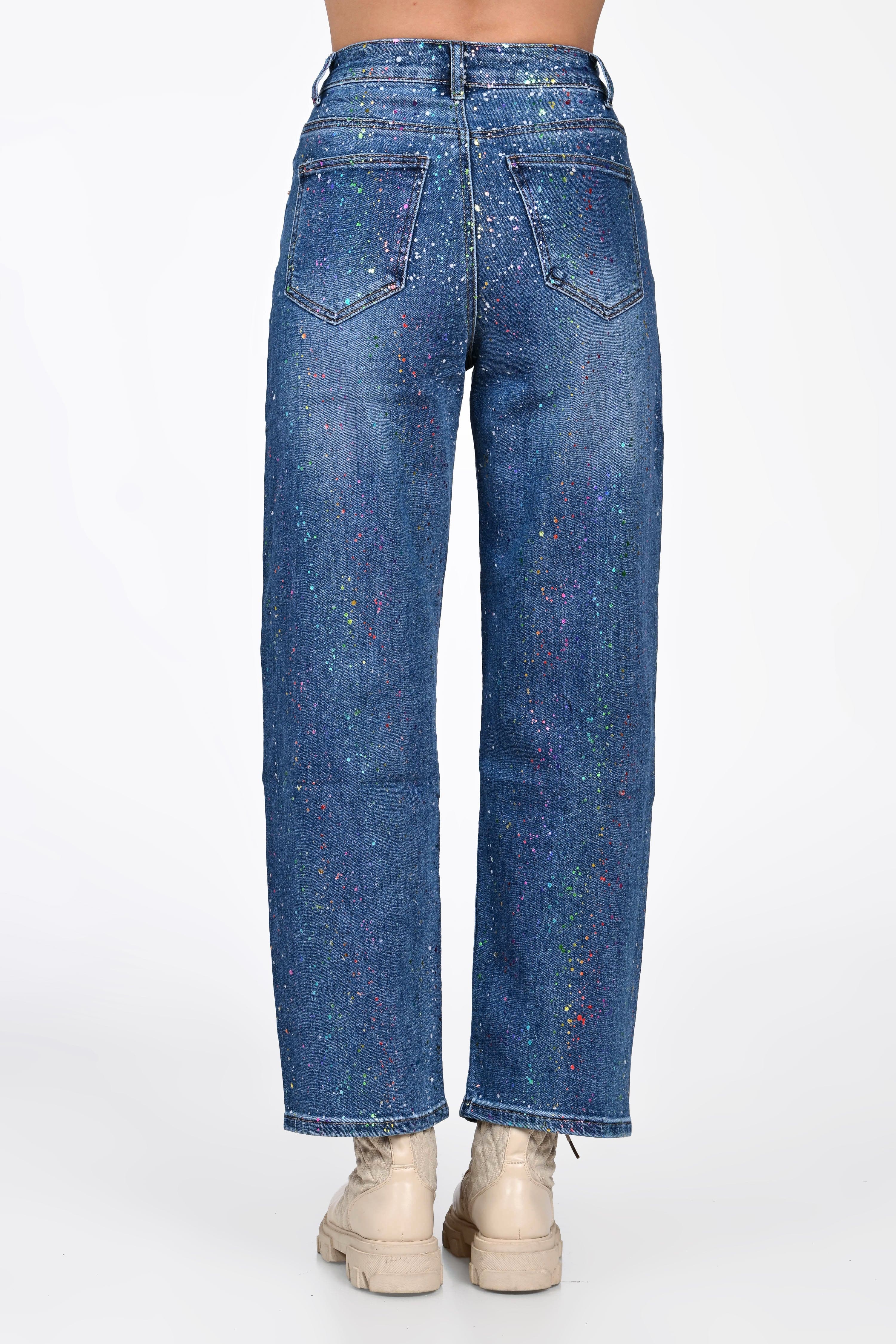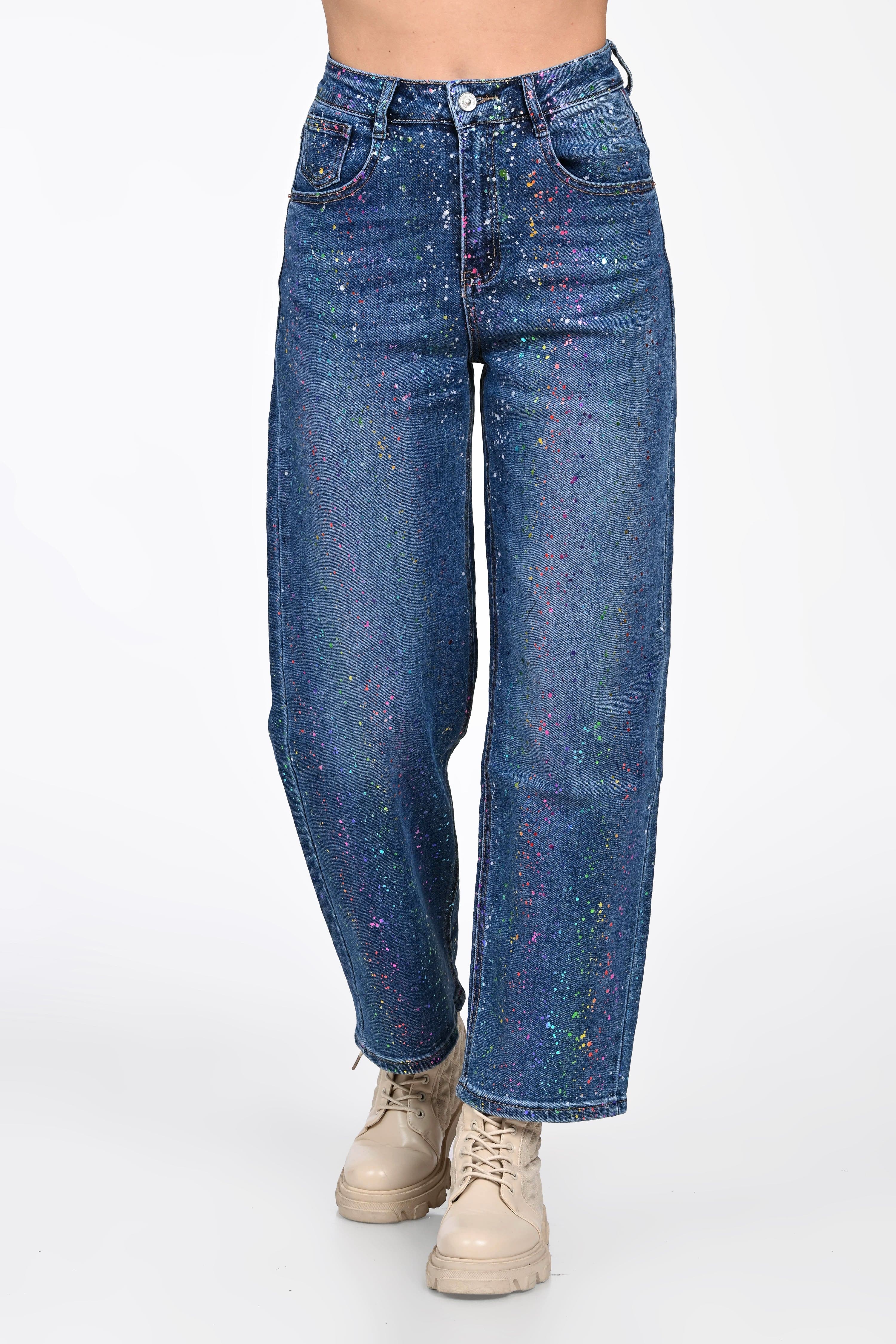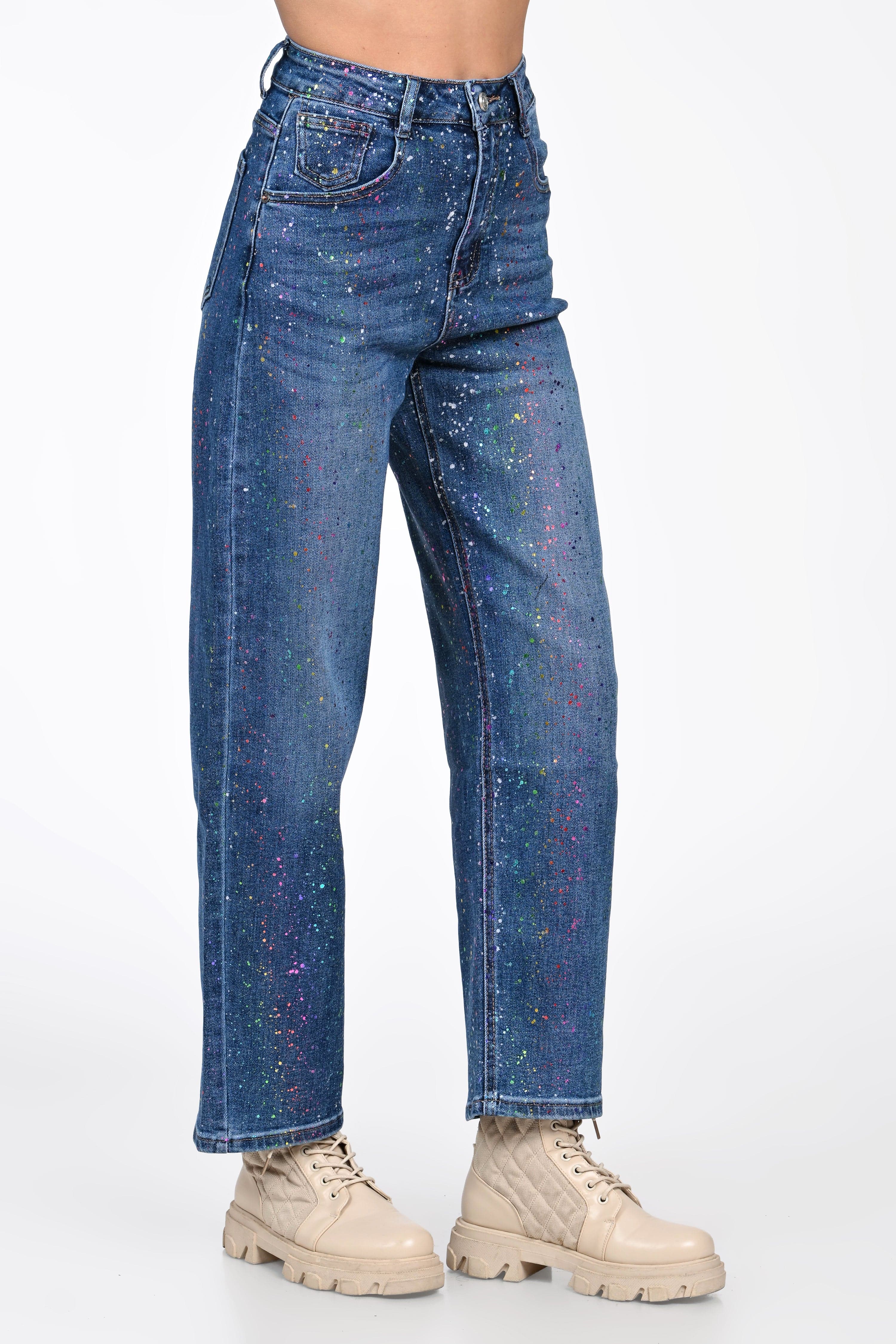 Blugii Maya sunt alegerea ideală pentru femeile care adoră piesele nonconformiste și confortabile. Realizați din denim rezistent, într-o nuanță clasică de albastru închis, acești blugi se remarcă prin efectul artistic de stropi colorați, distribuiți subtil pe întreaga suprafață. Fiecare pereche are un pattern unic, ceea ce îi transformă într-o piesă statement pentru o garderobă modernă.