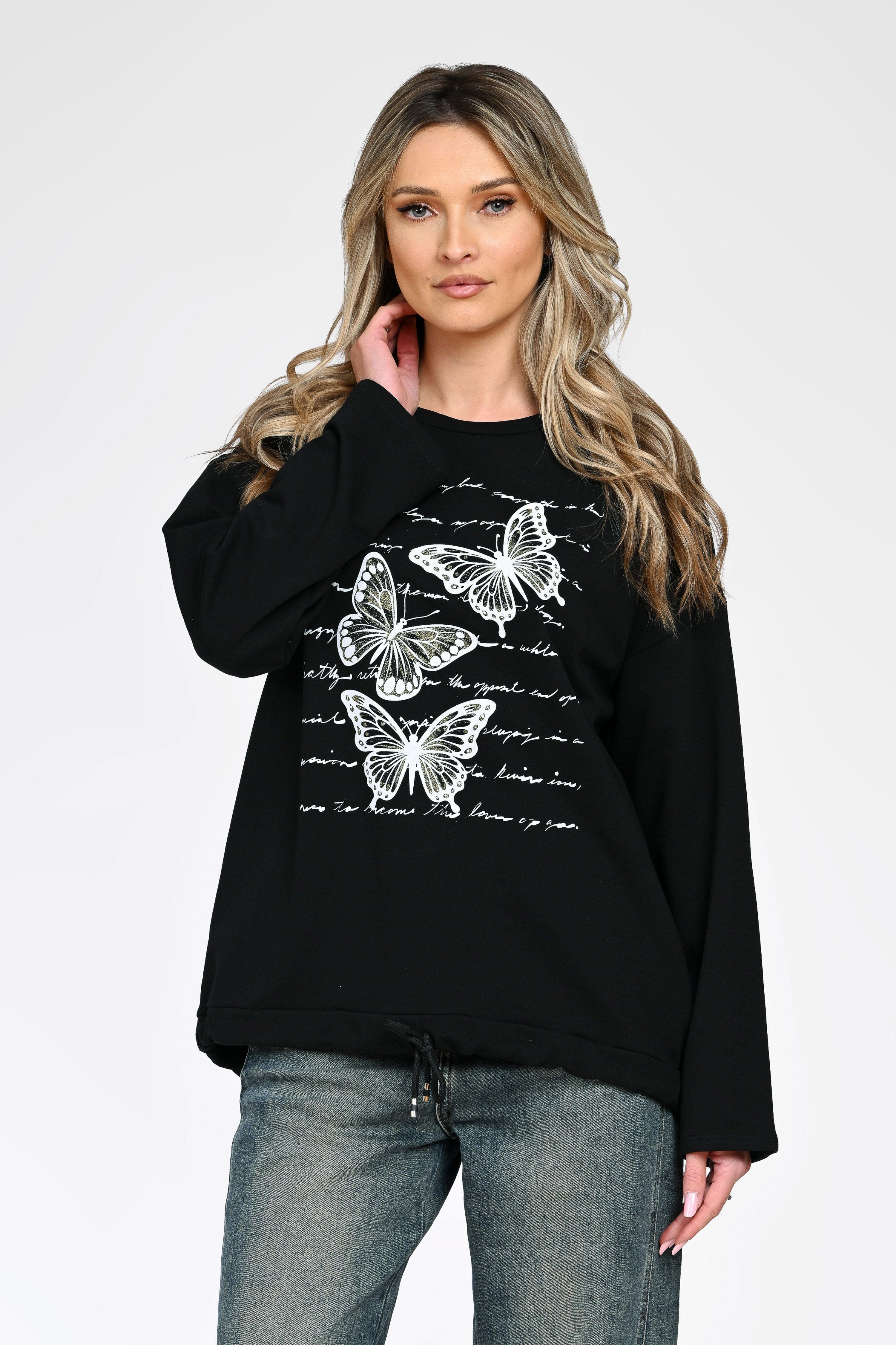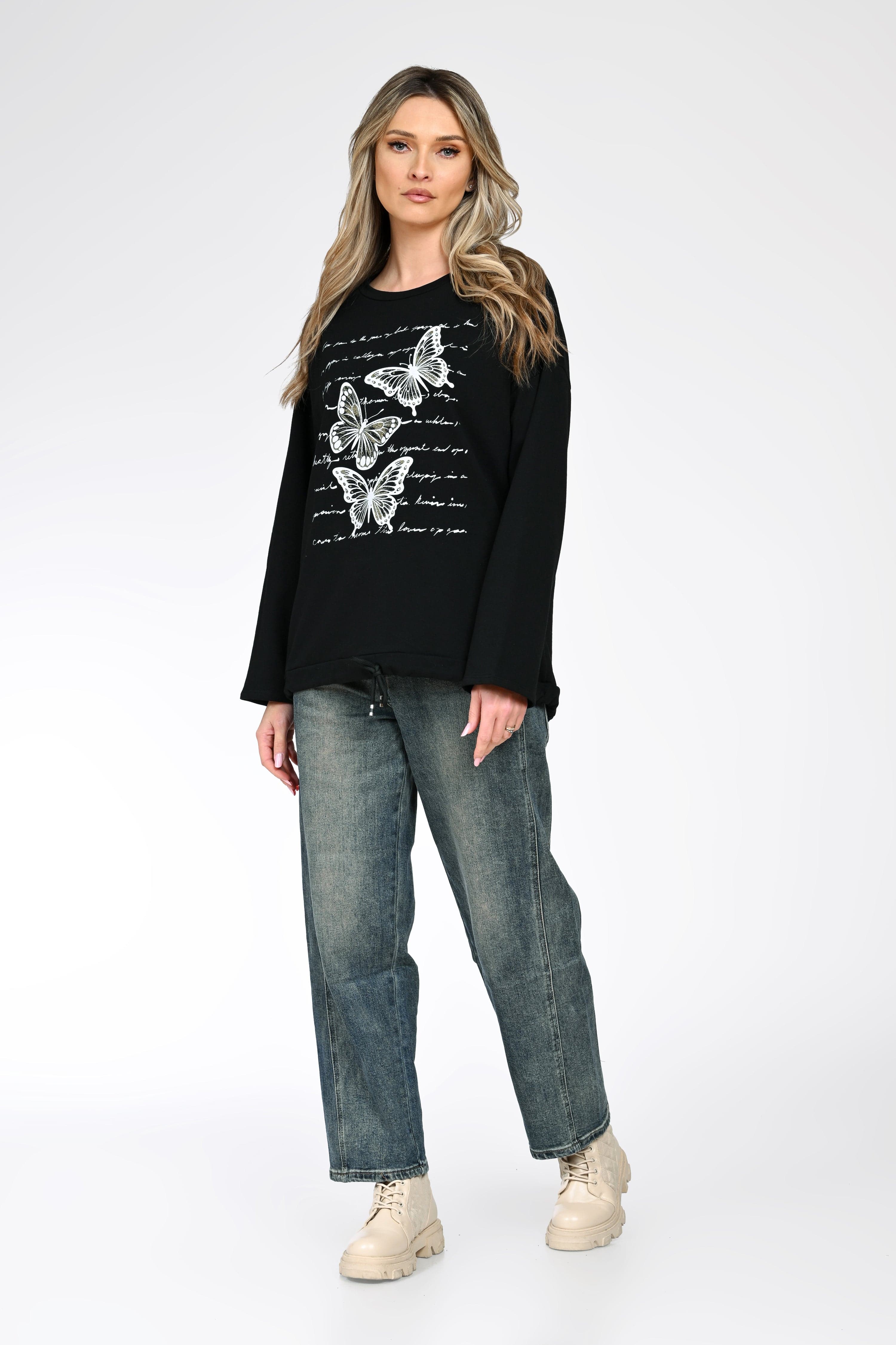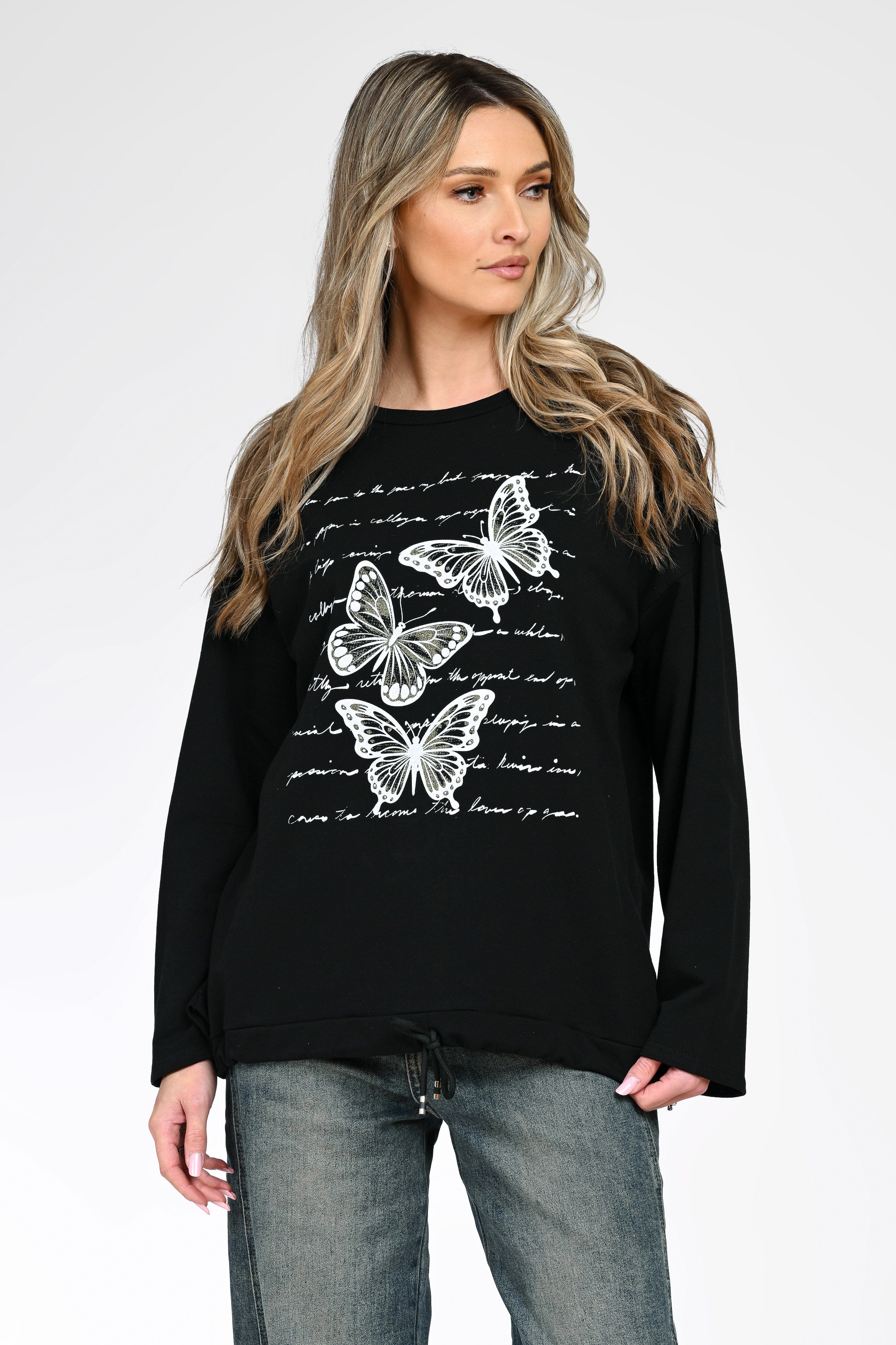 Bluza Livia în nuanță clasică de negru impresionează prin contrastul elegant dintre baza uni și printul alb cu fluturi, completat de elemente grafice tip text. Croiul lejer și mânecile lungi asigură confort sporit, fiind ideală pentru purtare zilnică.