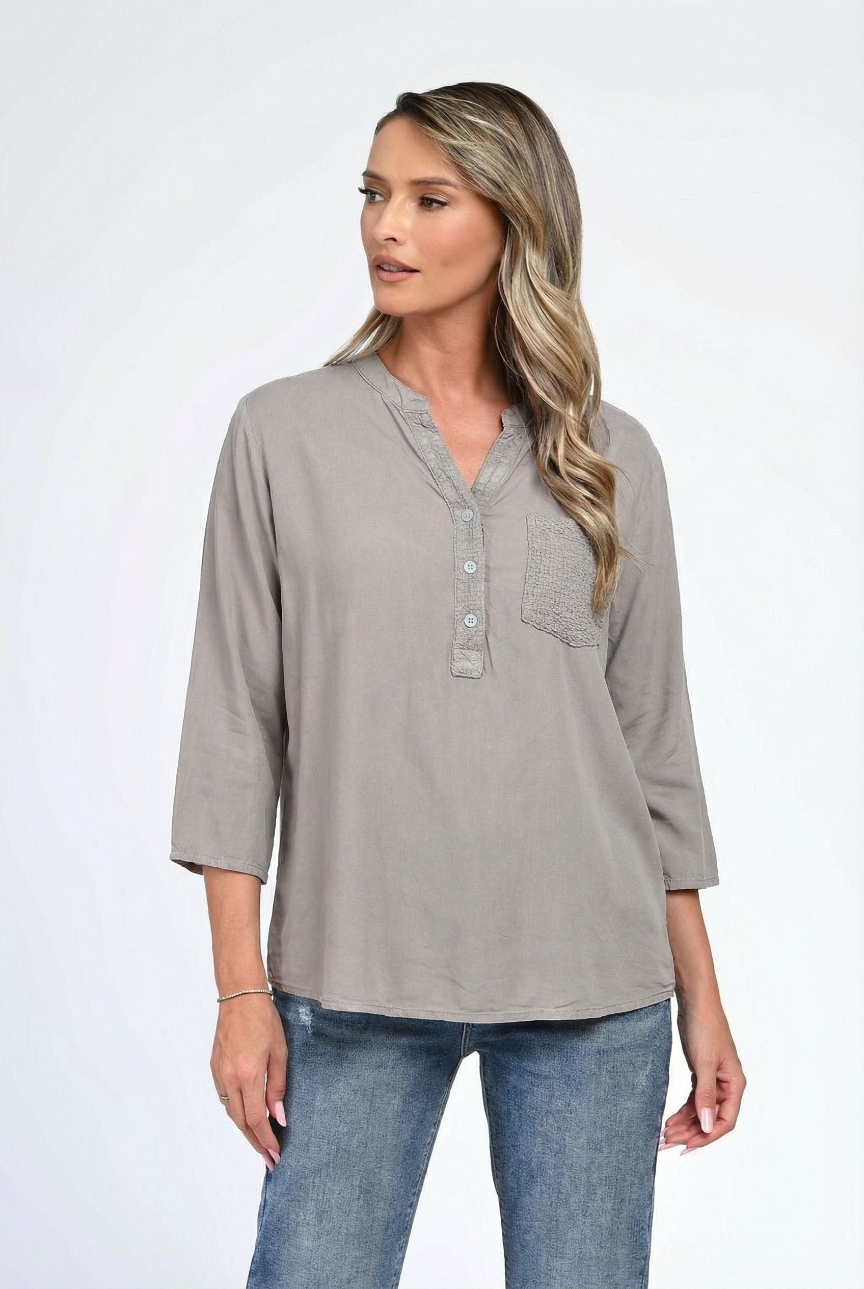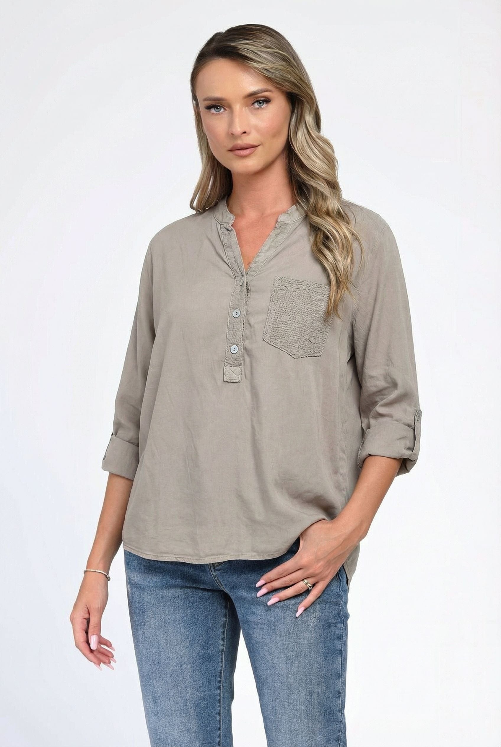 Bluză damă Maya într-o nuanță elegantă de bej taupe, cu croială lejeră și design minimalist, perfect pentru ținute versatile. Decolteul tip tunică, cu nasturi discreți, oferă un aer feminin și modern, iar buzunarul aplicat texturat adaugă un detaliu subtil și rafinat. Mânecile trei sferturi pot fi rulate pentru un plus de confort și stil relaxat. Ideală pentru outfituri casual chic, office lejer sau combinații moderne cu jeanși și pantaloni conici.