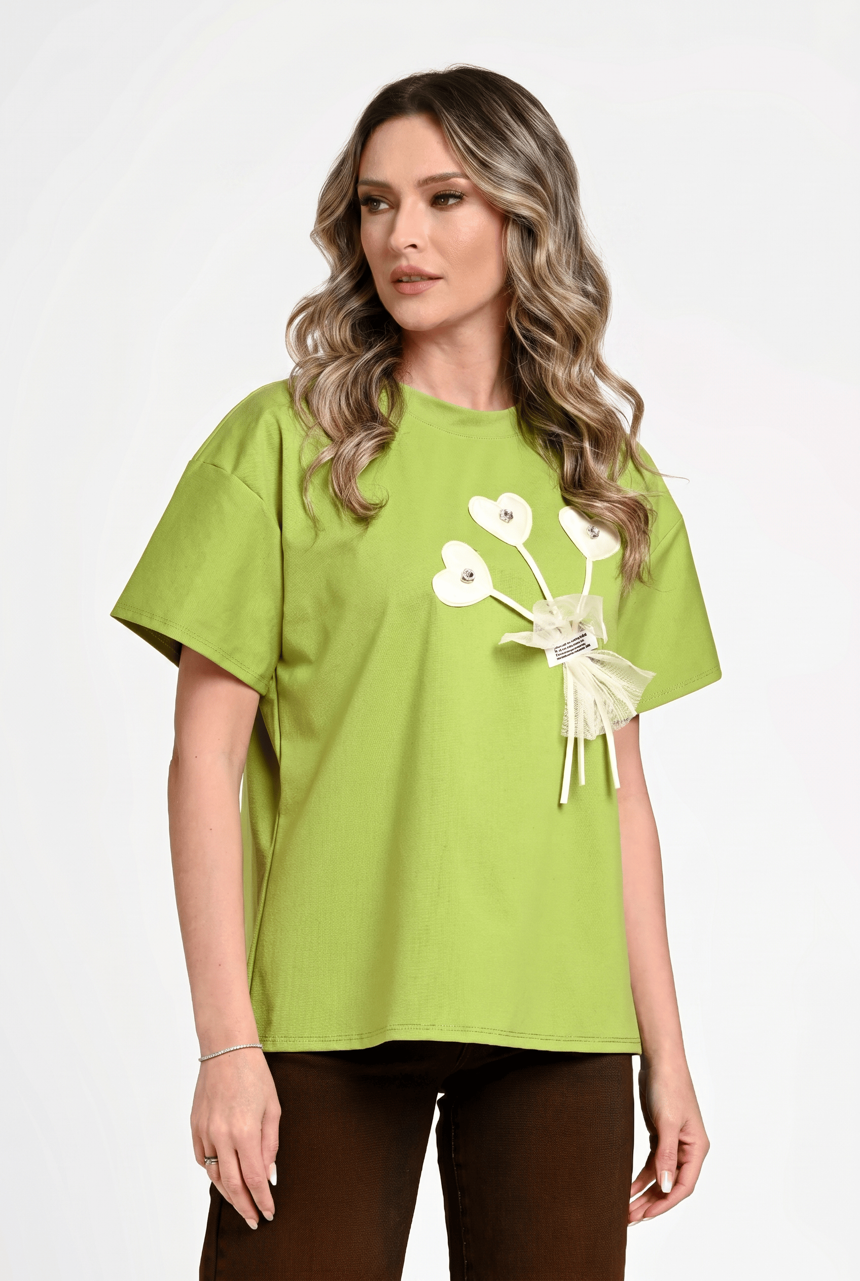 Bluză damă Andra este o piesă modernă și feminină, perfectă pentru un look fresh și relaxat. Realizată într-o nuanță vibrantă de verde lime, această bluză se evidențiază prin aplicația decorativă cu inimioare și detalii delicate din tull, care adaugă un aer romantic și original. Croiala lejeră și mânecile scurte oferă confort și libertate de mișcare, fiind ideală pentru ținute casual chic. Se asortează ușor cu pantaloni sau jeanși pentru un outfit stilat și actual.