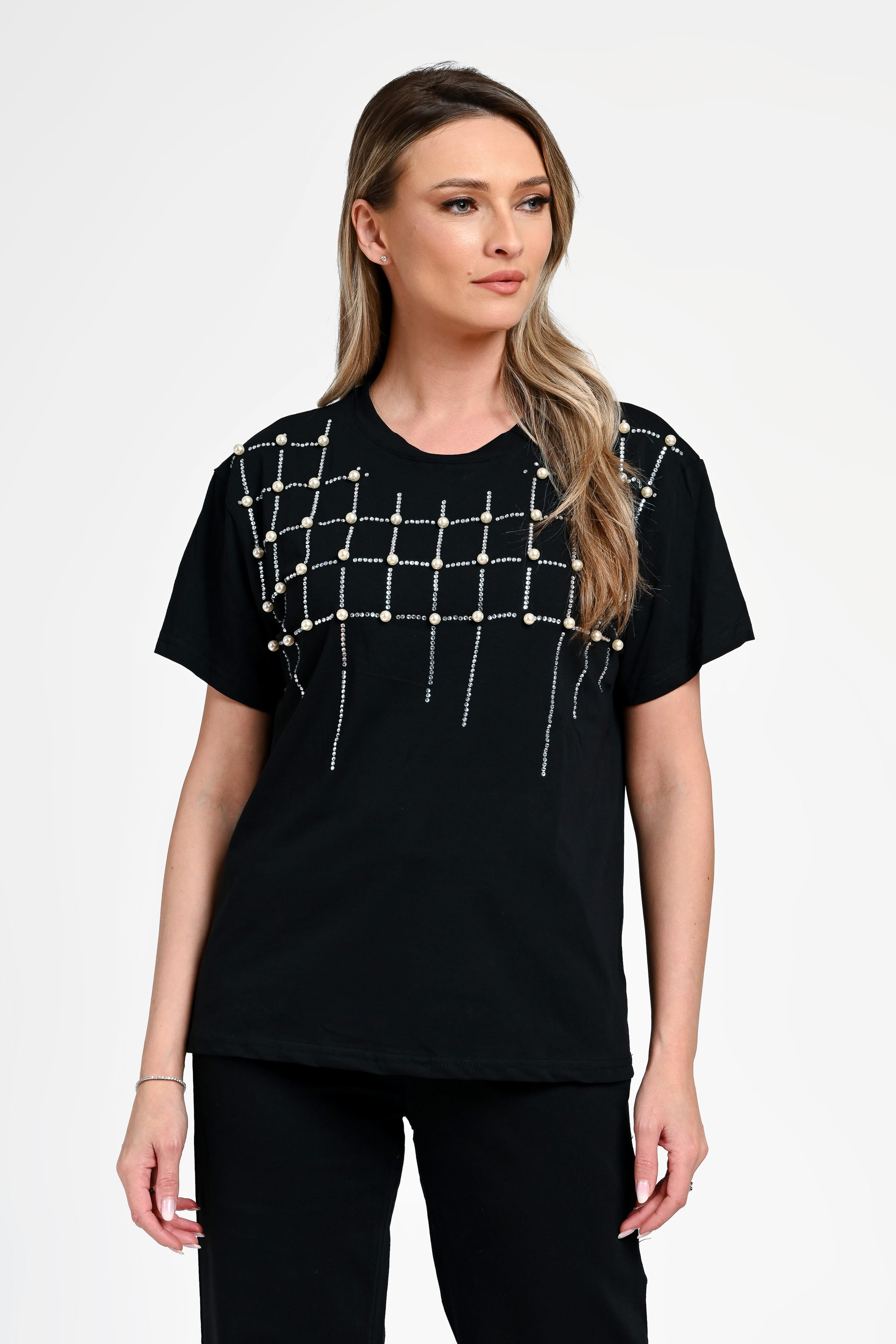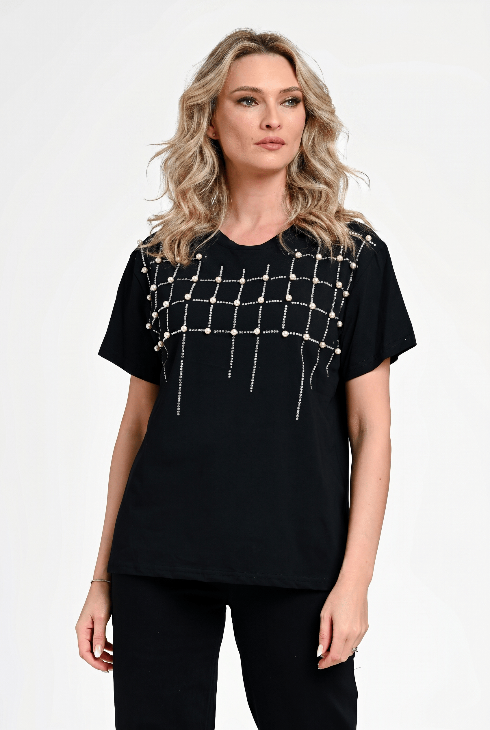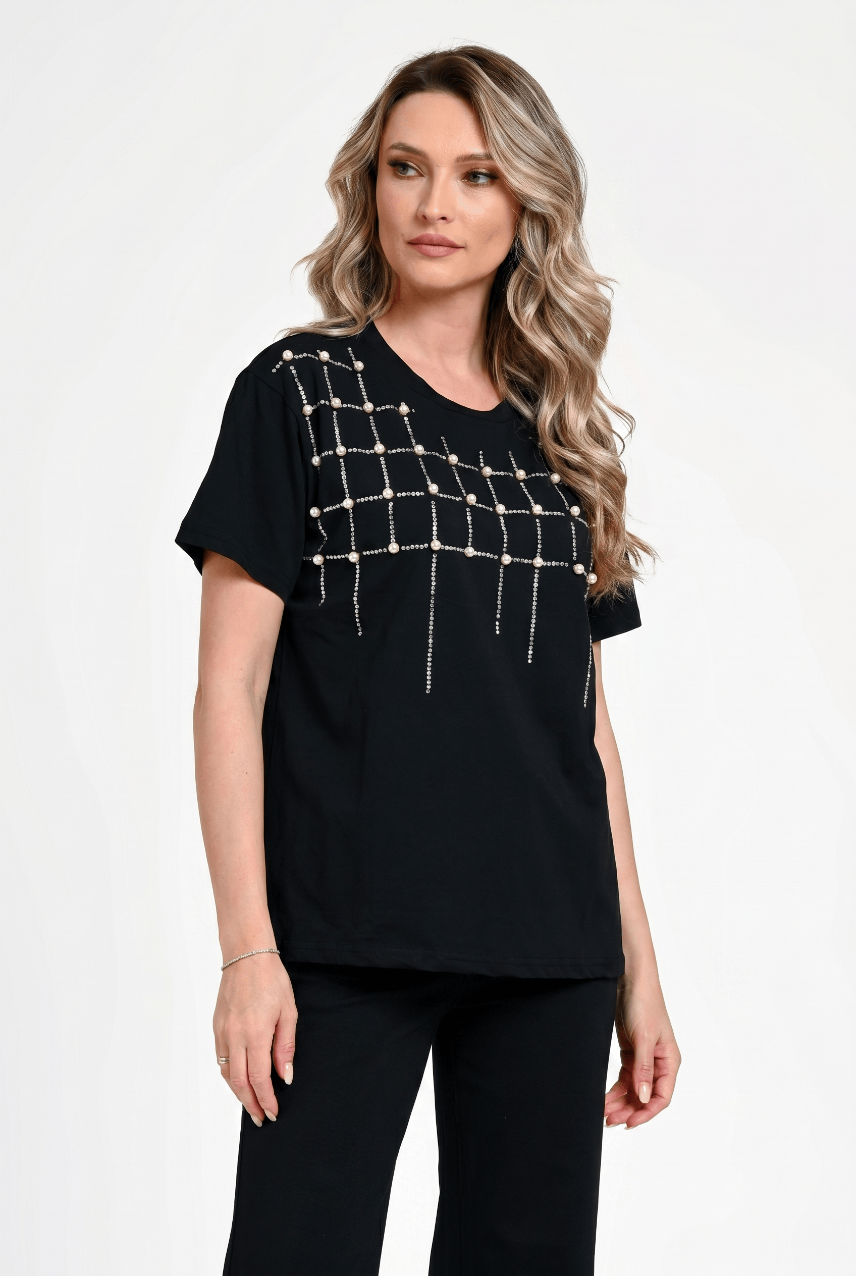 Bluză damă Bianca este o piesă sofisticată, perfectă pentru ținute elegante sau casual-chic. Realizată într-o nuanță clasică de negru, această bluză impresionează prin aplicațiile decorative din perle și strasuri, dispuse într-un model geometric modern, ce adaugă un efect vizual rafinat. Croiala lejeră și mânecile scurte oferă confort, iar designul versatil permite integrarea ușoară în diverse outfituri. Ideală pentru a adăuga un plus de stil oricărei ținute.