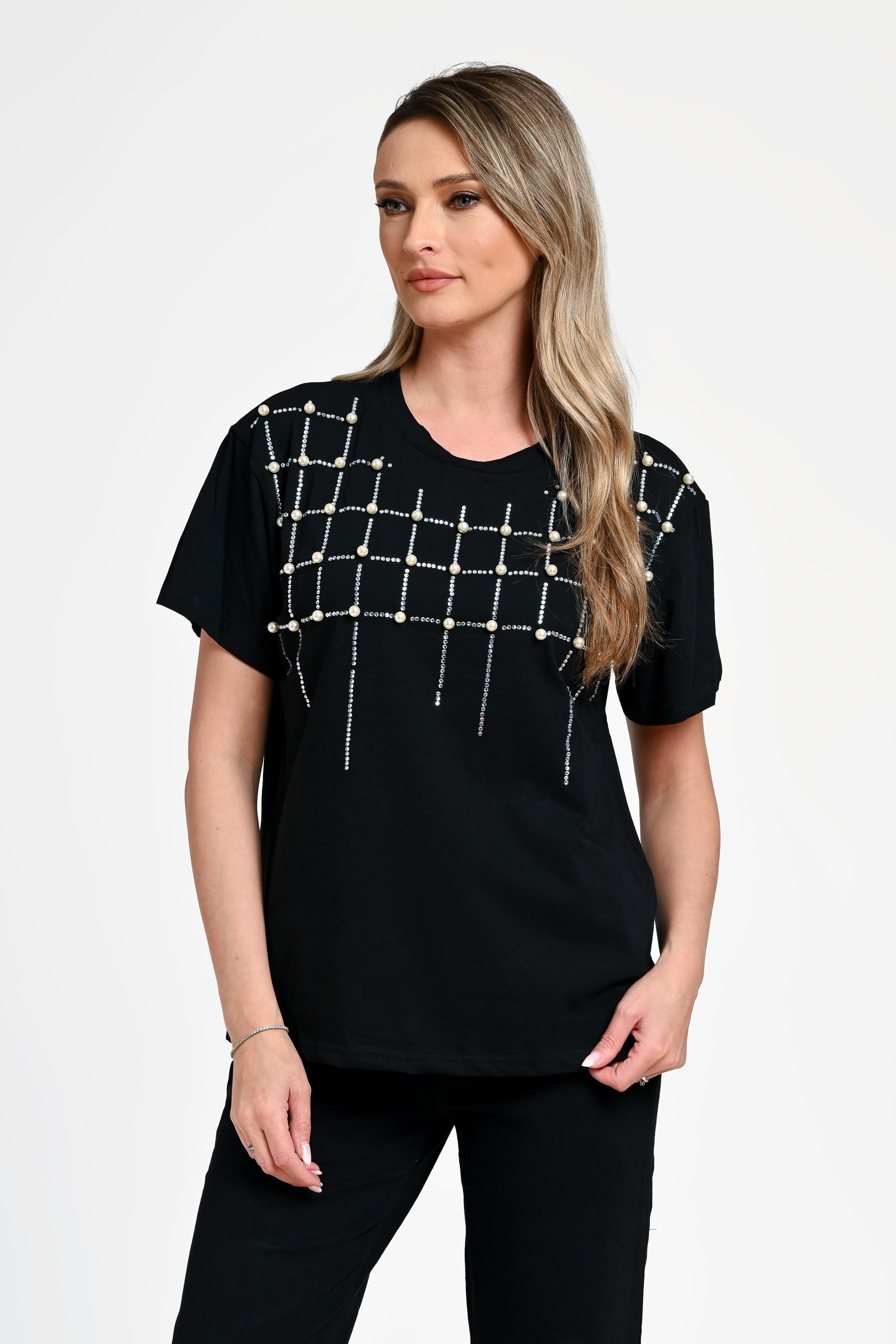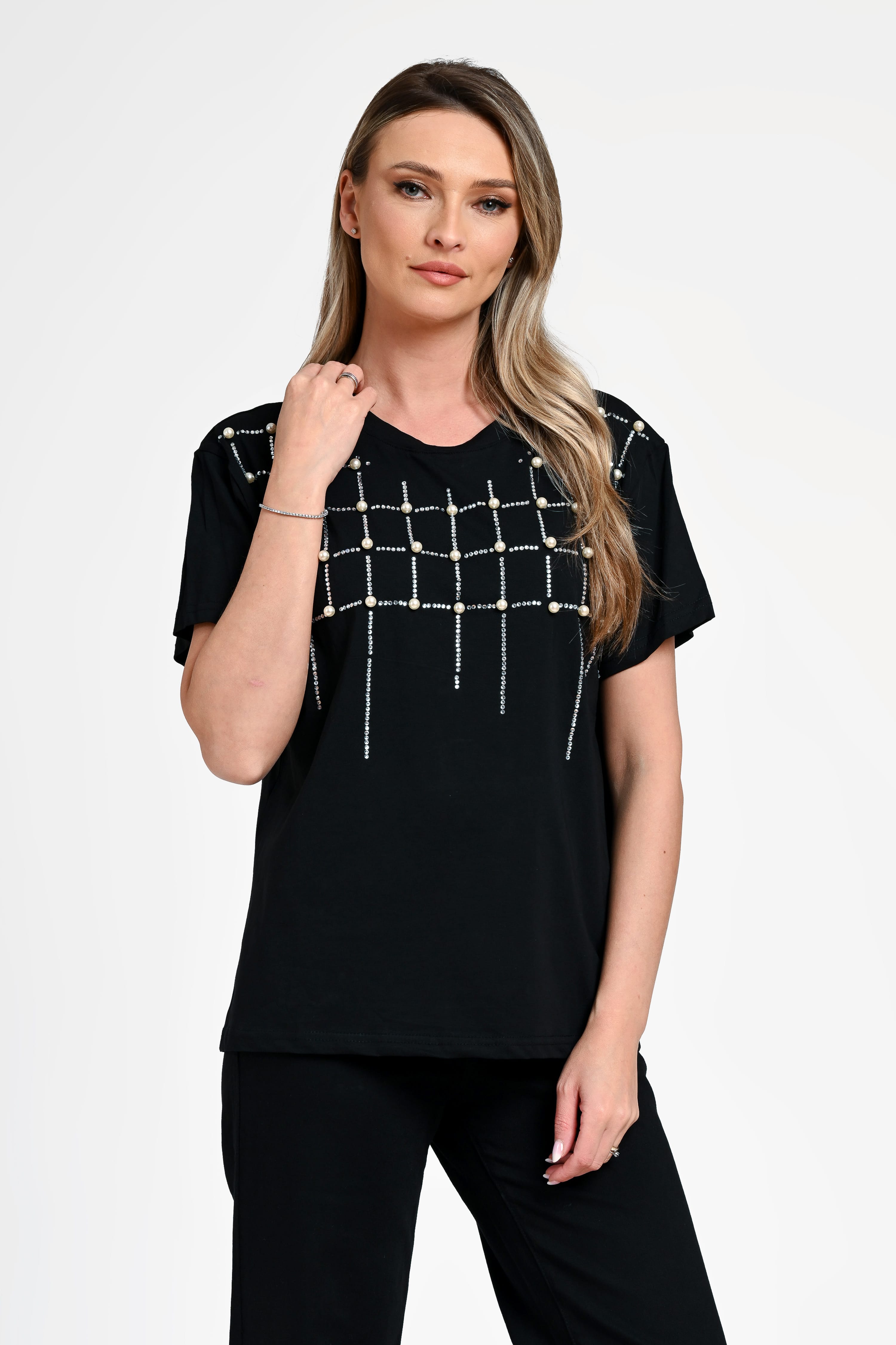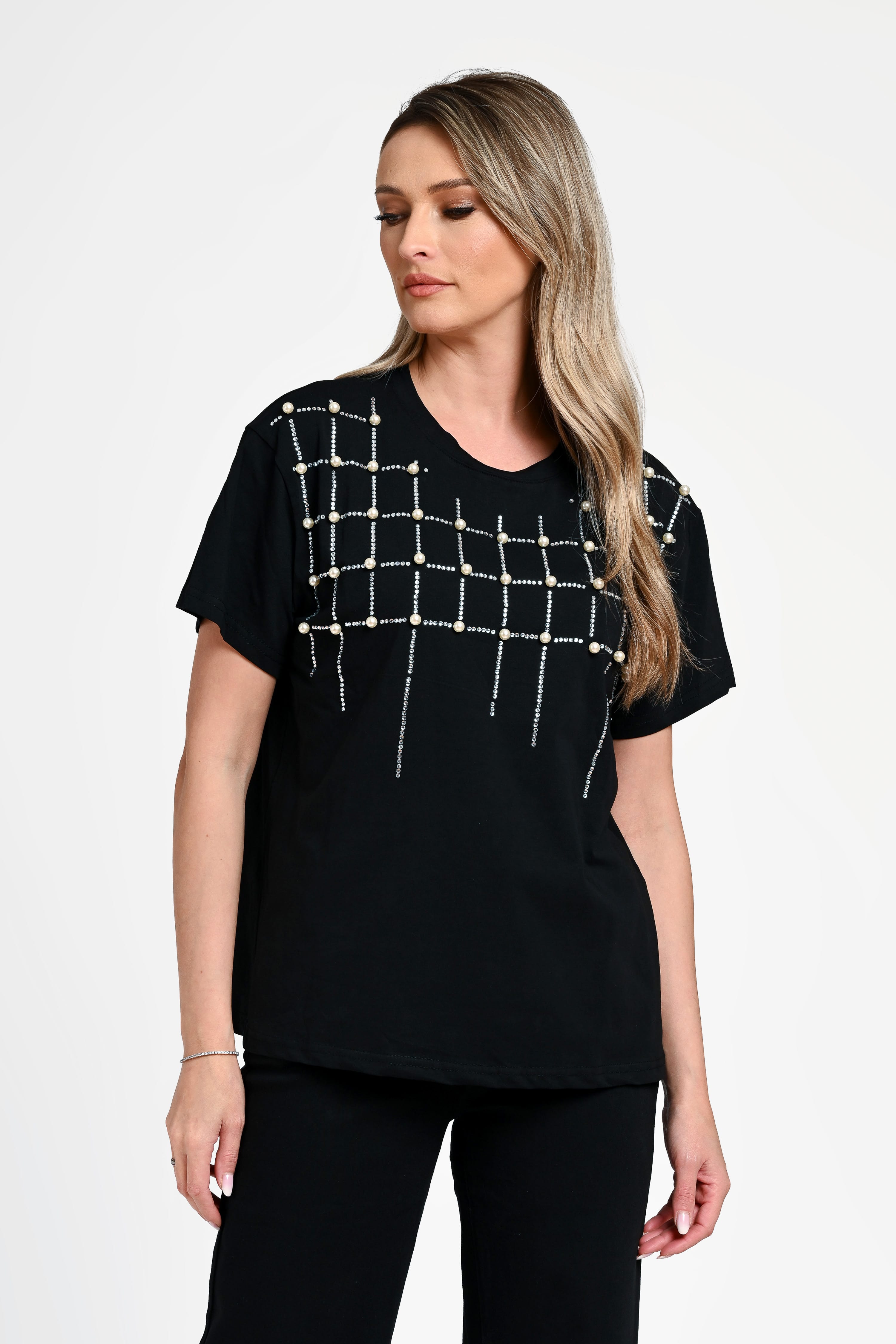 Bluză damă Bianca este o piesă sofisticată, perfectă pentru ținute elegante sau casual-chic. Realizată într-o nuanță clasică de negru, această bluză impresionează prin aplicațiile decorative din perle și strasuri, dispuse într-un model geometric modern, ce adaugă un efect vizual rafinat. Croiala lejeră și mânecile scurte oferă confort, iar designul versatil permite integrarea ușoară în diverse outfituri. Ideală pentru a adăuga un plus de stil oricărei ținute.