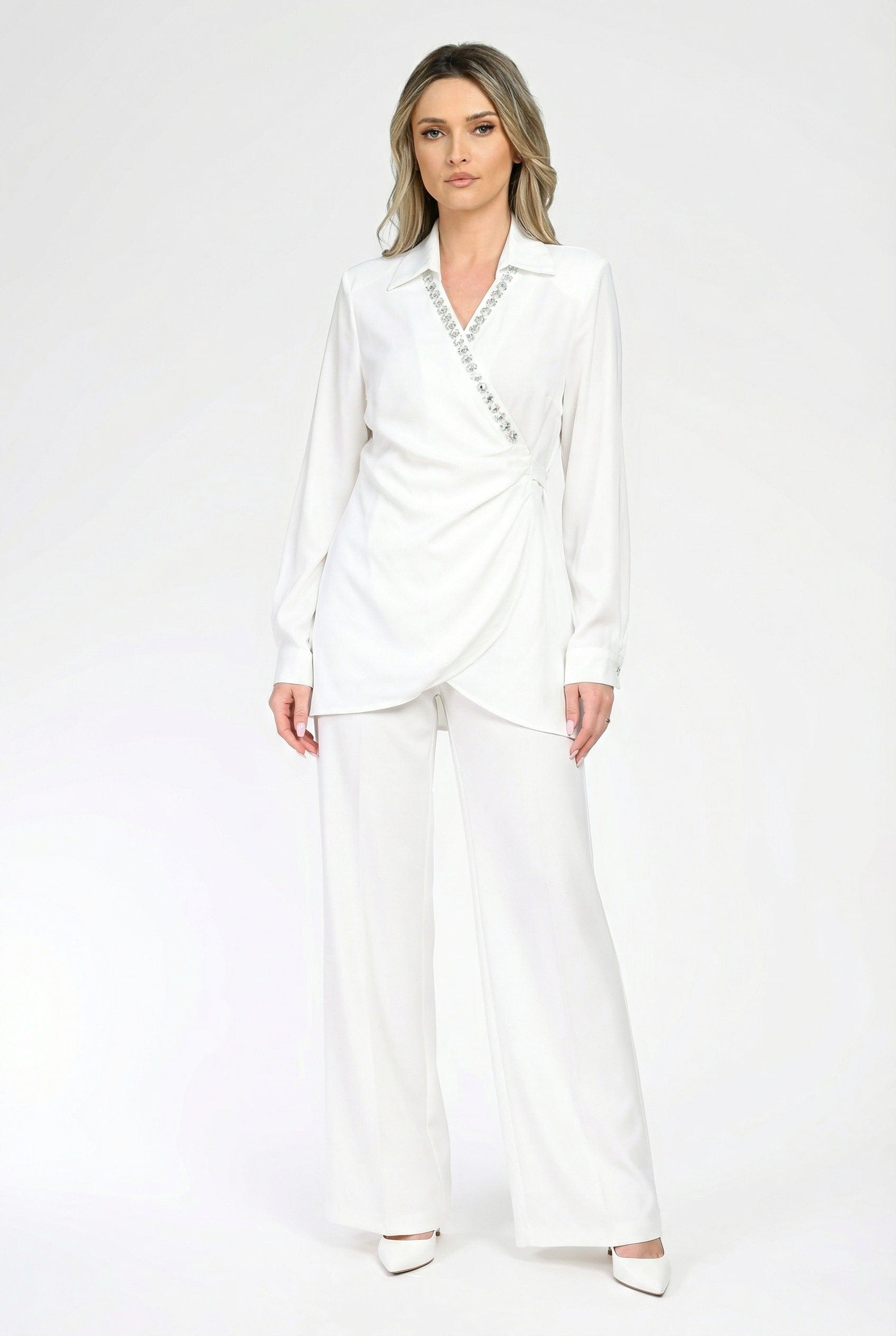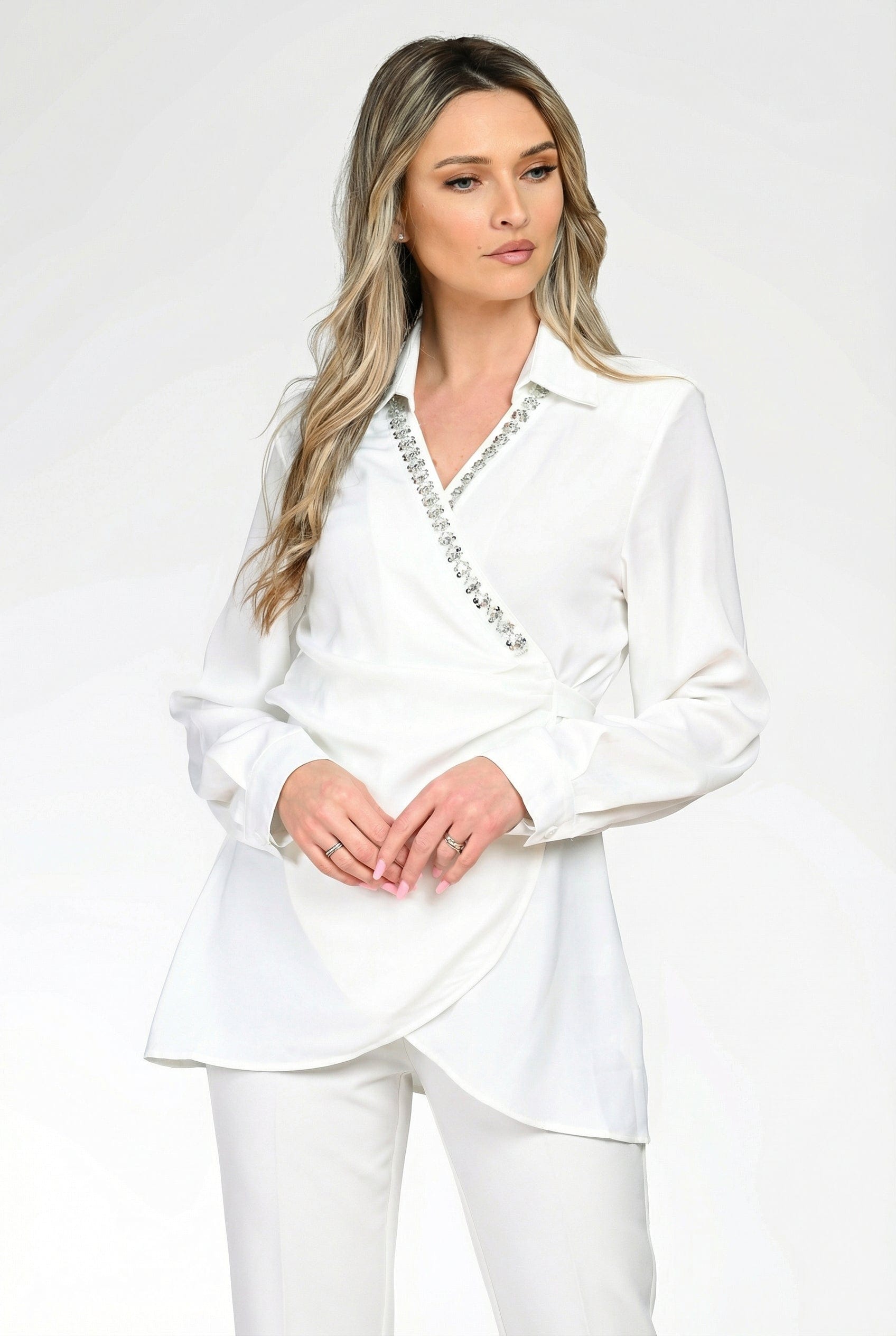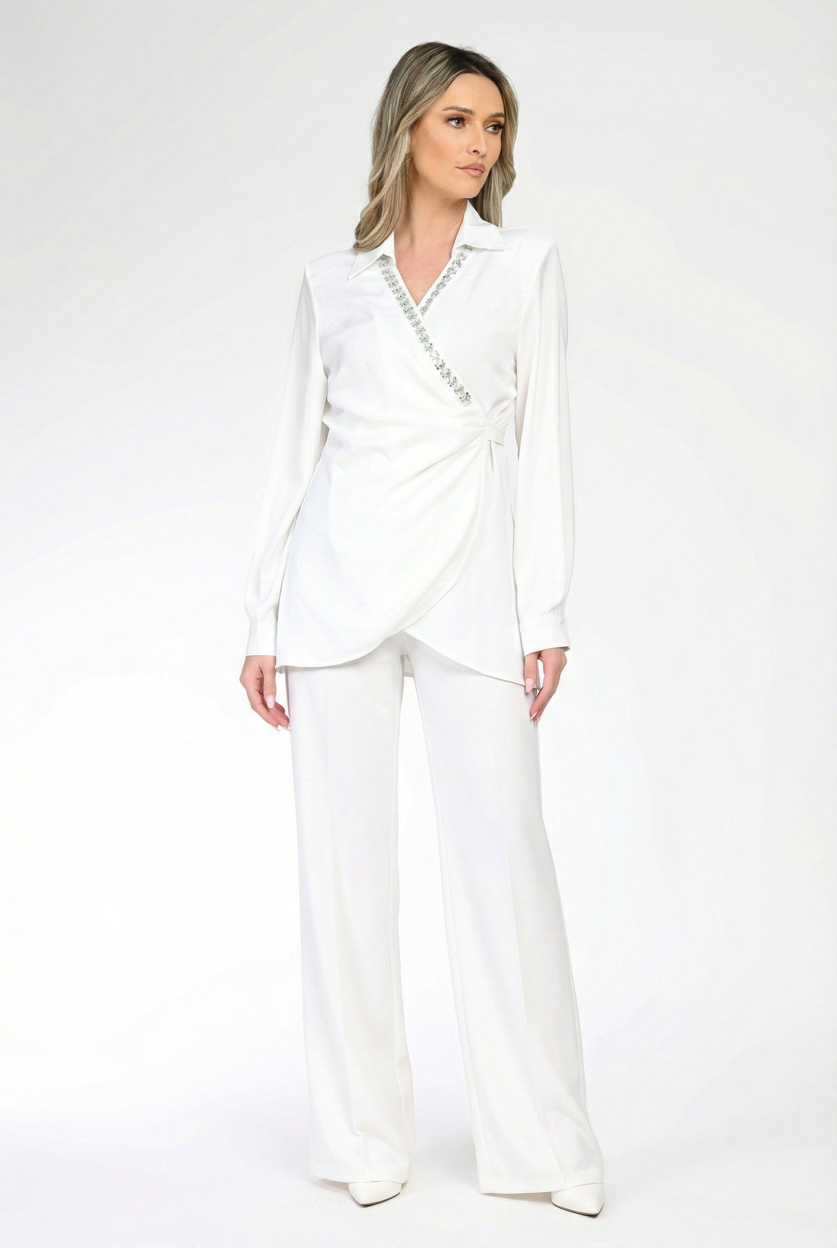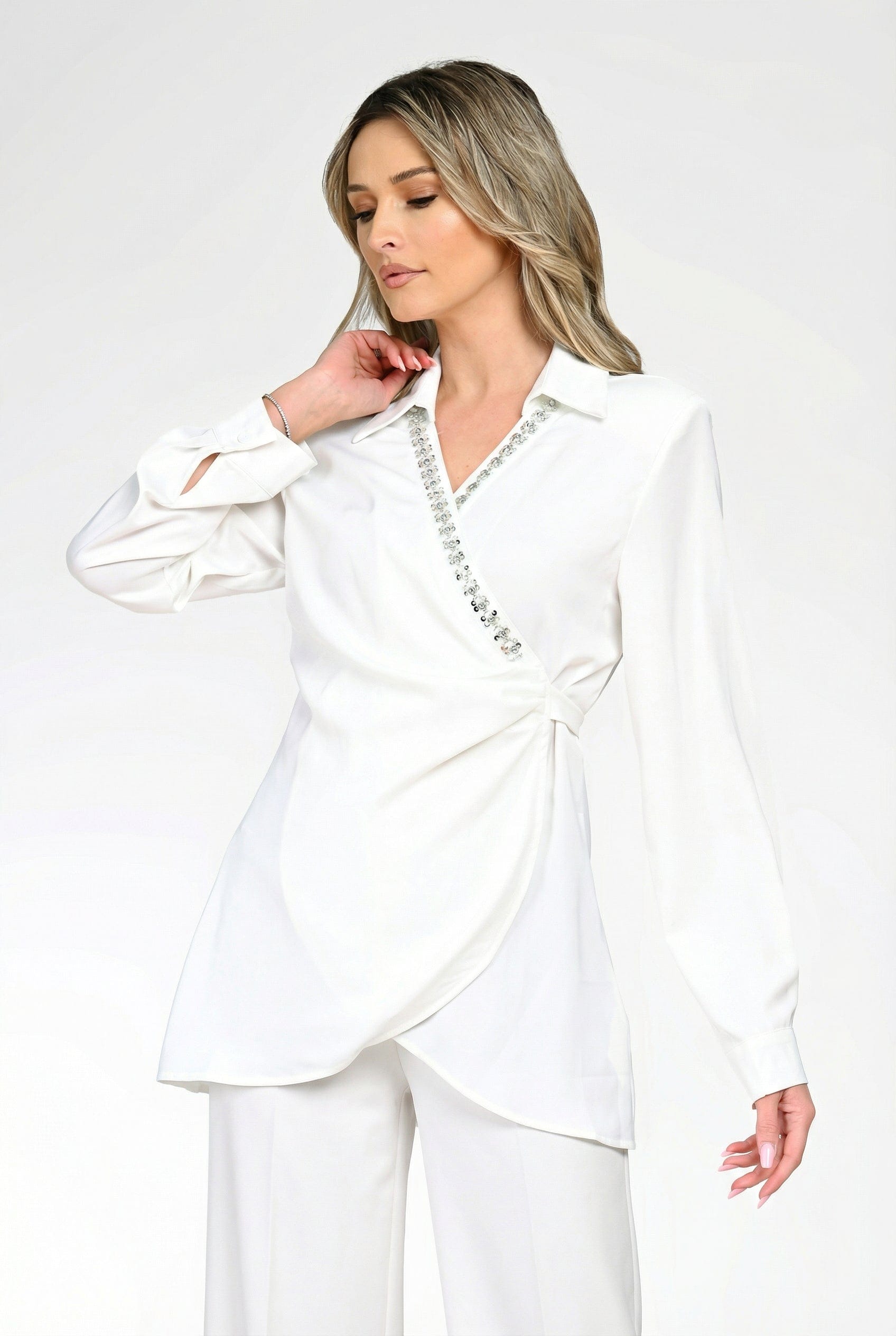Bluză damă albă, cu design petrecut și decolteu în V, decorată cu aplicații discrete tip pietre pentru un plus de rafinament. Croiala lejeră avantajează silueta, iar materialul fluid oferă confort pe tot parcursul zilei.