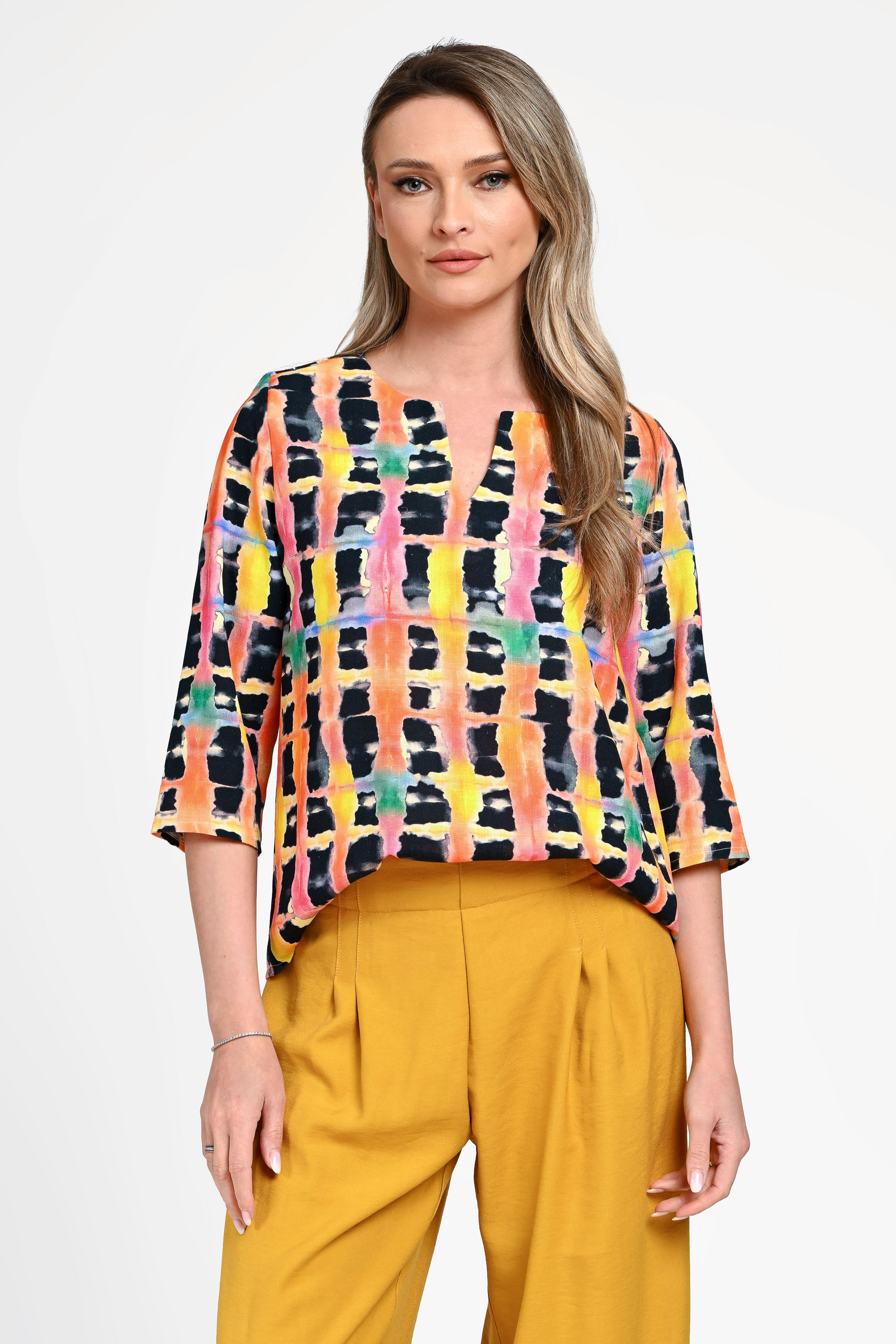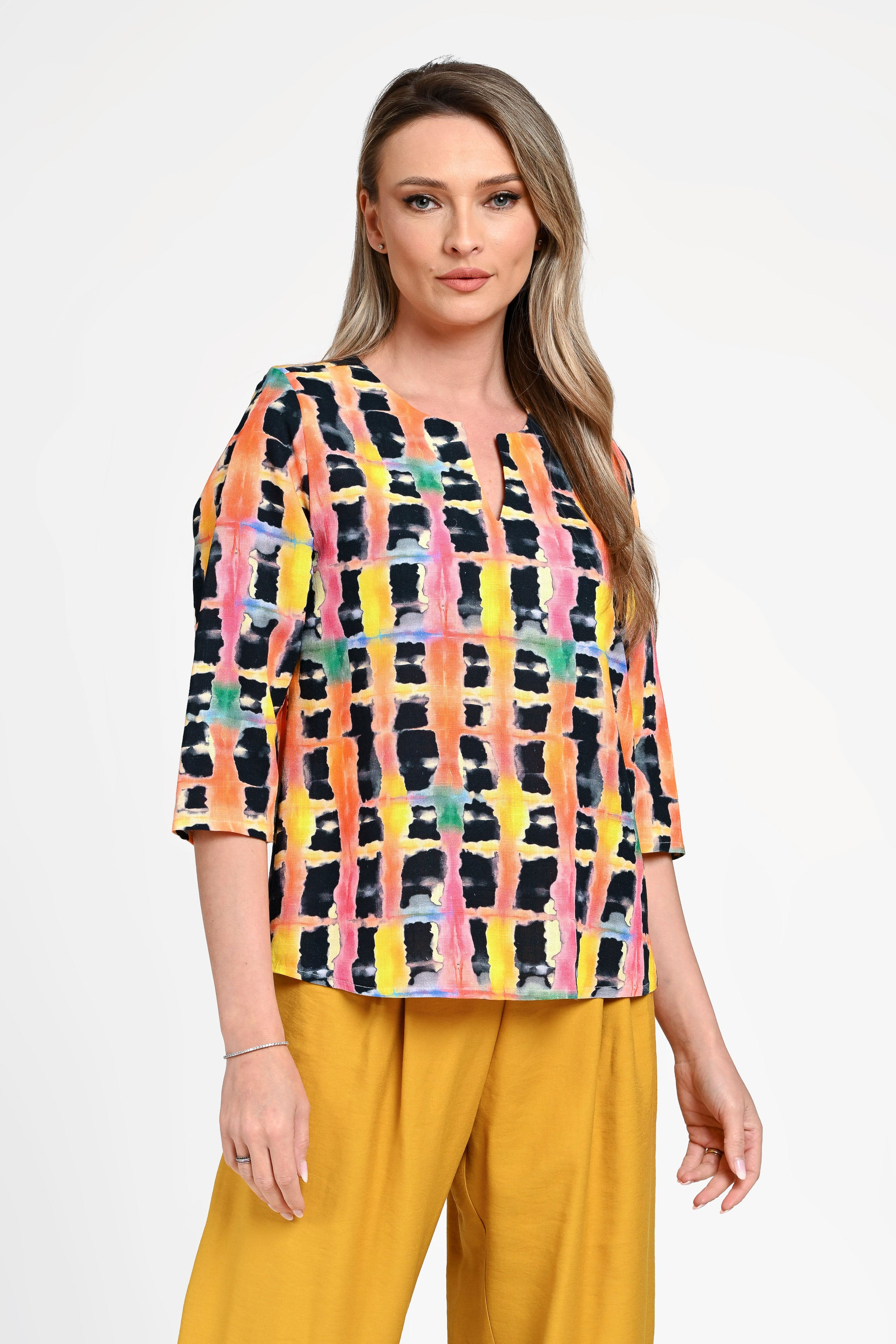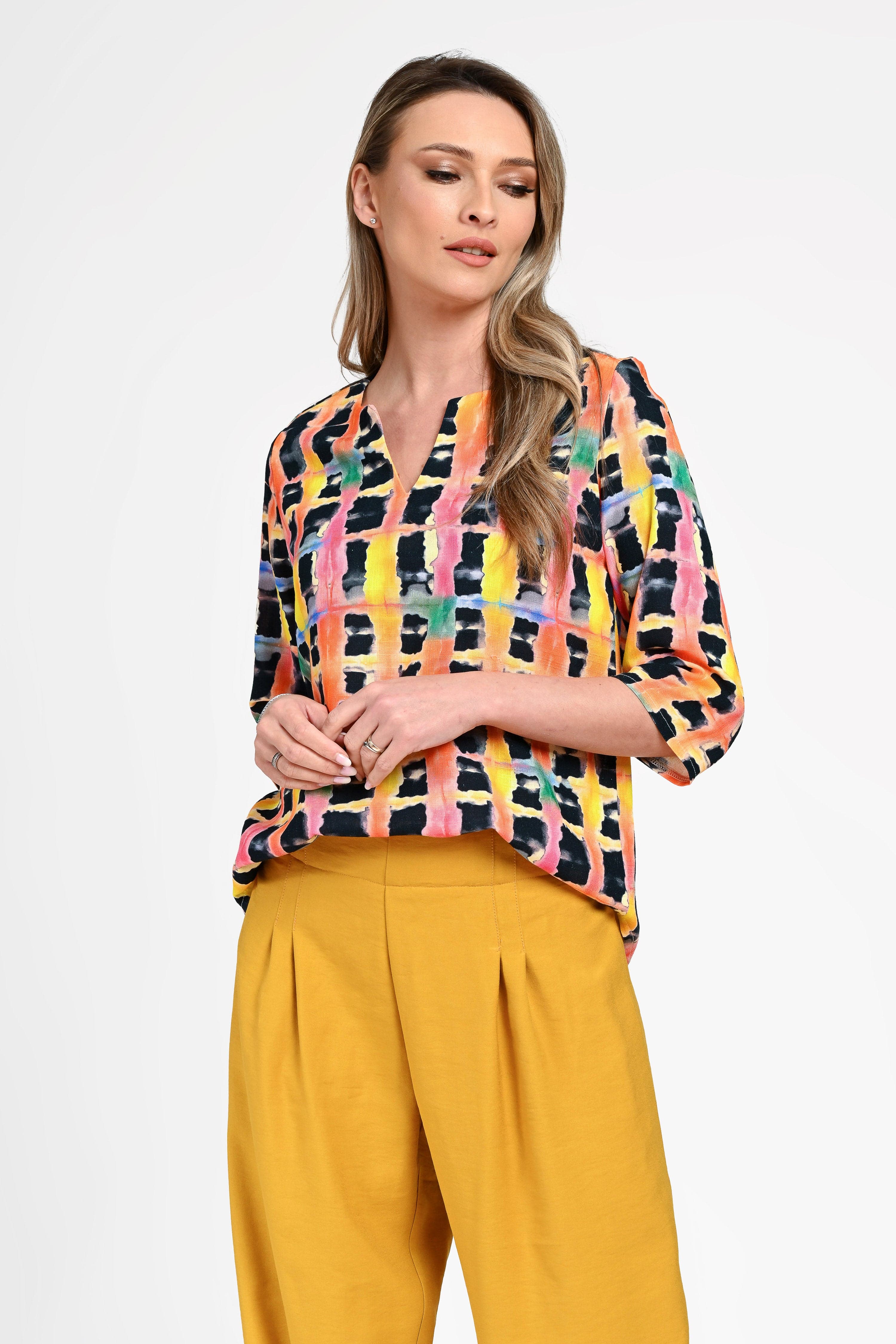 Imprimeul geometric multicolor, în nuanțe vibrante de galben, corai, verde și negru, transformă bluza într-o piesă statement, ușor de integrat în ținute casual sau smart-casual. Se potrivește perfect cu pantaloni eleganți, jeans sau fuste.