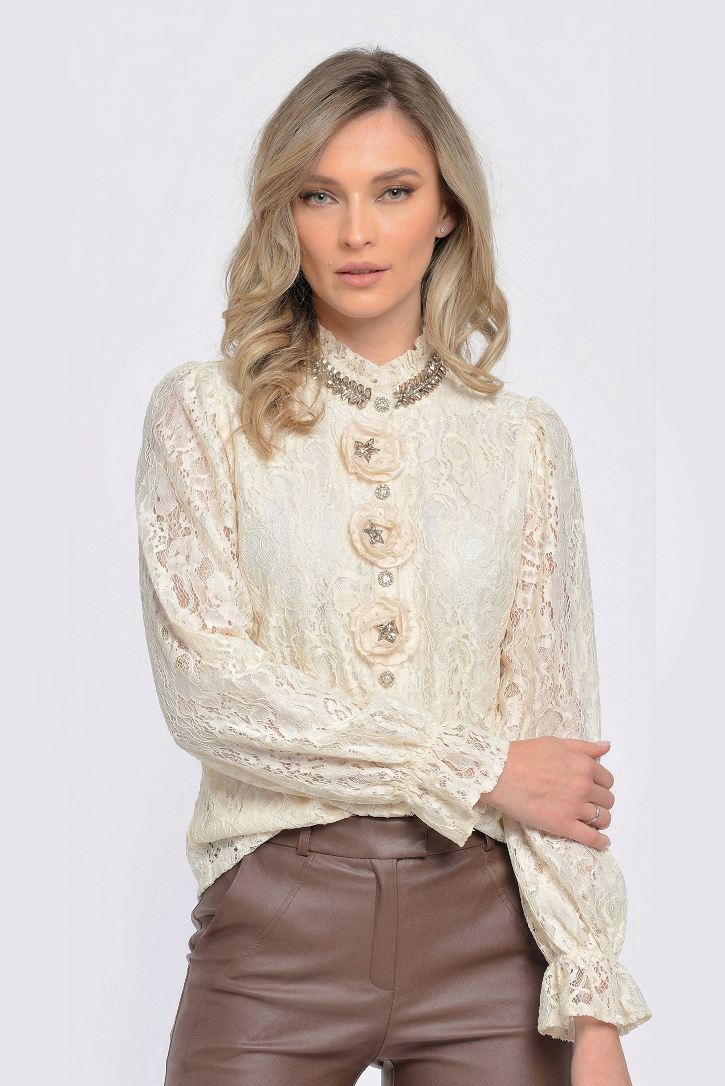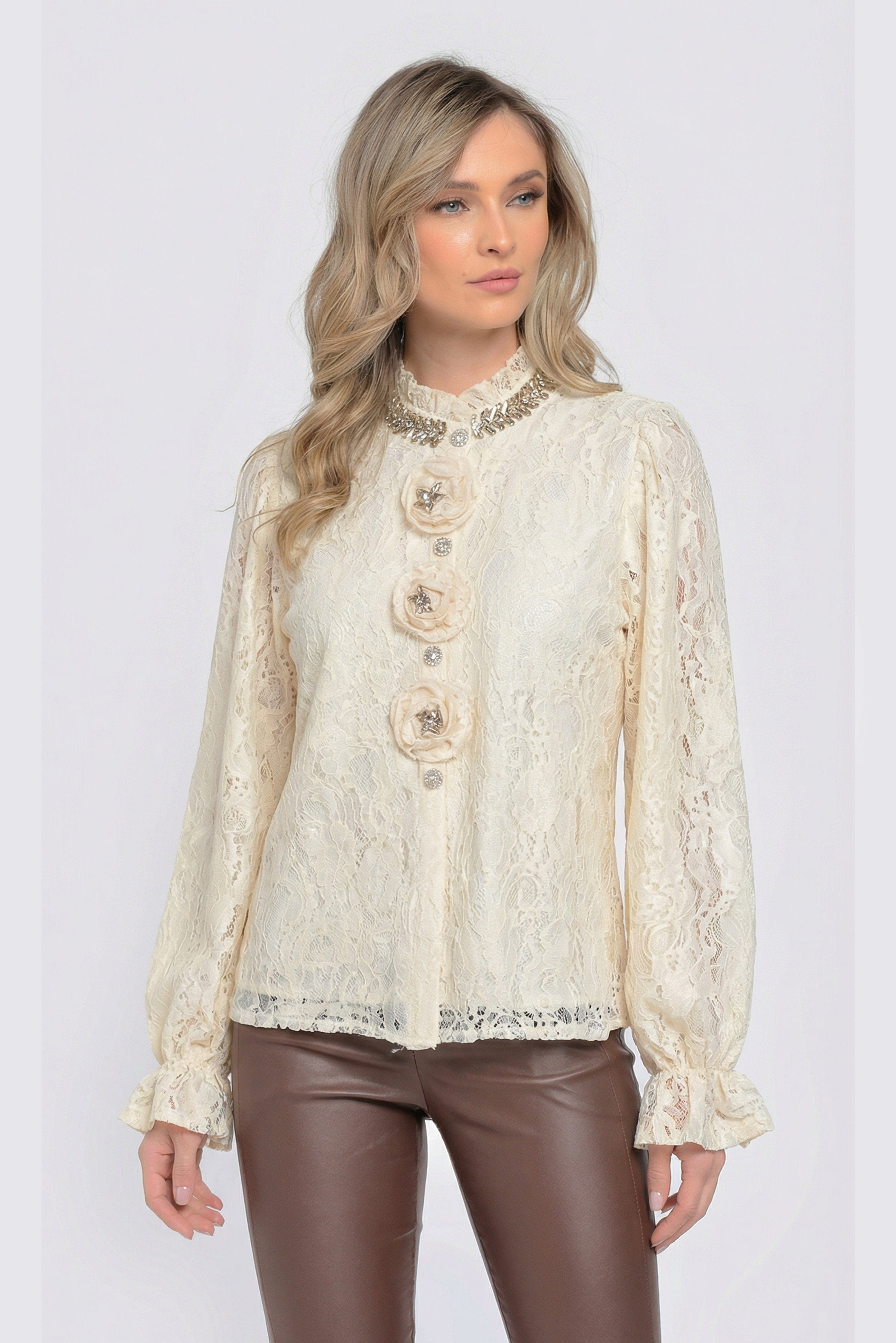 Bluza damă Isabella din dantelă fină crem impresionează prin eleganța detaliilor romantice și croiala lejeră, feminină. Gulerul înalt cu inspirație victoriană este pus în valoare de aplicațiile florale 3D și accentele discrete tip bijuterie, care adaugă un plus de rafinament. Mânecile lungi din dantelă transparentă, ușor bufante, completează designul sofisticat. Perfectă pentru ținute office elegante, evenimente speciale sau combinații chic cu pantaloni din piele ori fuste conice.