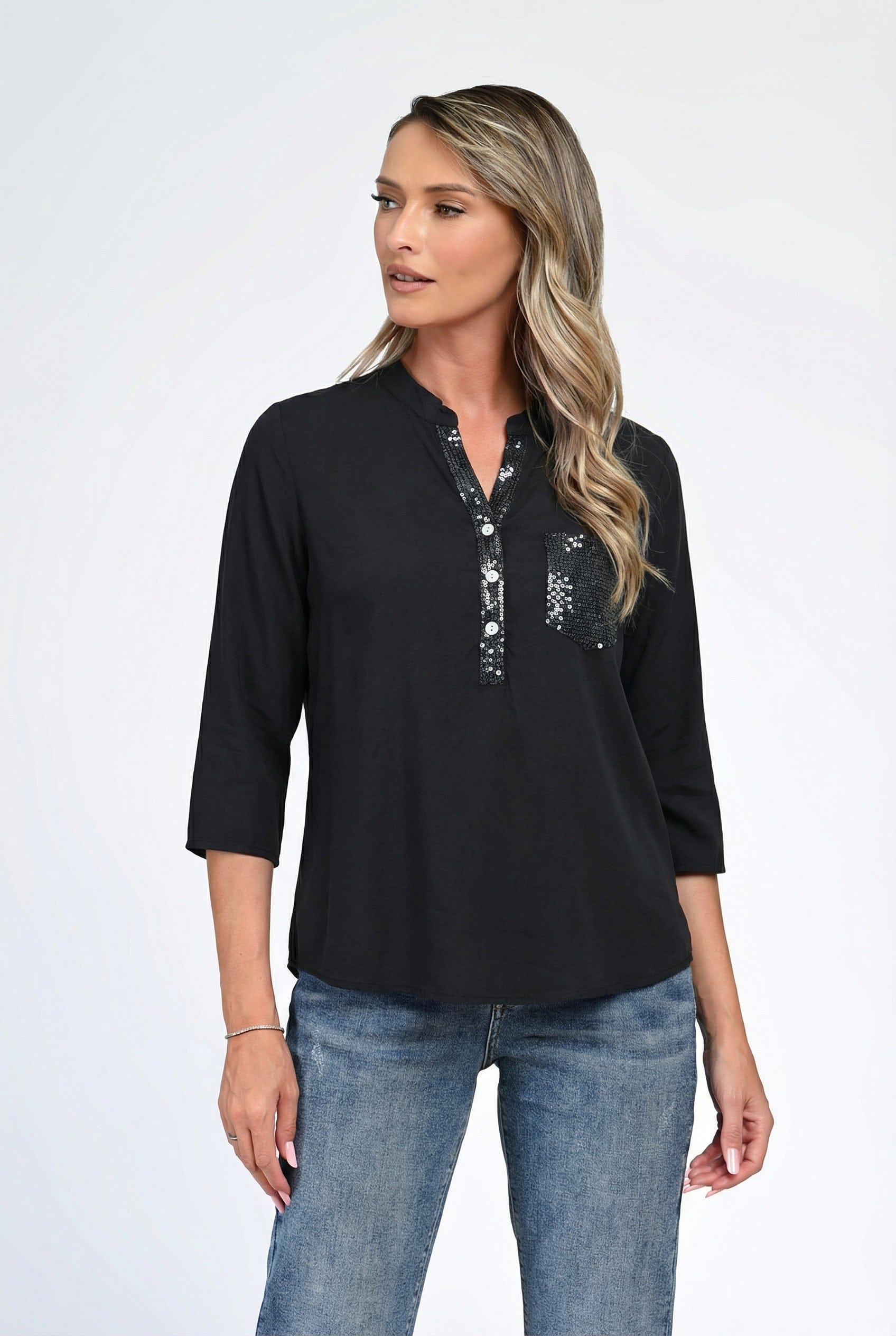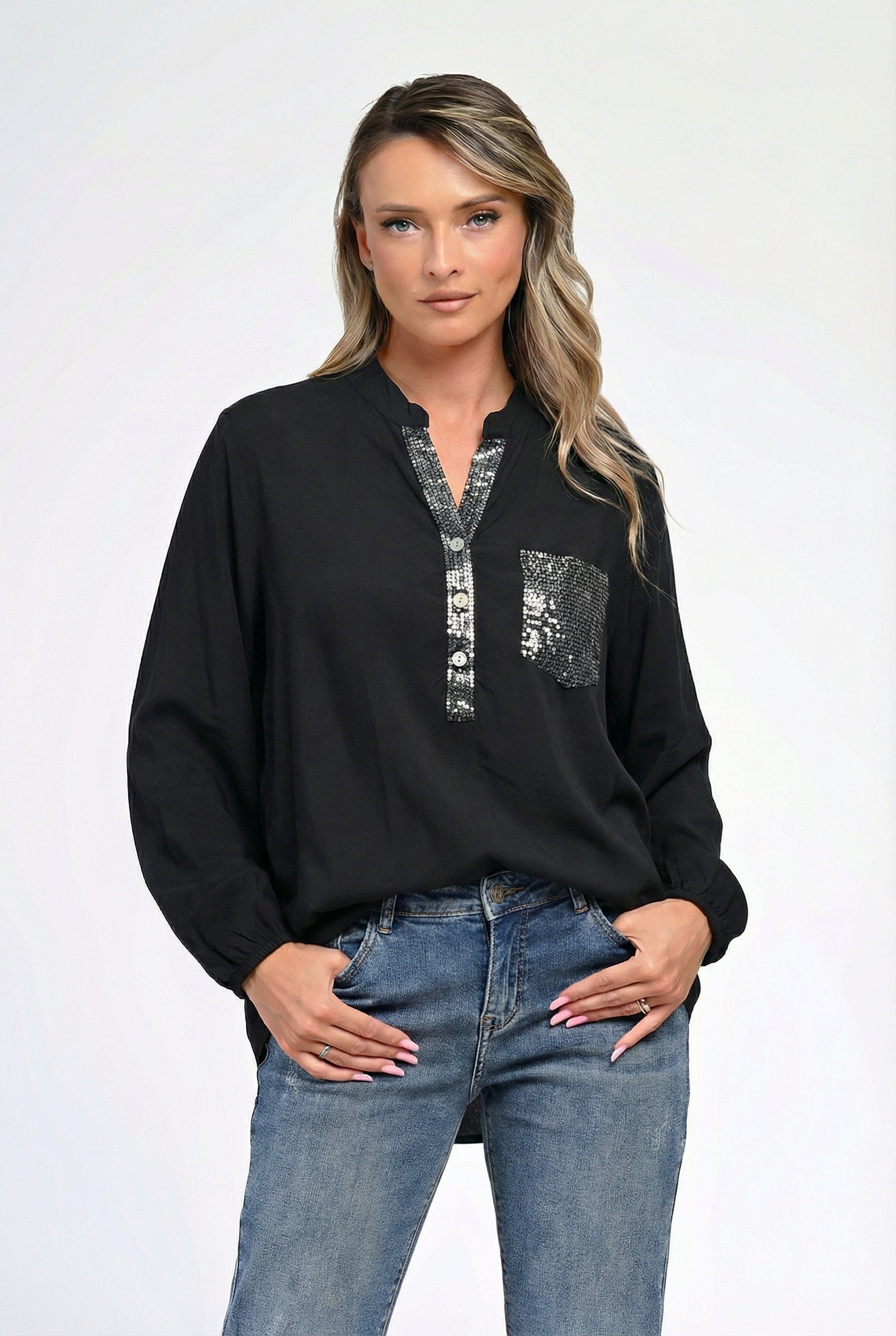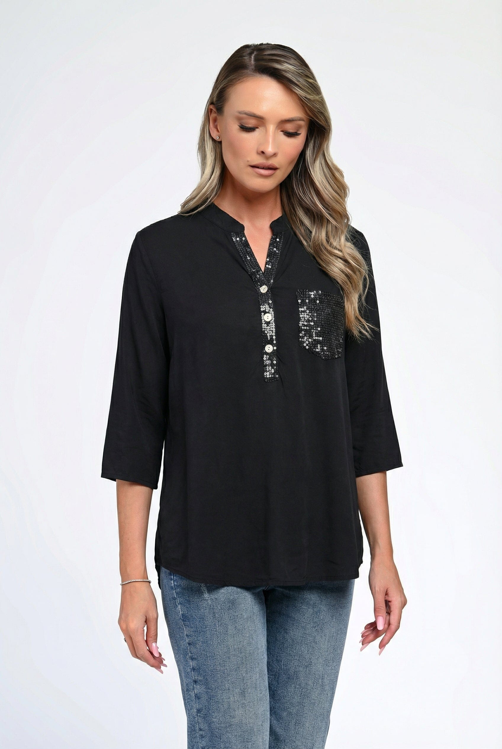 Bluză damă Noir Chic într-o nuanță intensă de negru, cu croială lejeră și design modern. Decolteul tip tunică este evidențiat de inserții elegante cu paiete, care se regăsesc și pe buzunarul aplicat, oferind un efect subtil strălucitor. Mânecile trei sferturi pot fi purtate rulate pentru un plus de versatilitate. Model ideal pentru ținute office elegante, ieșiri de seară sau combinații smart casual cu pantaloni conici.
