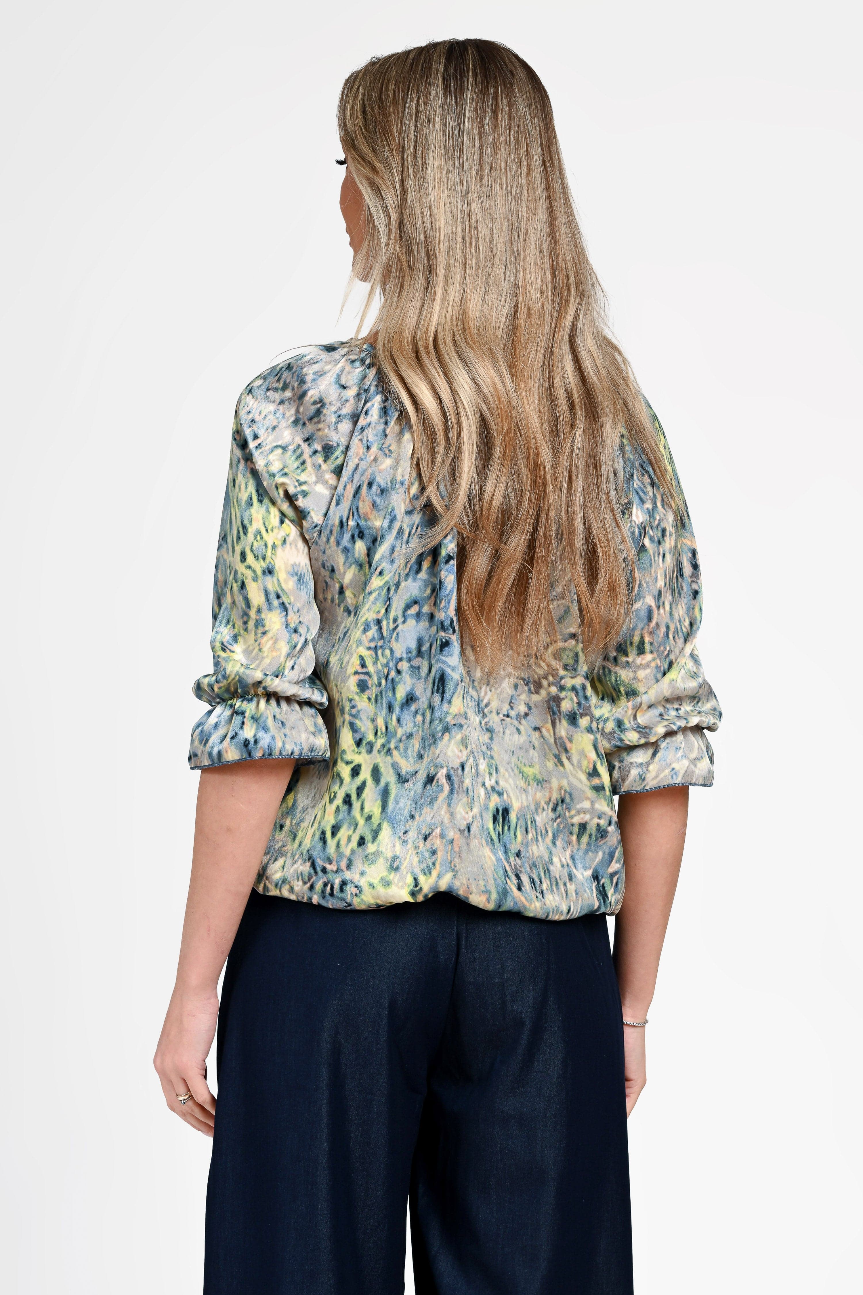 Imprimeul abstract, în nuanțe armonioase de verde, albastru și tonuri neutre, conferă bluzei un aspect sofisticat și ușor de integrat în diverse ținute. Poate fi purtată cu pantaloni, jeans sau fuste, pentru un look casual sau smart-casual.