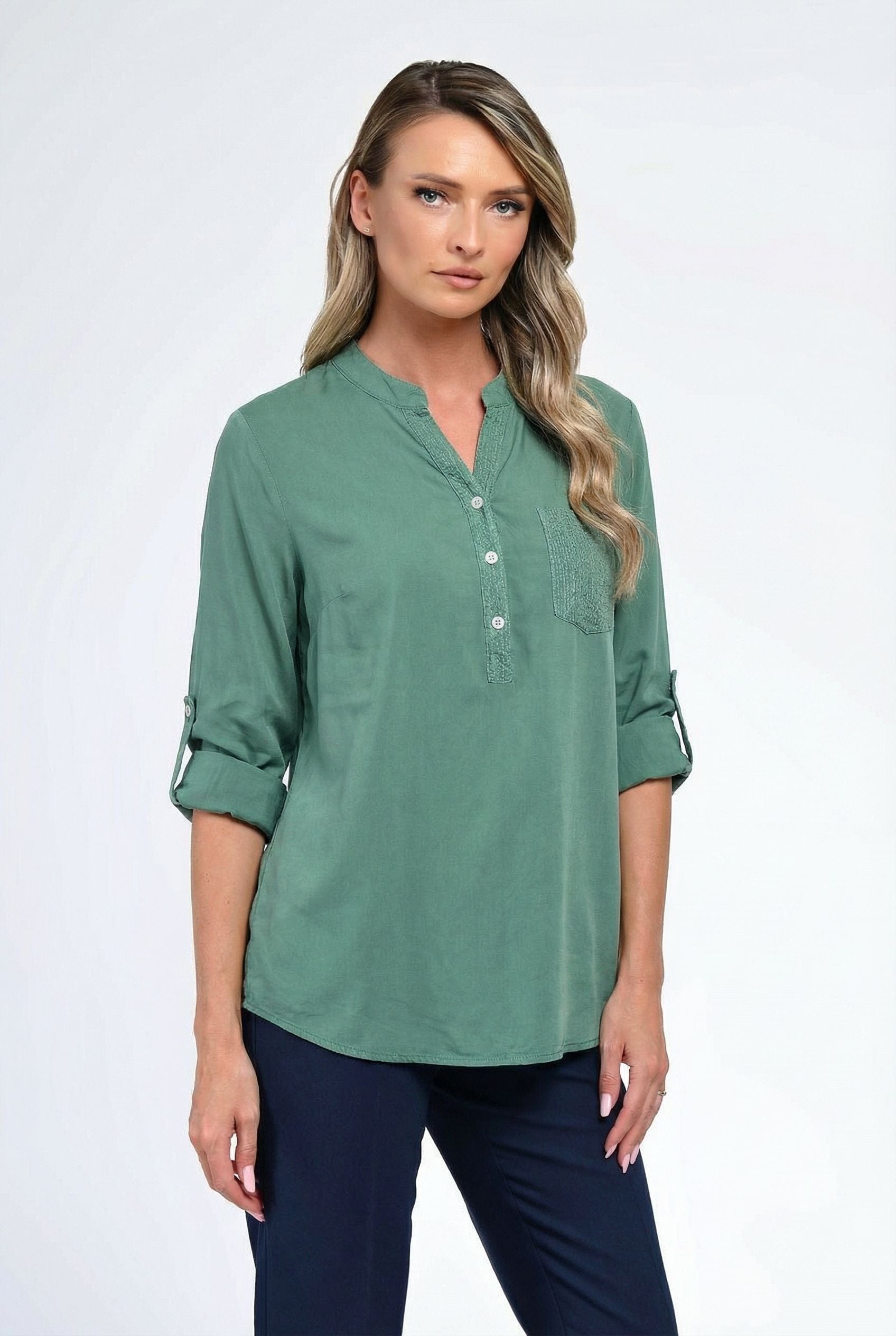 Bluză damă Olivia într-o nuanță elegantă de verde salvie, cu croială lejeră și design minimalist. Decolteul tip tunică, prevăzut cu nasturi discreți, oferă un aer feminin și versatil. Buzunarul aplicat cu textură fină adaugă un detaliu subtil și modern, iar mânecile lungi pot fi ajustate pentru un plus de confort. Model ideal pentru ținute office relaxate sau combinații casual chic cu pantaloni eleganți ori jeanși.