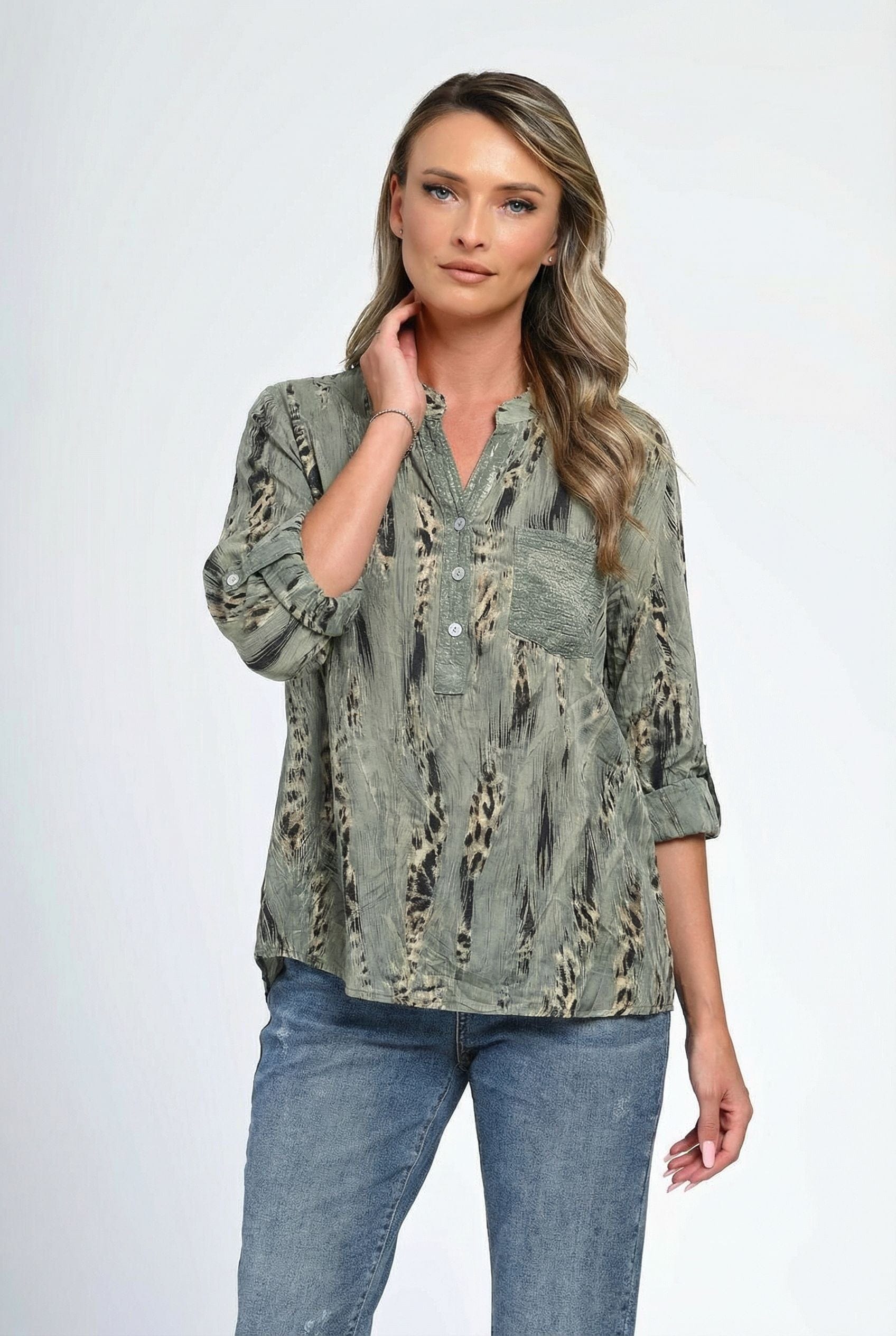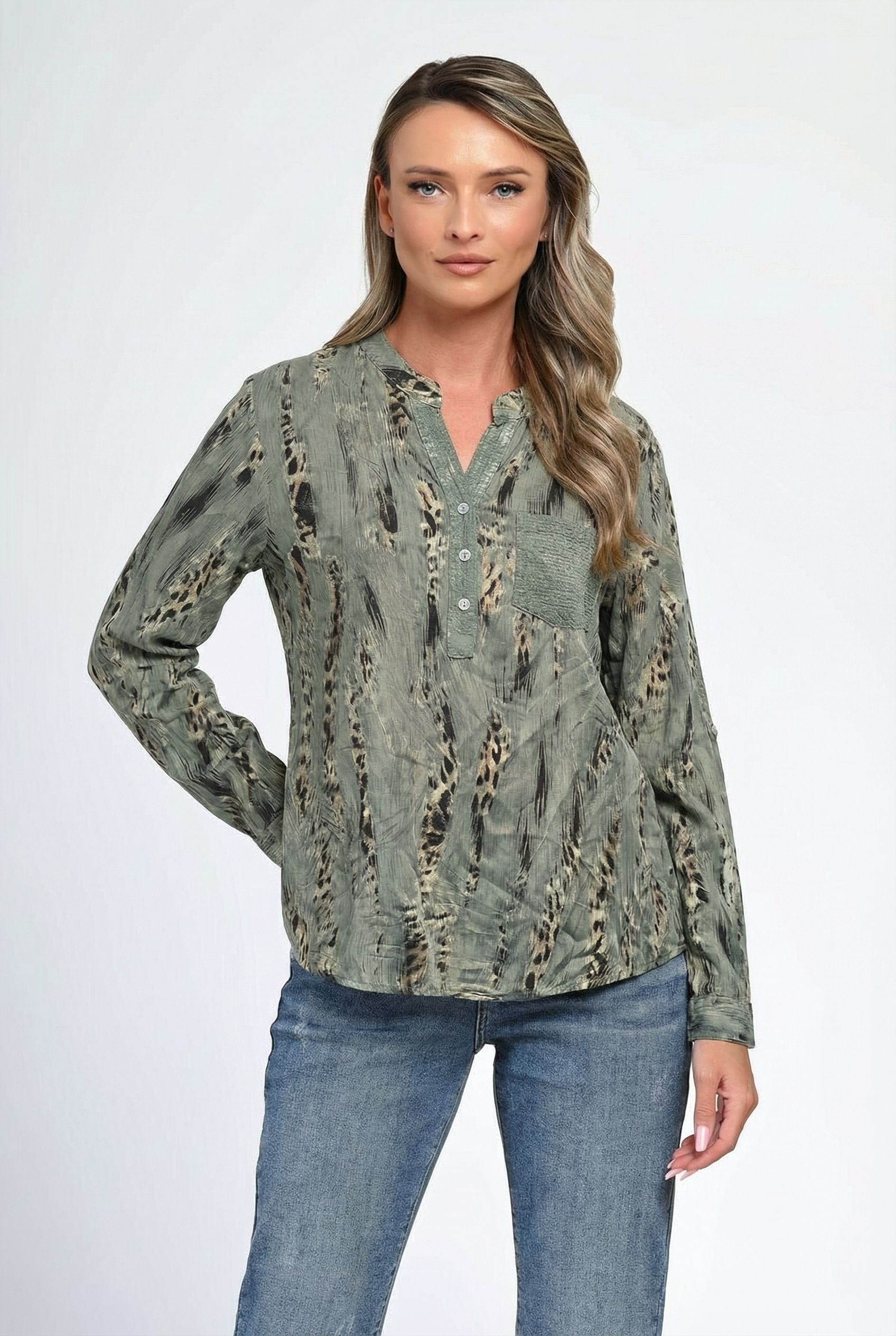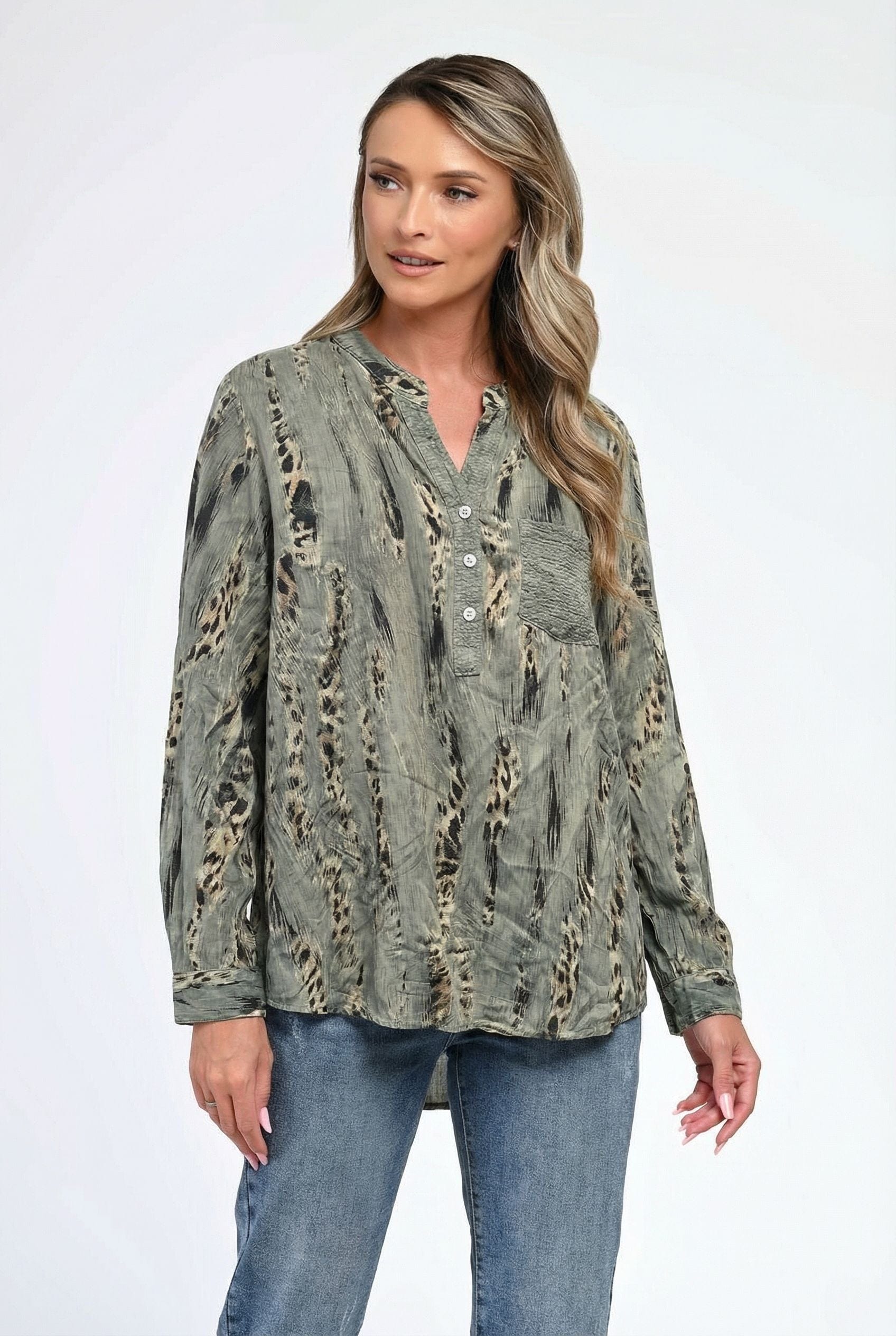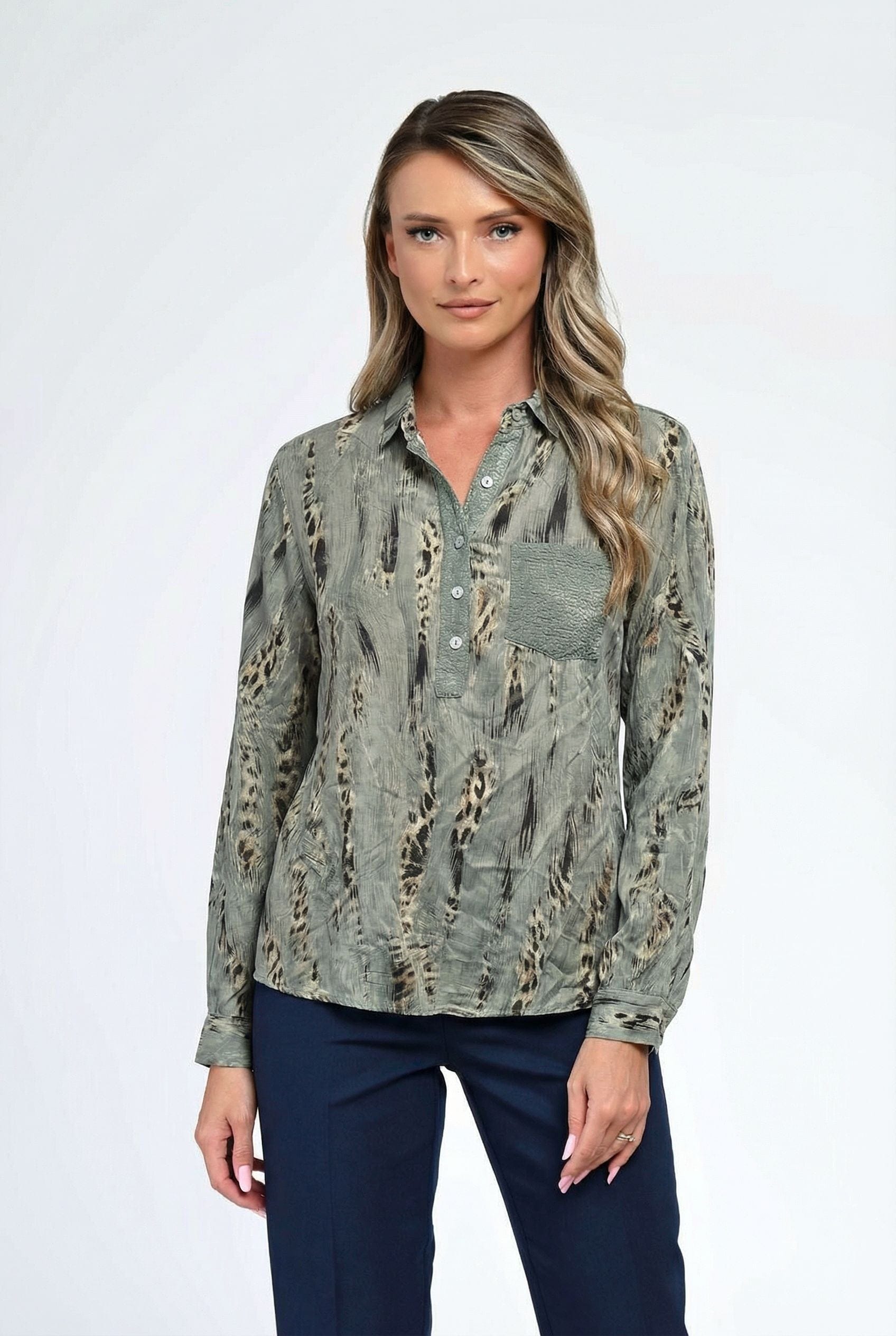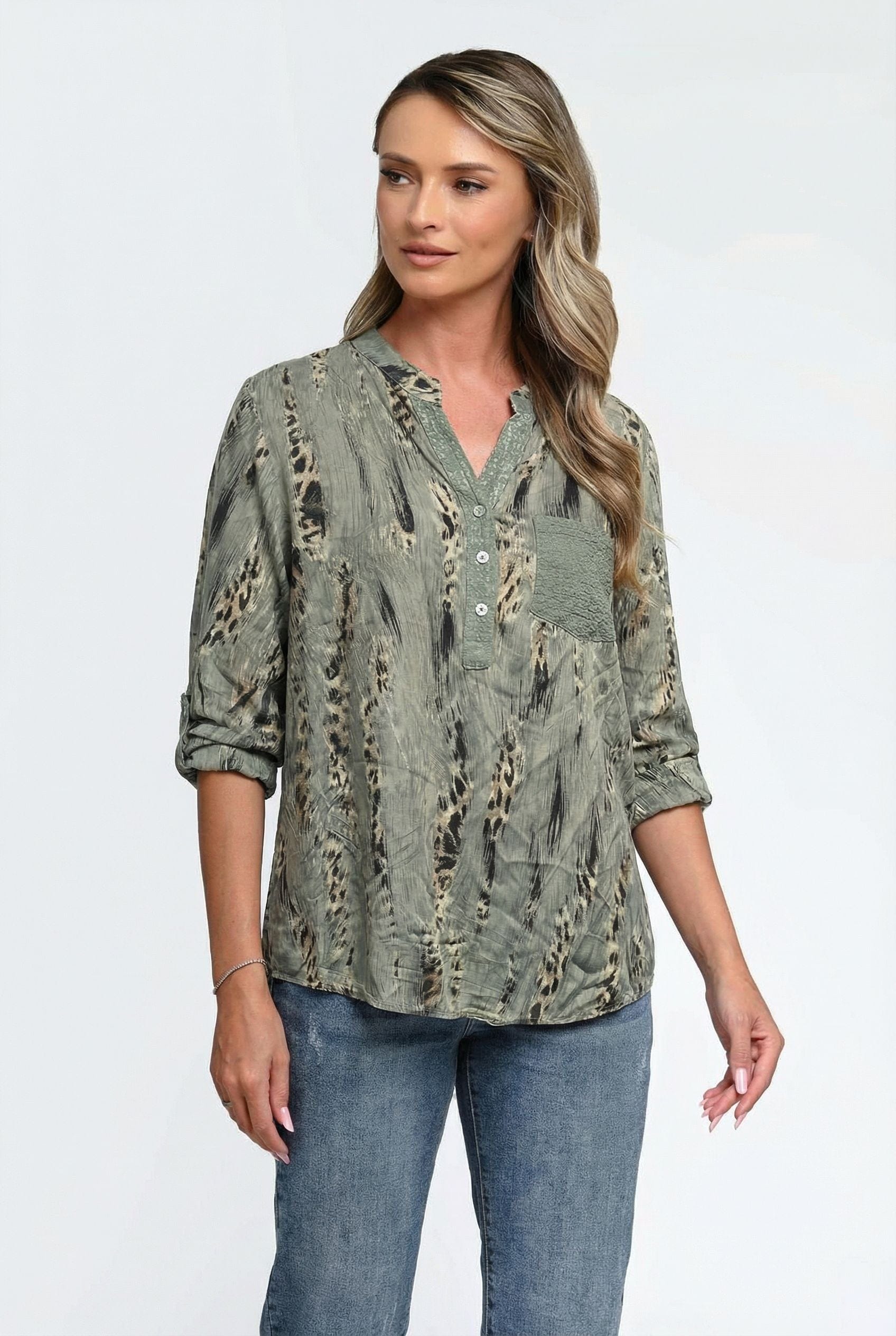Bluză damă Savanna în nuanță verde kaki, cu imprimeu abstract inspirat din texturi naturale, perfectă pentru ținute moderne și versatile. Croiala lejeră oferă confort pe tot parcursul zilei, iar decolteul tip tunică, cu nasturi discreți, adaugă un aer feminin și relaxat. Buzunarul aplicat texturat creează un contrast subtil, iar mânecile trei sferturi pot fi rulate pentru un plus de lejeritate. Ideală pentru combinații casual chic cu jeanși sau pantaloni conici.