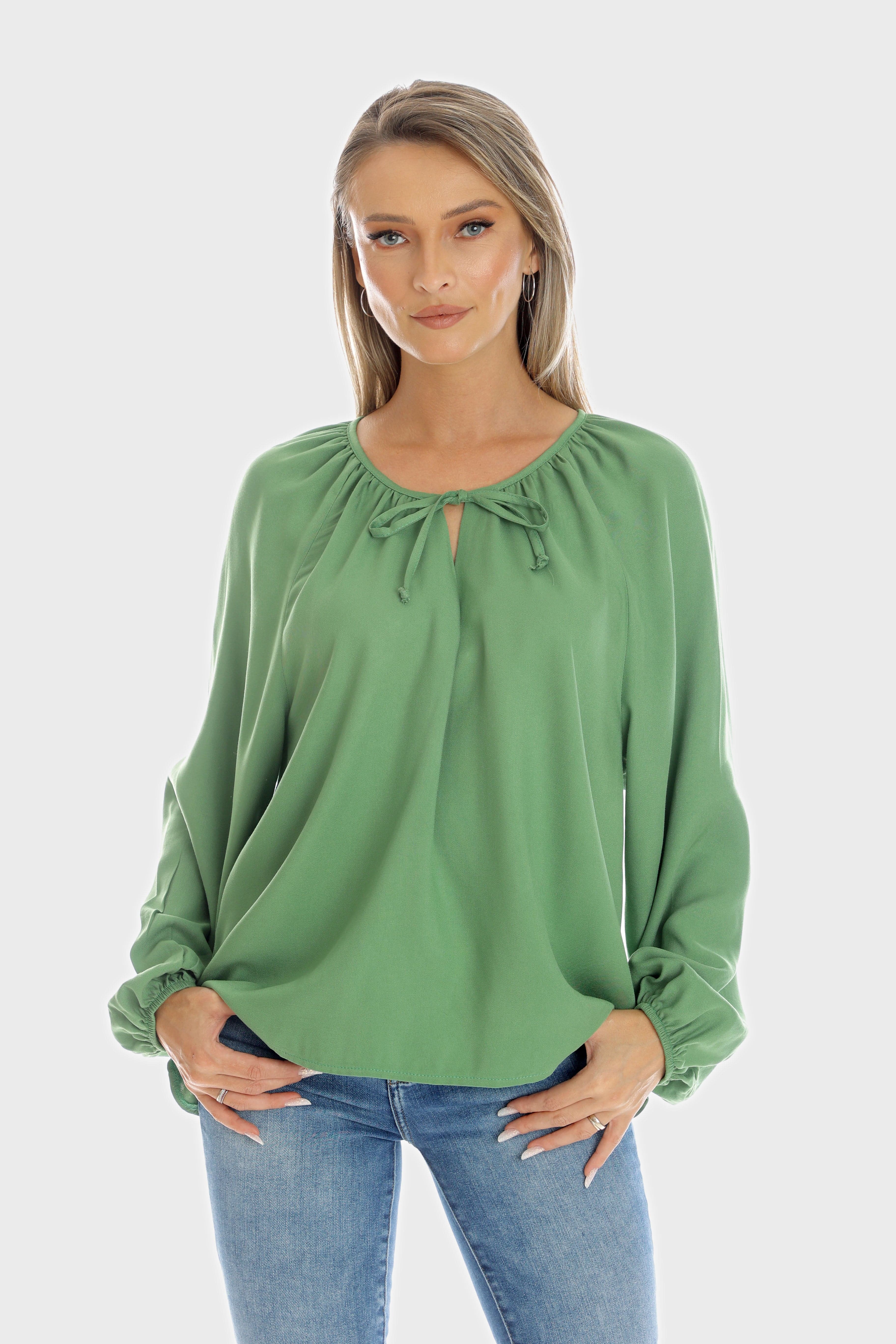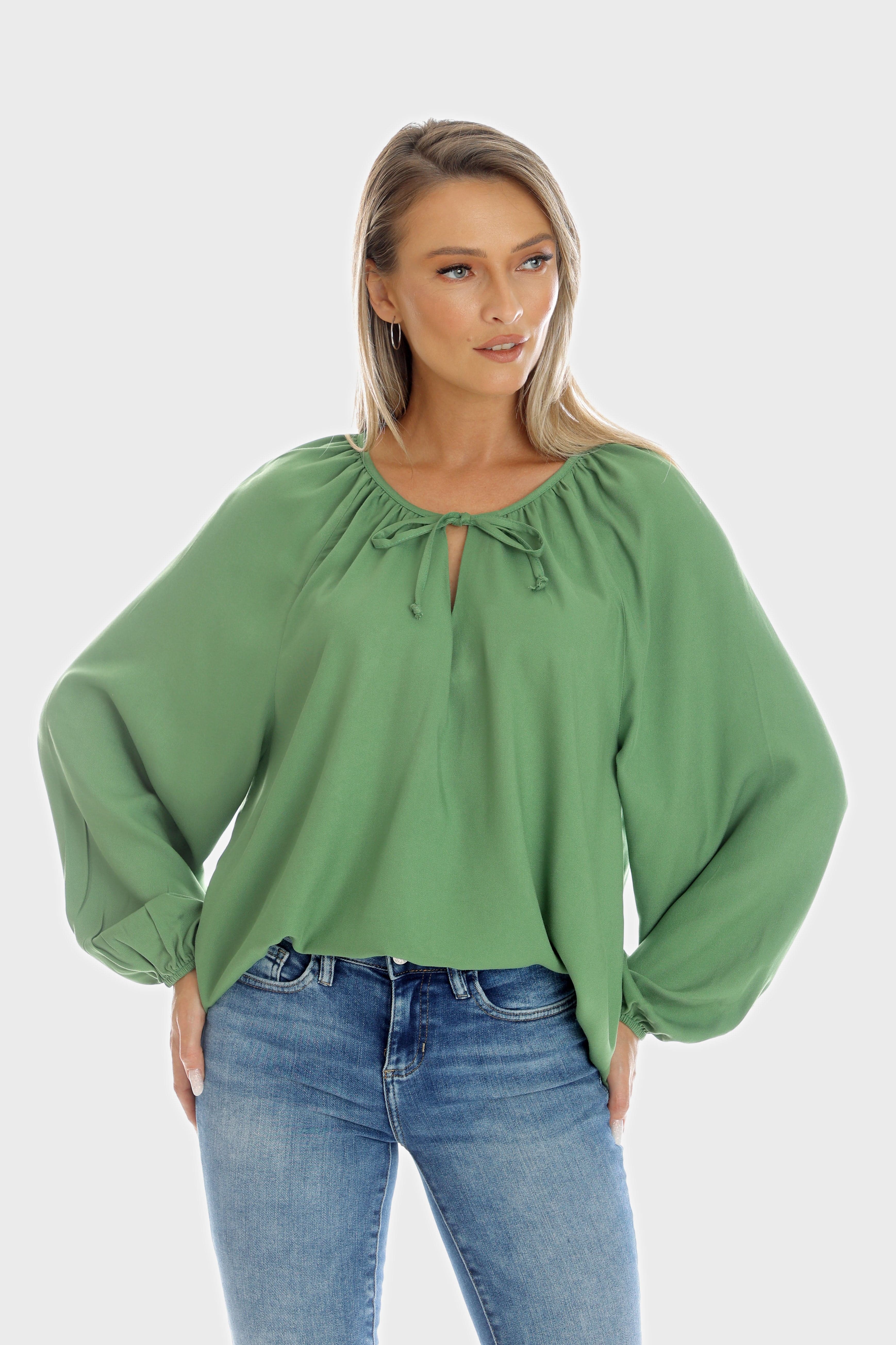 Bluza ampla, stil ie, realizata din viscoza verde crud, fluida si confortabila. Croiul este lejer, cu decolteu rotund si snur subtire care se leaga intr-o funda, iar manecile sunt lungi, ample si bufante. Este o piesa versatila, perfecta pentru un look casual sau boho chic. Se potriveste foarte bine cu jeans si accesorii statement.