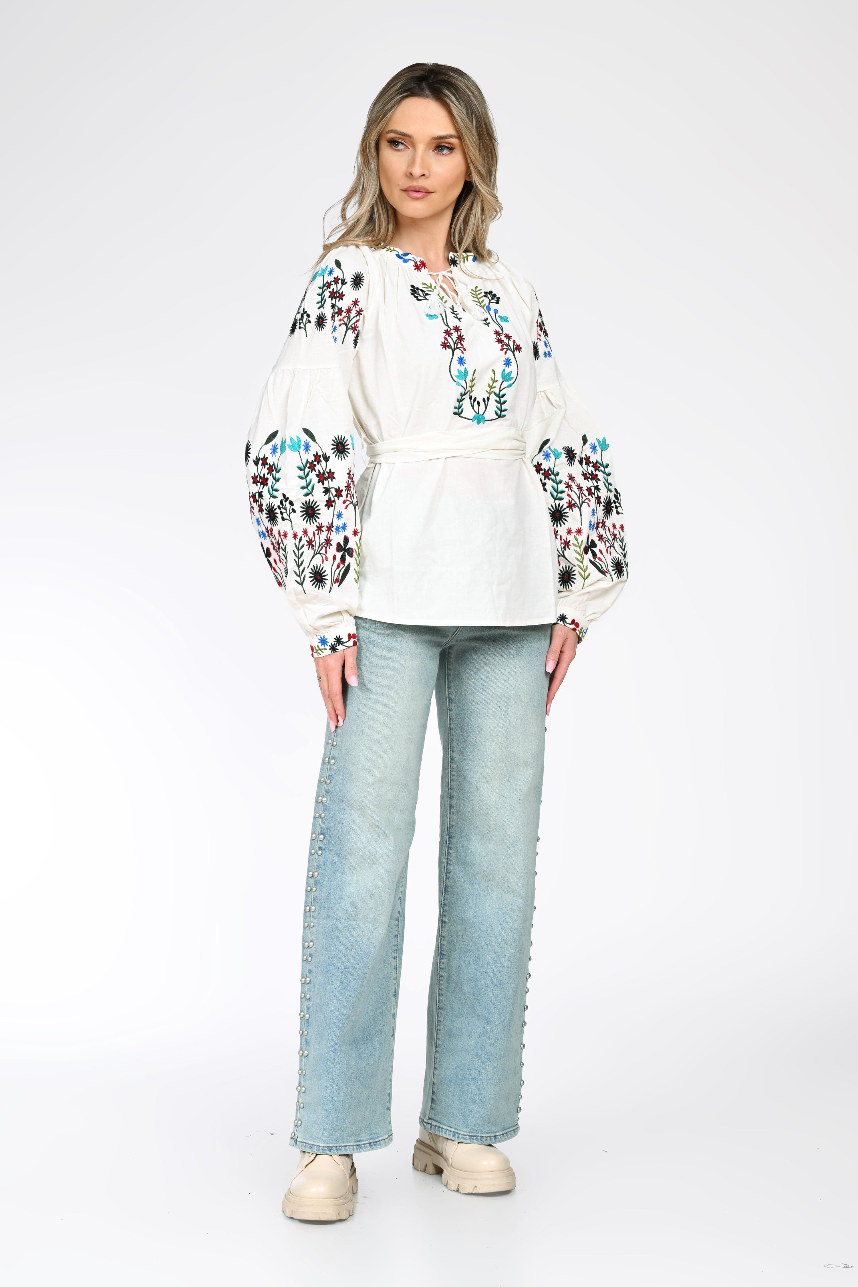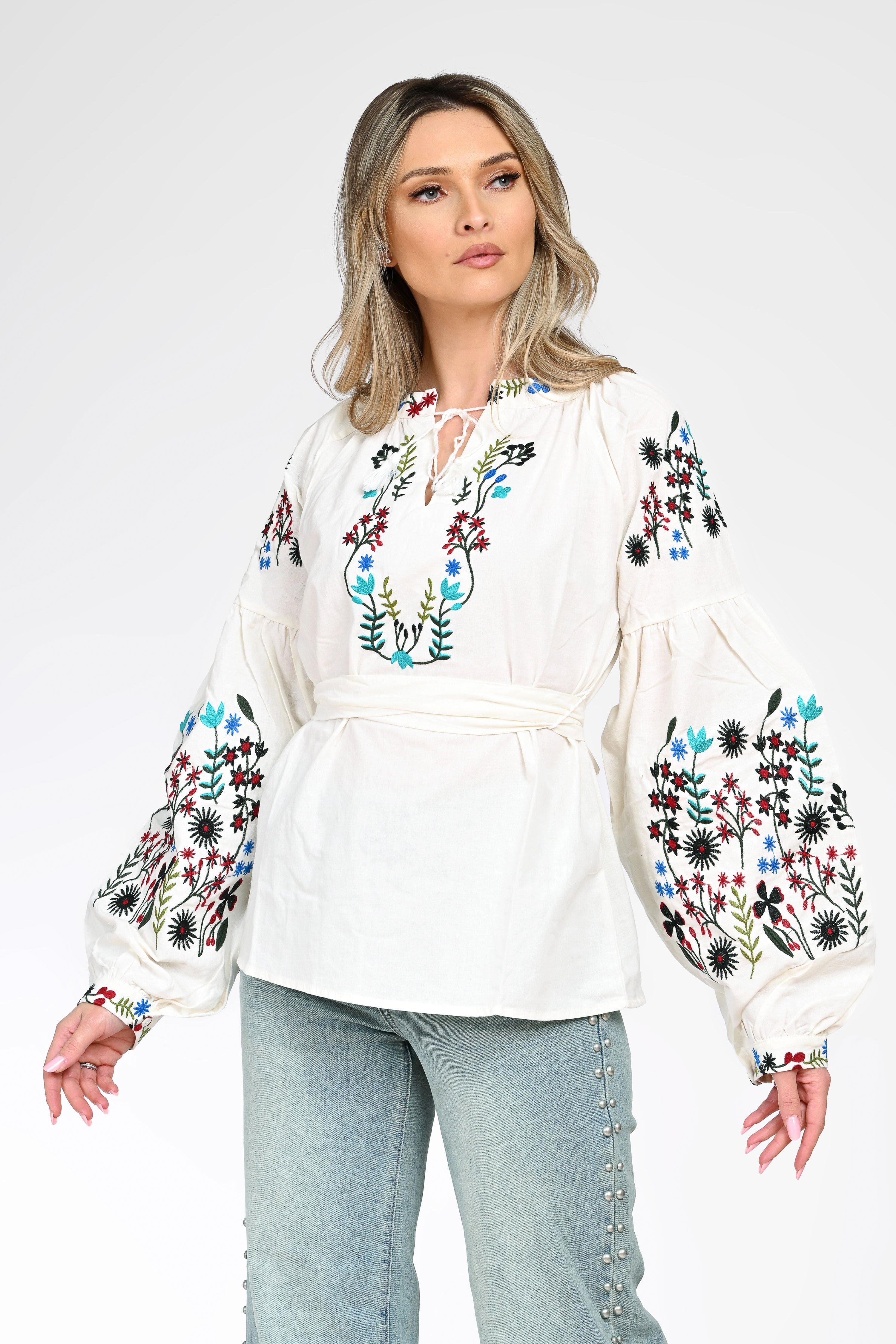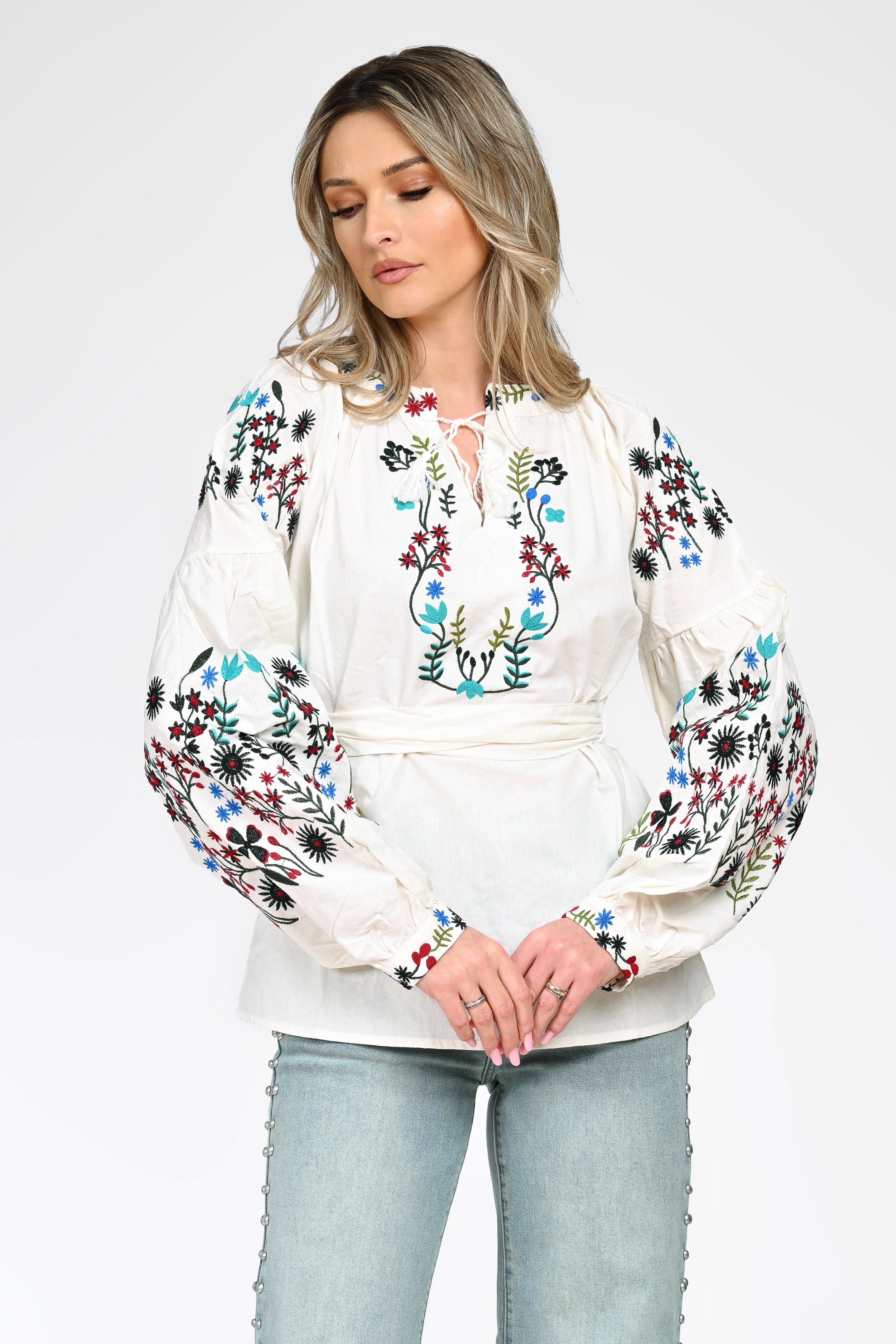 Ie brodată damă realizată din material lejer, cu textură naturală, ideală pentru un look feminin și autentic. Modelul impresionează prin broderia florală multicoloră, aplicată generos pe piept și pe mânecile lungi, bufante, inspirată din motive tradiționale românești.