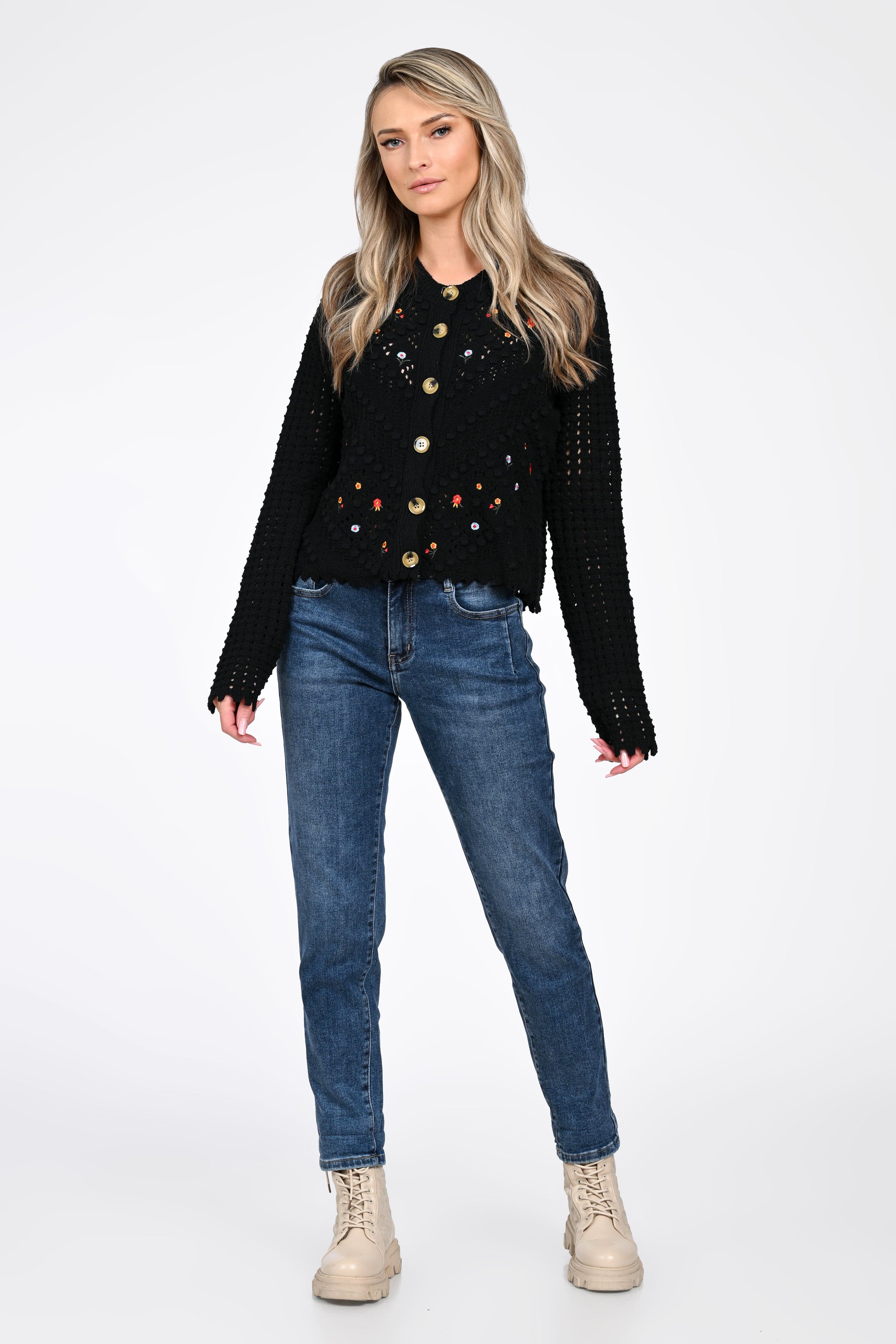 Cardiganul damă negru Eliana este o piesă statement, realizată dintr-un tricotaj bogat, cu textură reliefată și detalii atent lucrate. Materialul cu conținut ridicat de bumbac oferă confort și respirabilitate, ideal pentru purtare zilnică. Broderiile florale colorate adaugă un aer romantic și rafinat, în timp ce nasturii mari aurii creează un contrast elegant. Croiala scurtă și ușor evazată îl transformă într-un articol versatil, perfect pentru ținute casual chic sau pentru a aduce un plus de stil unui outfit simplu.