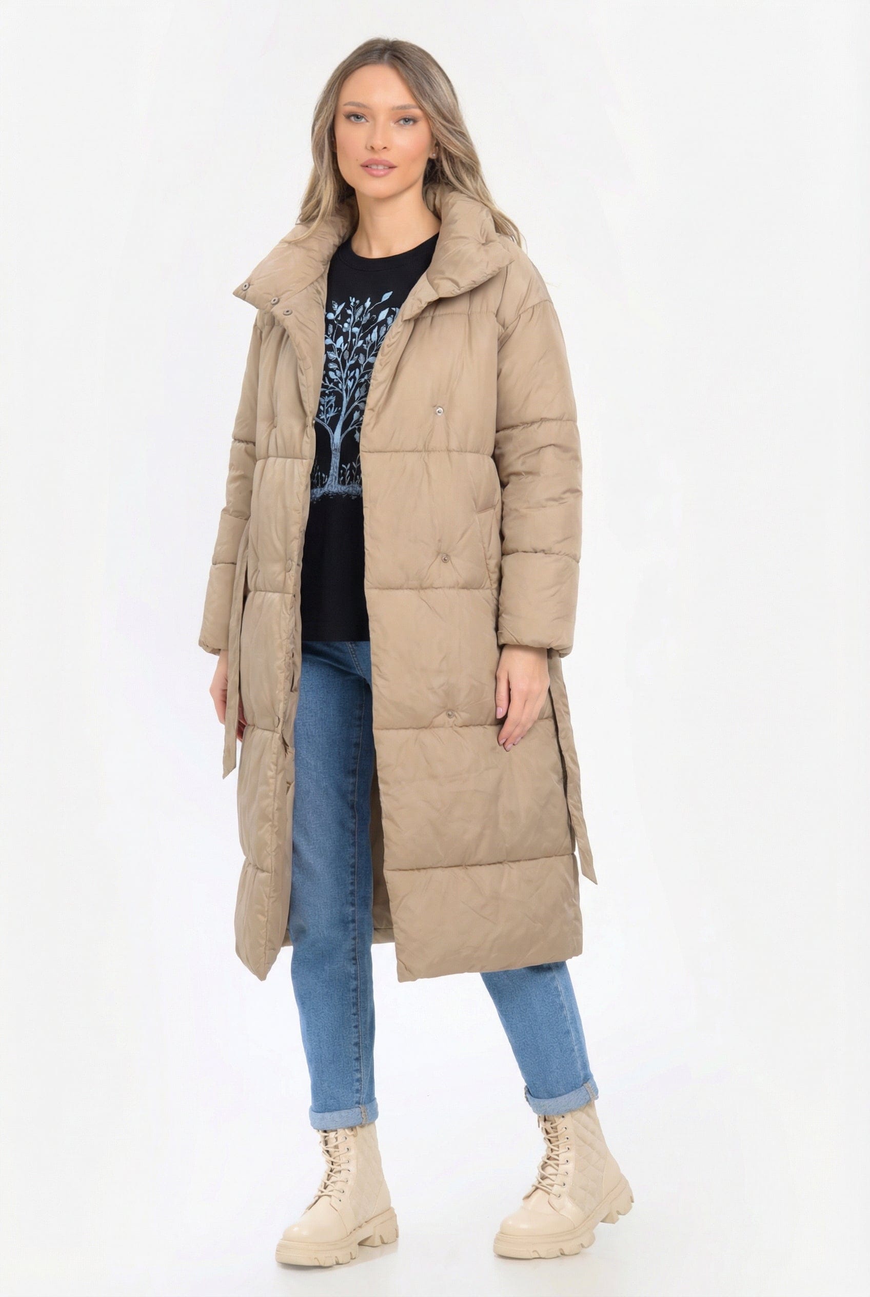 Este realizată într-o nuanță neutră de bej/camel, ușor de asortat, și are o croială dreaptă, lejeră, care oferă confort și libertate de mișcare. Lungimea ajunge sub genunchi, asigurând protecție sporită împotriva frigului.