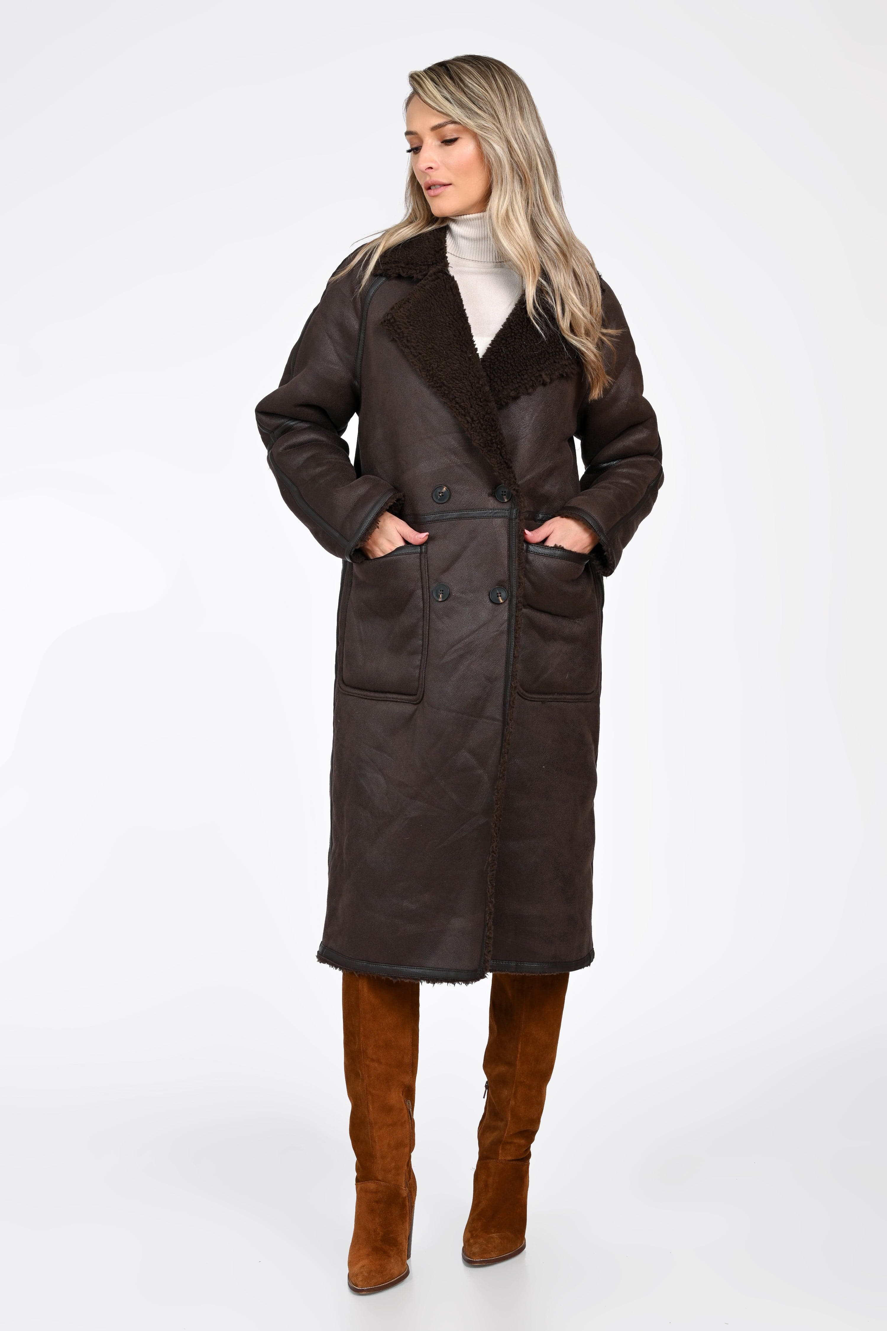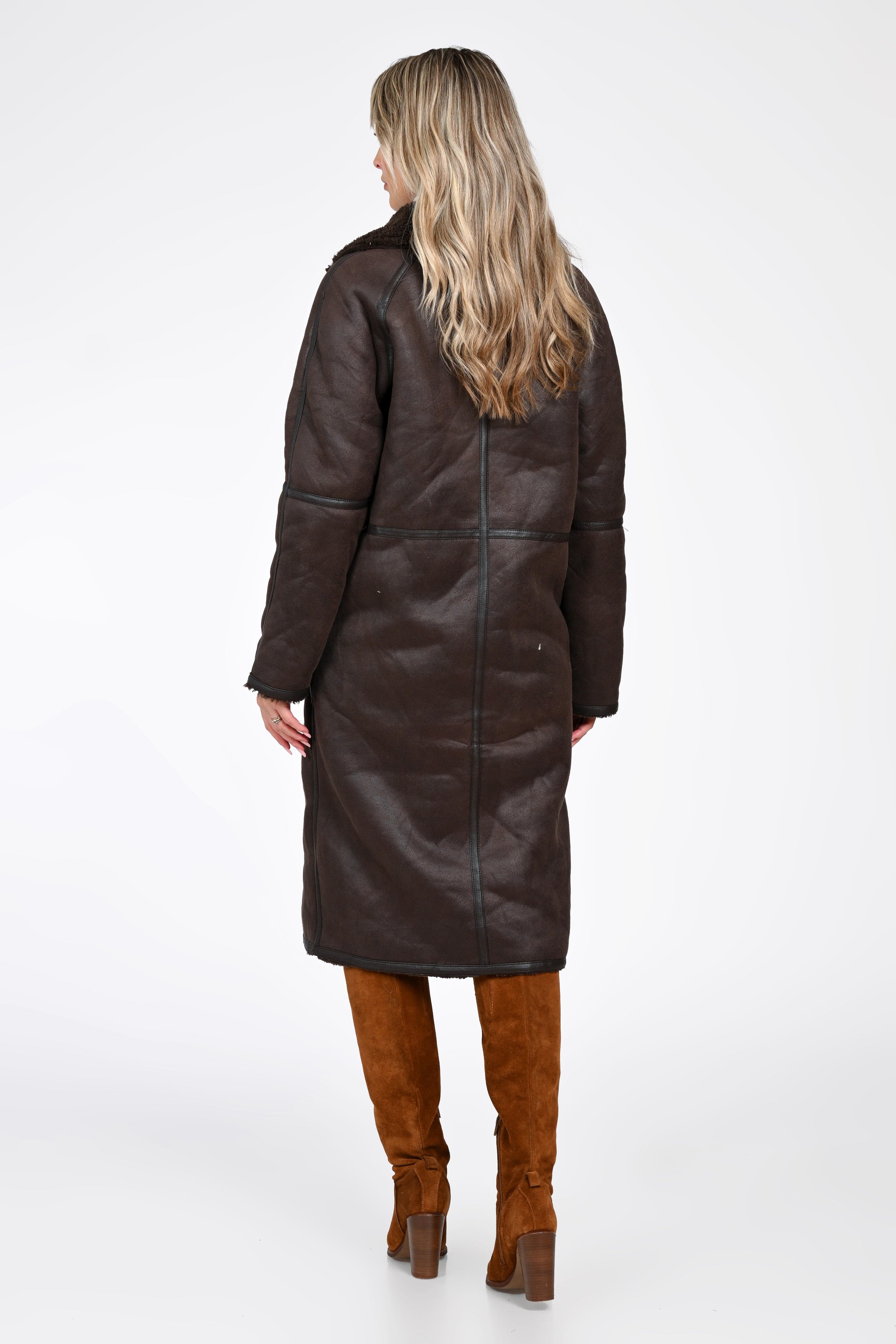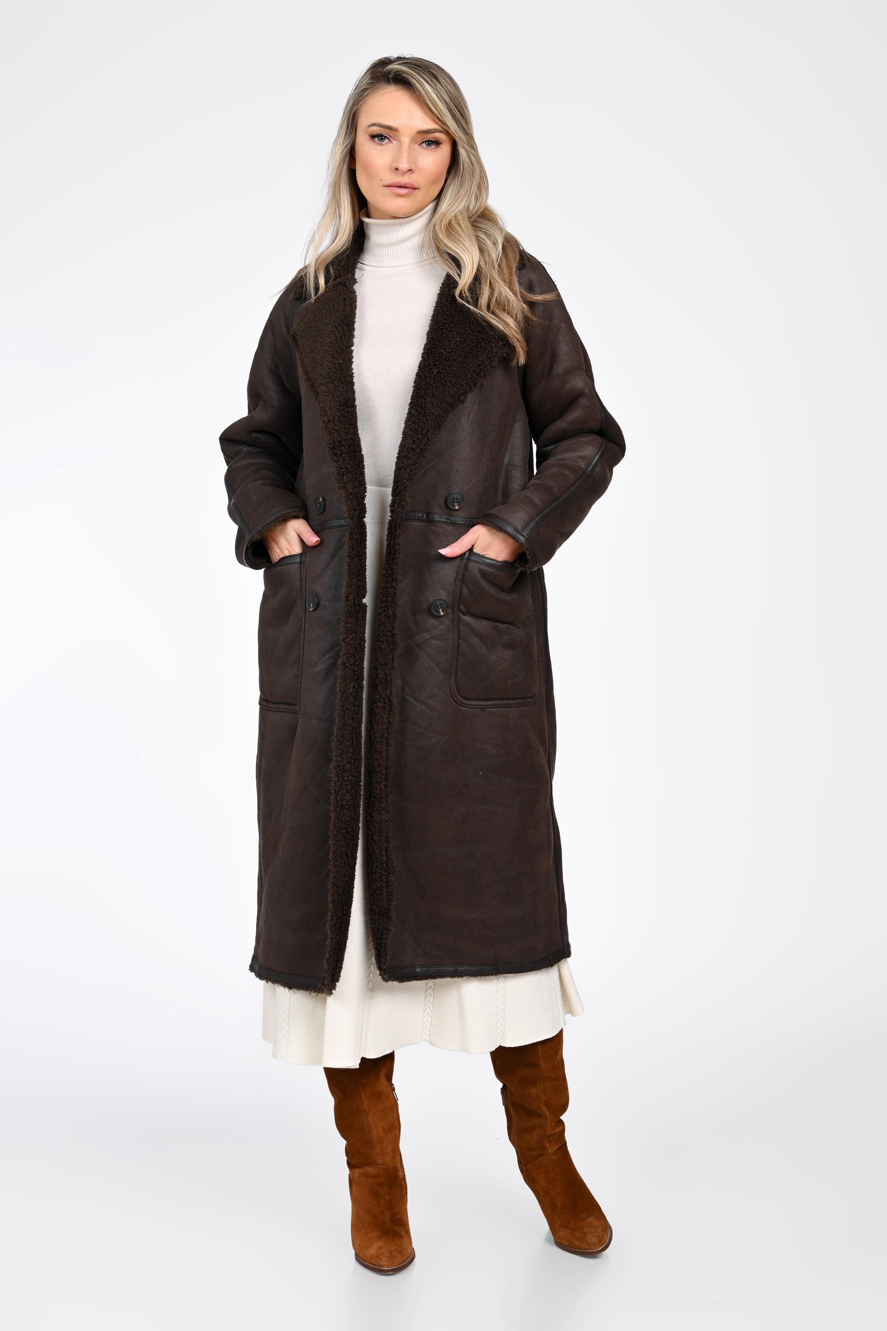 Haina tip cojoc Mara aduce în garderoba ta combinația ideală dintre stil autentic, confort premium și protecție termică impecabilă. Realizat dintr-un material tip shearling, cu interior moale și călduros, acest palton lung în nuanță de maro închis este alegerea perfectă pentru iernile reci și zilele în care vrei să îți păstrezi eleganța fără compromisuri.