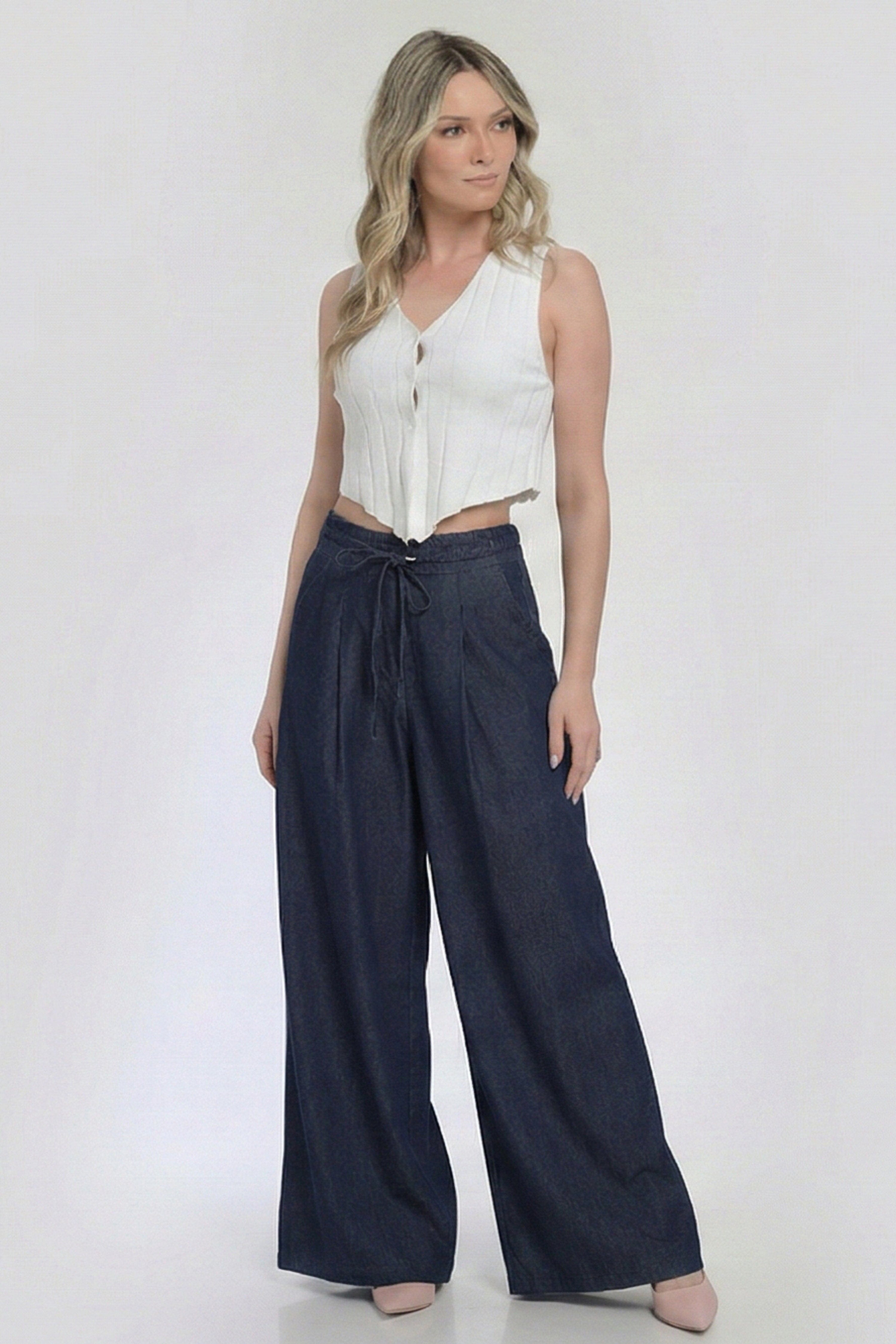 Pantalon damă Monaco se remarcă prin croiala wide leg și talia înaltă care alungește vizual silueta. Realizați într-o nuanță elegantă de bleumarin închis, acești pantaloni din denim lejer oferă confort și fluiditate în mișcare. Sistemul de închidere este completat de șnur în talie, pentru un plus de stil și ajustare practică. Modelul amplu pe picior îi face ideali pentru ținute casual chic, office relaxat sau combinații moderne cu topuri scurte și sacouri.