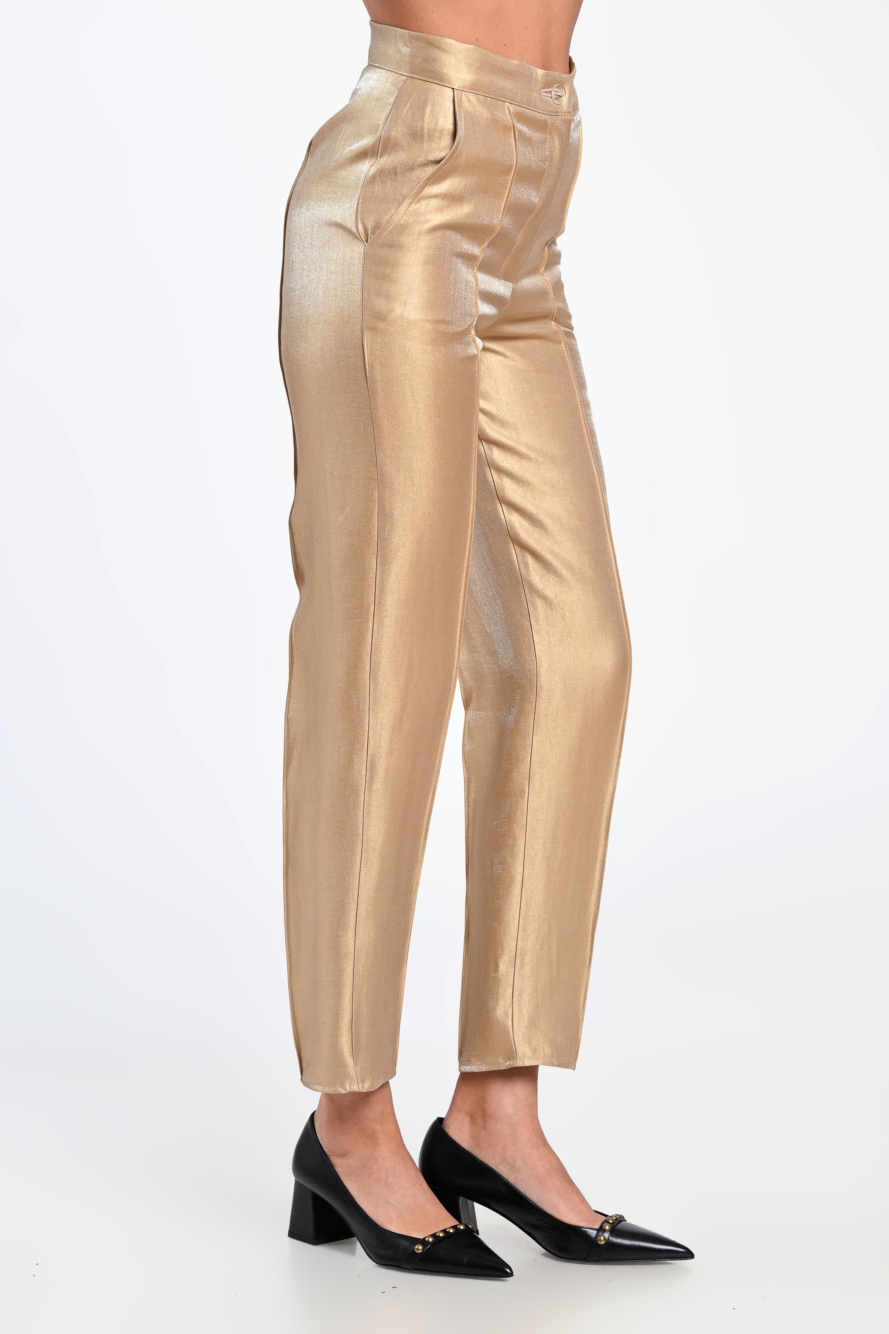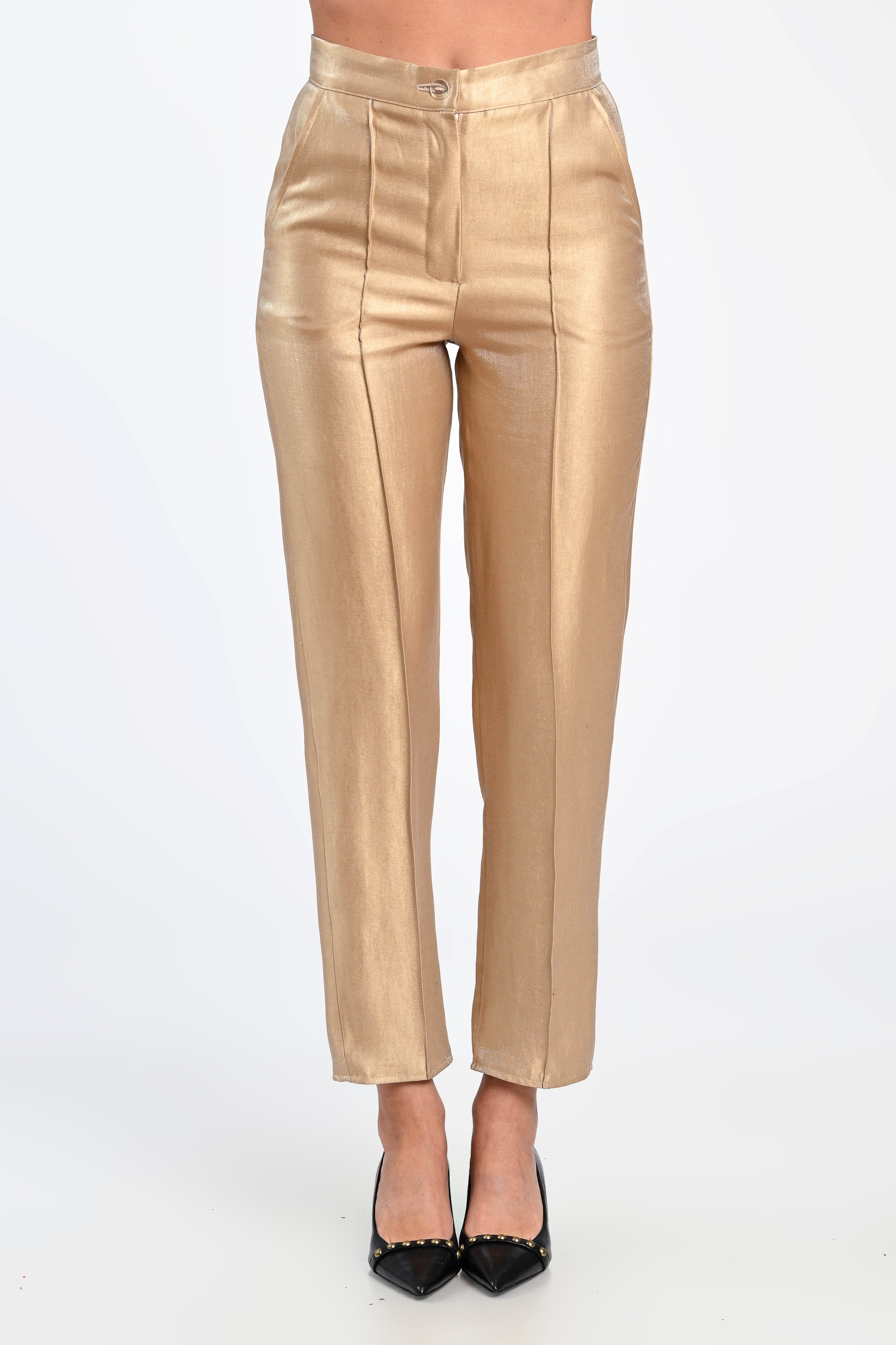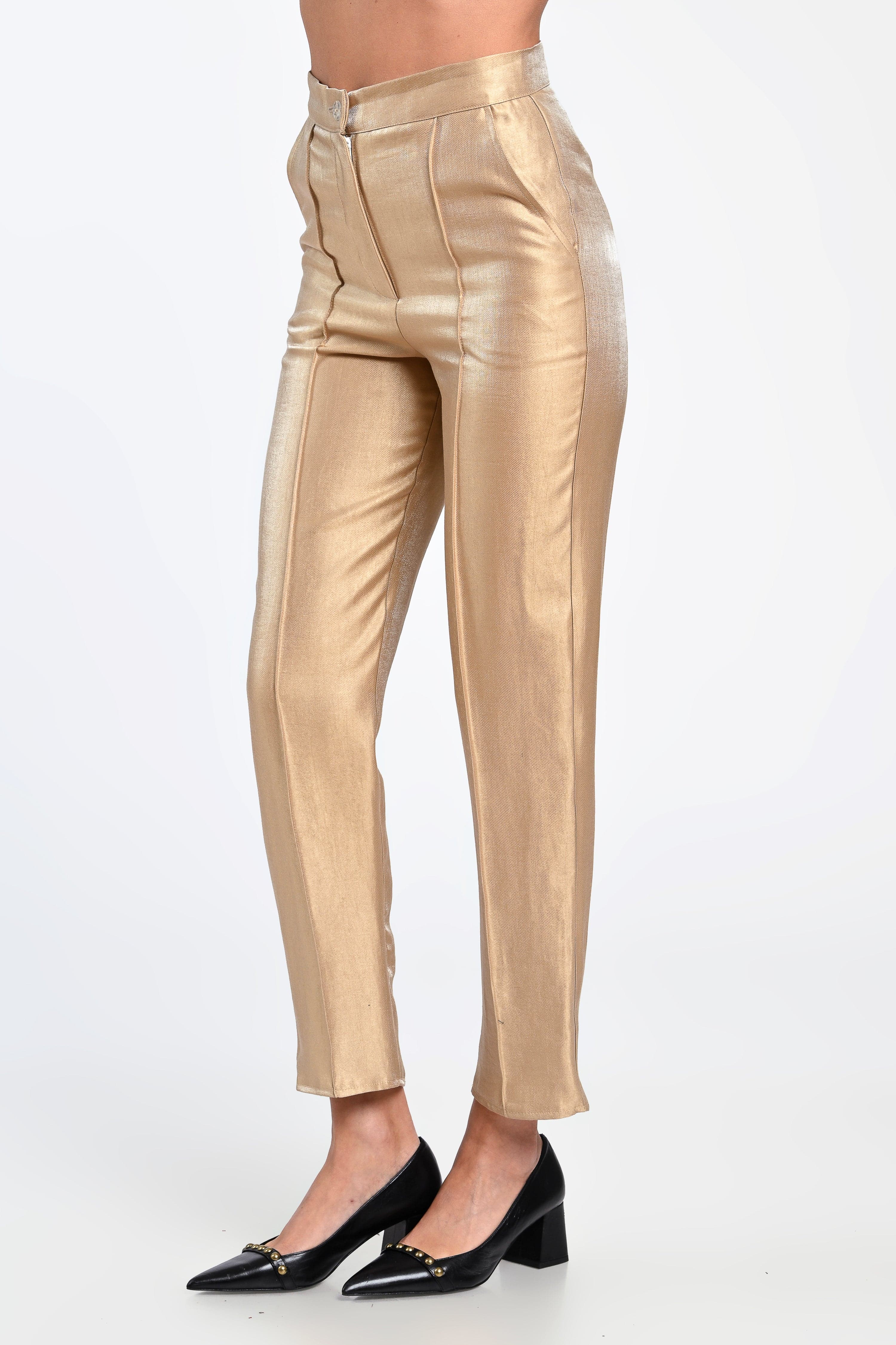 Pantalonii eleganti Paula sunt o piesă elegantă și rafinată, confecționați dintr-un material cu finisaj satinat, ce conferă un efect subtil metalizat. Culoarea auriu-champagne le oferă un aer luxos și sofisticat, potrivit pentru ținute de seară sau evenimente speciale. Croiala este dreaptă, cu talie înaltă, evidențiind silueta într-un mod armonios. Prezintă dungi verticale cusute pe față, care alungesc optic picioarele și adaugă un plus de eleganță. Închiderea se face discret, cu fermoar și nasture ascuns, iar buzunarele laterale adaugă un detaliu practic fără a compromite rafinamentul designului.
