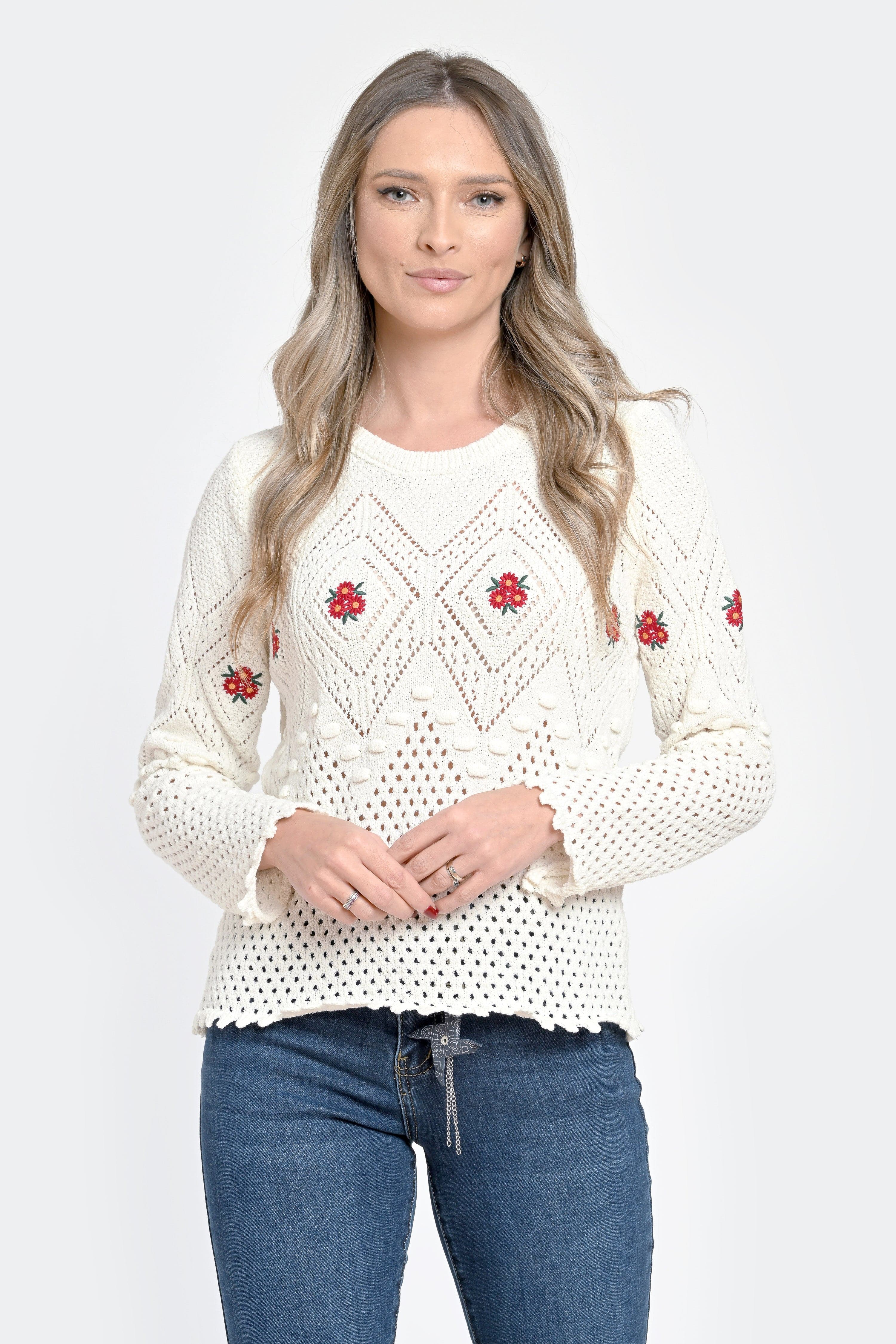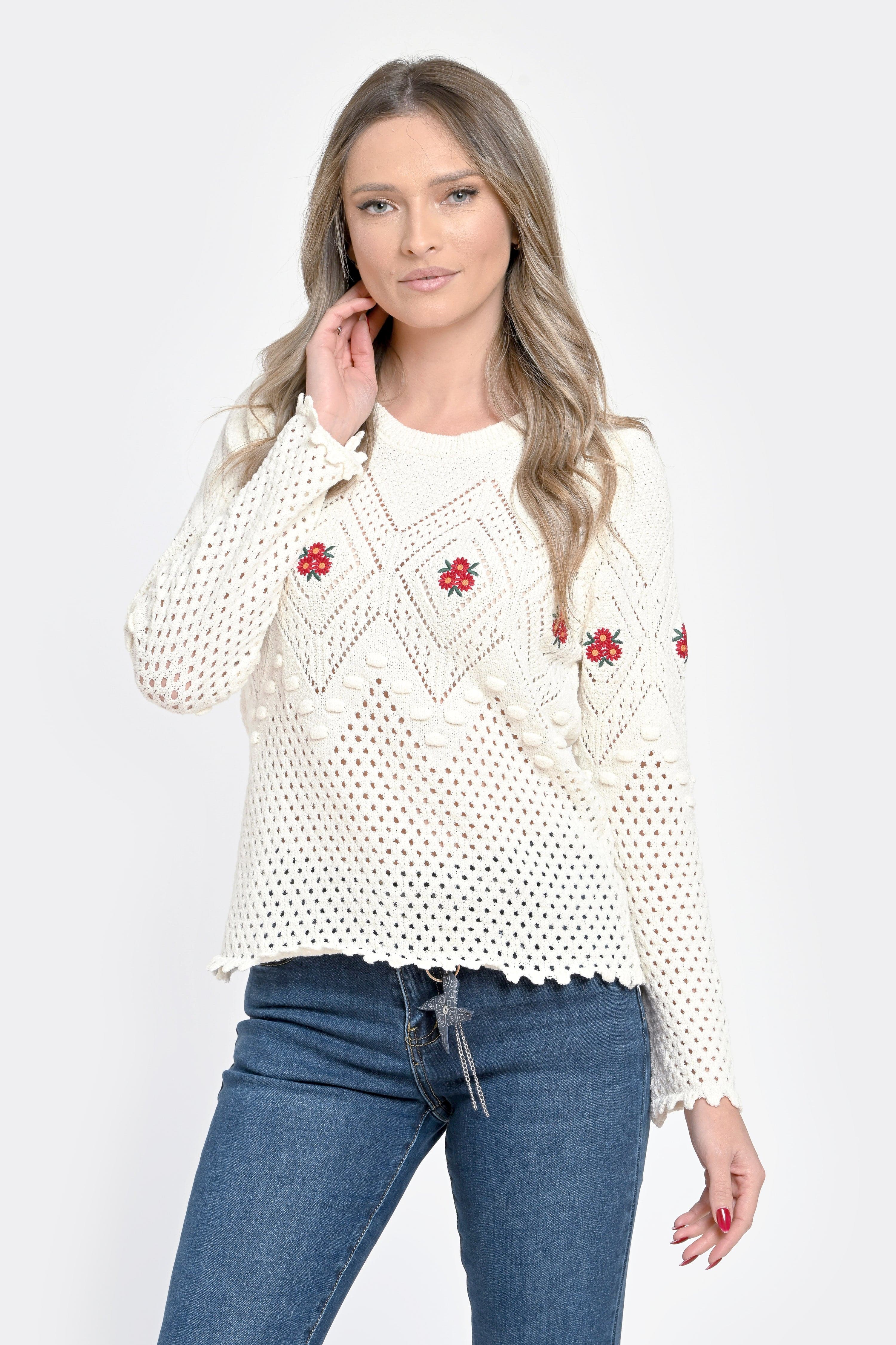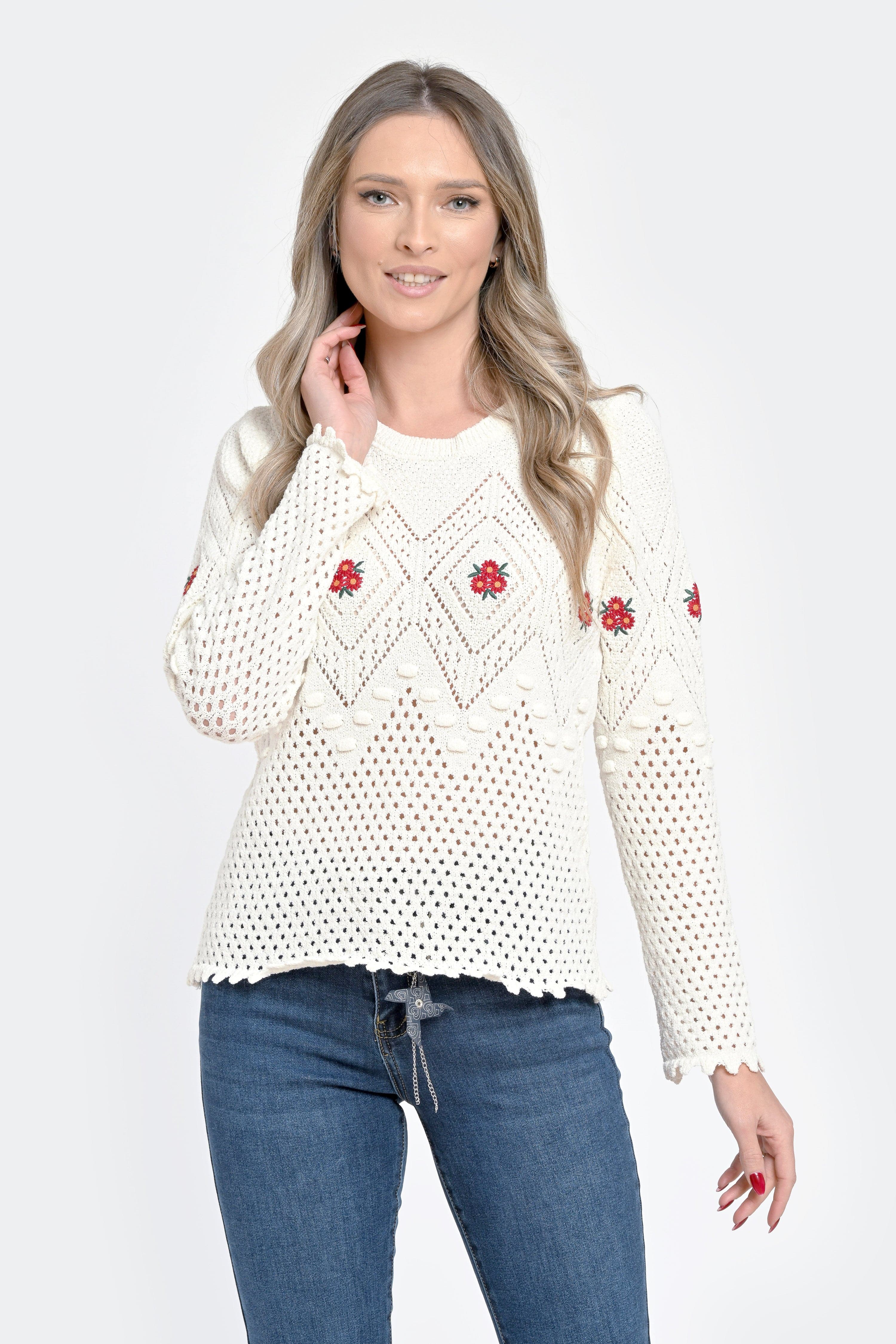 Pulover damă alb tricotat cu flori roșii