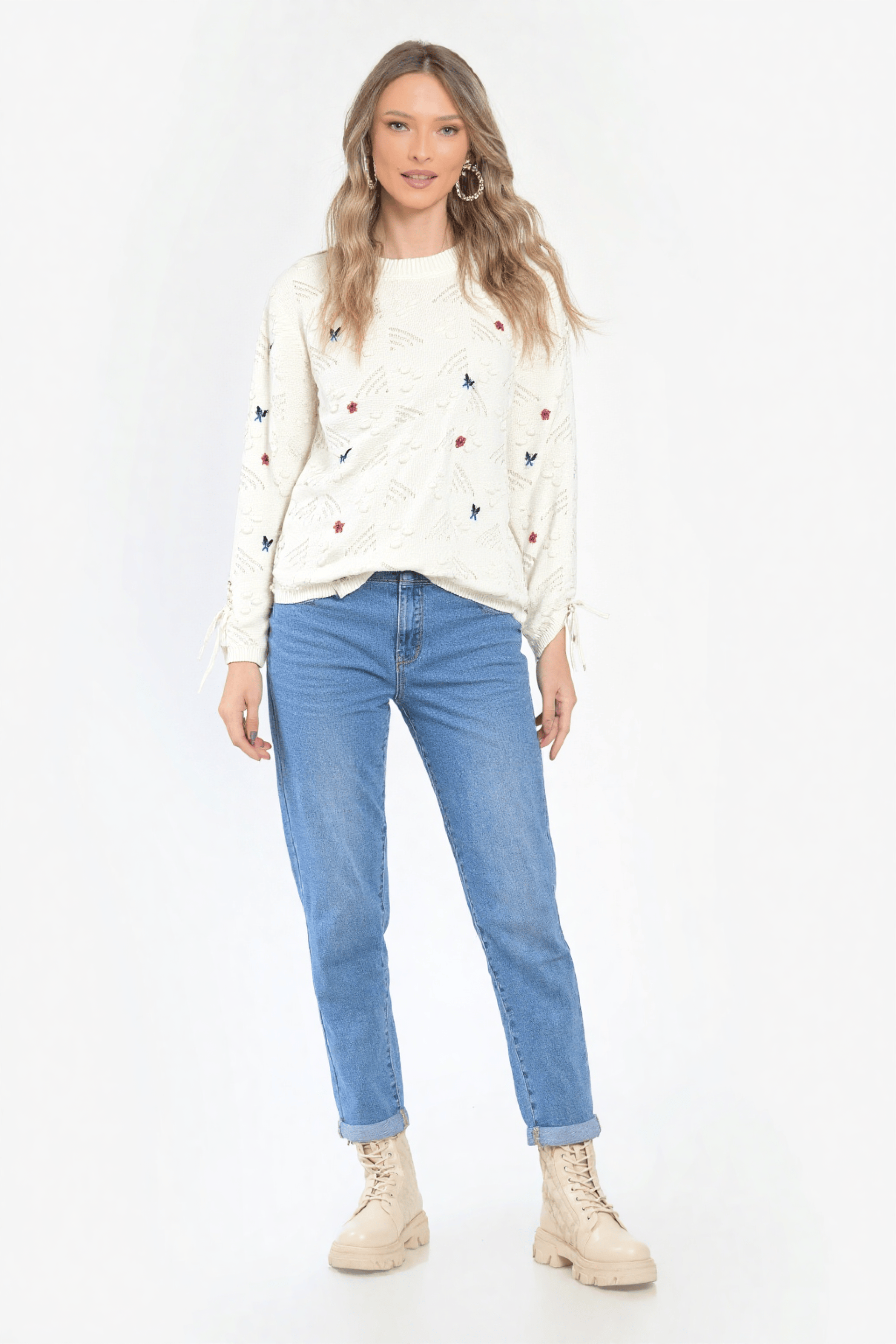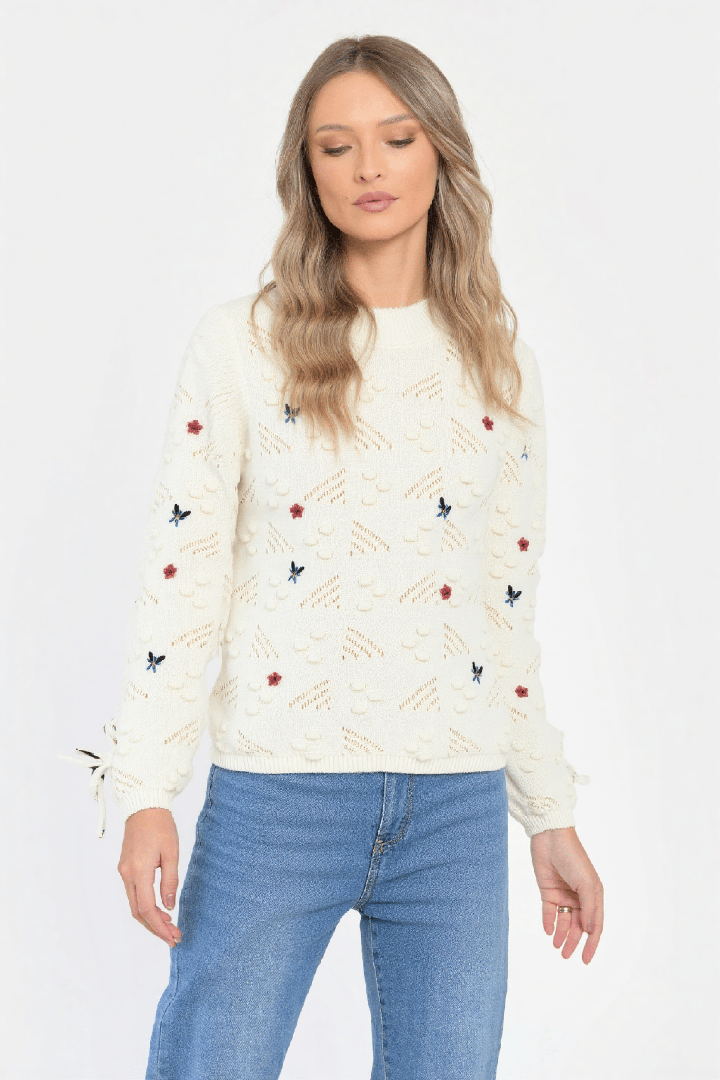 Pulover crem din tricot moale, cu model texturat și detalii florale colorate brodate. Are croială lejeră, mâneci decorate cu fundițe delicate și terminatii elastice pentru un plus de confort. Un model feminin și jucăuș, perfect pentru zilele reci de toamnă și iarnă.