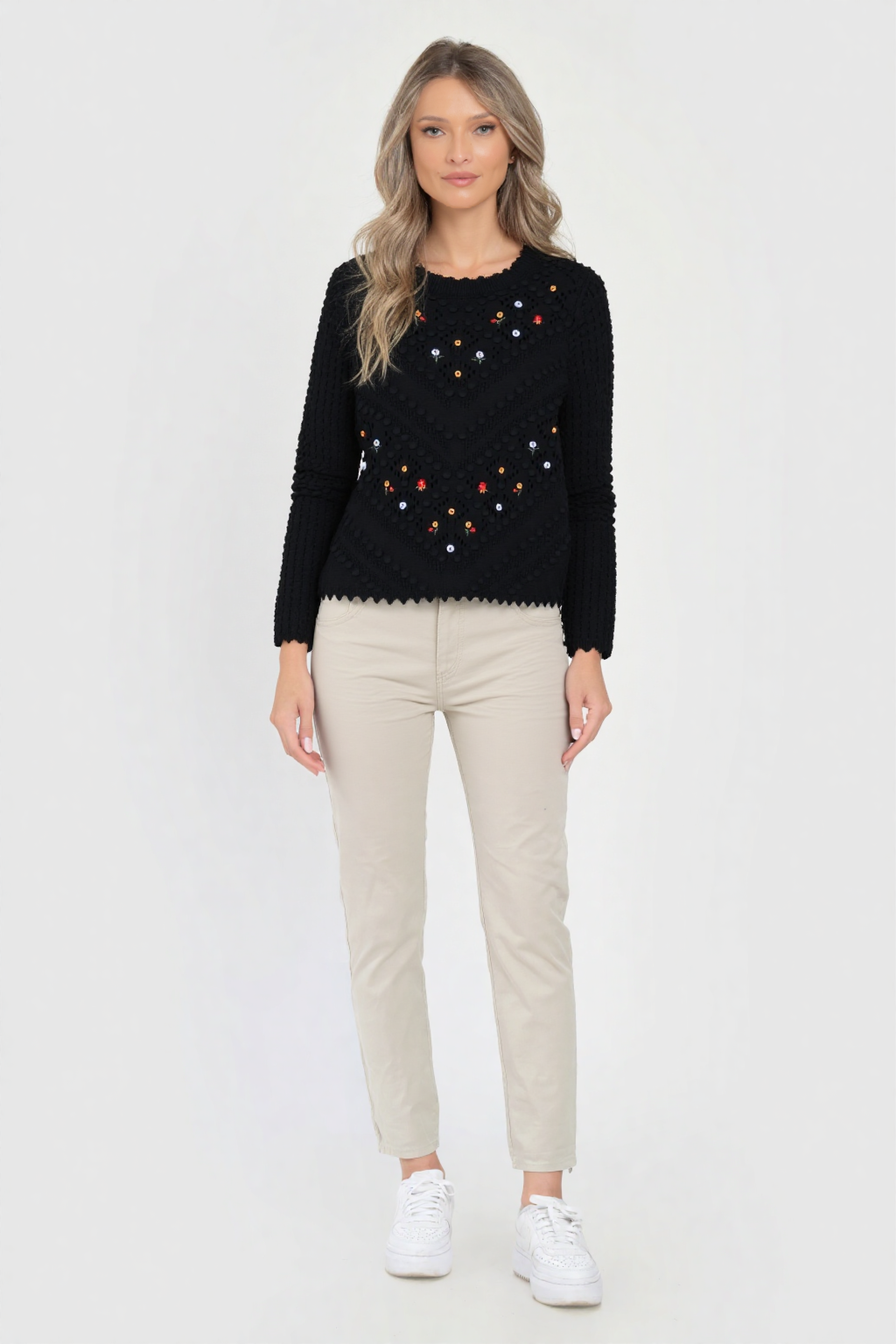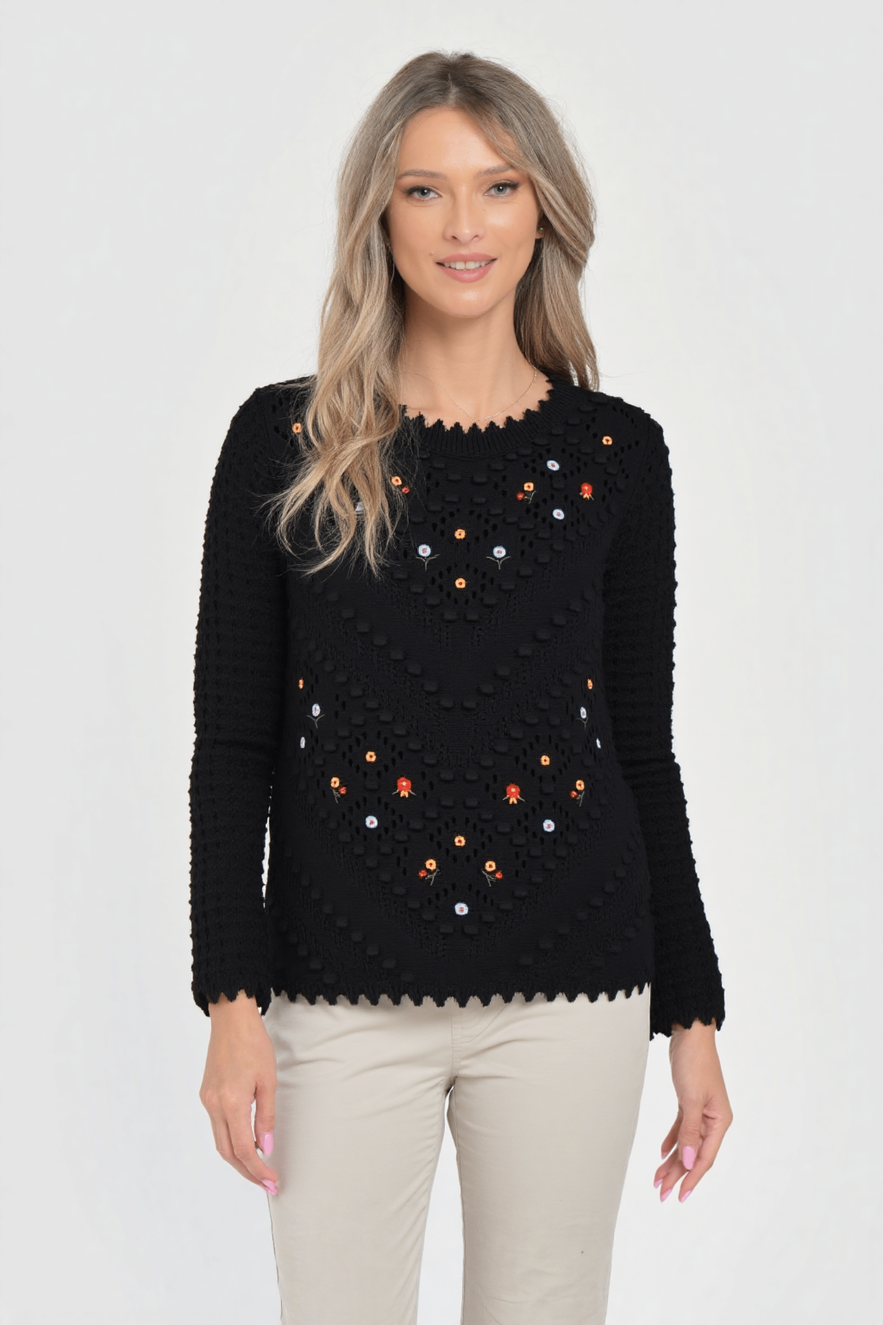 Pulover dama Gabriela negru cu flori brodate – un model elegant și versatil, confecționat dintr-un tricot moale, cu textură 3D și detalii florale delicate în nuanțe vii. Croiala clasică, cu decolteu rotund și margini finisate ondulat, îl face ideal pentru ținute casual-chic sau office, adăugând o notă feminină oricărei apariții.