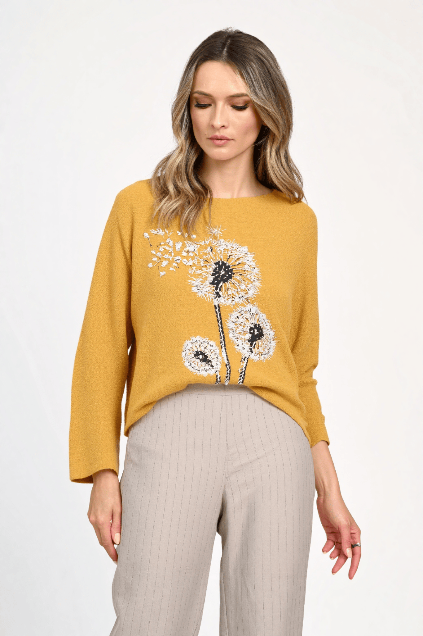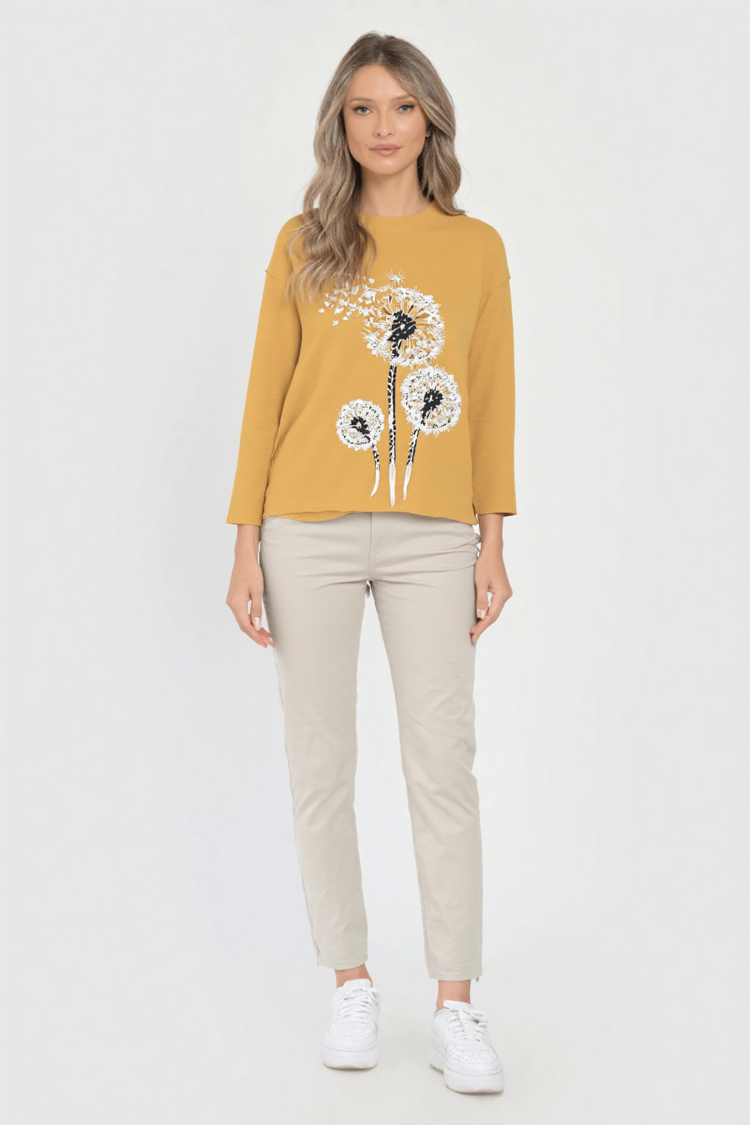 Pulover damă galben-muștar Anastasia este plin de optimism și energie, acest pulover galben-muștar aduce un strop de veselie în garderoba de sezon. Imprimeul delicat cu păpădii albe și accente negre oferă o notă artistică și feminină, perfectă pentru femeile care iubesc detaliile fine. Croiala lejeră și materialul moale asigură confortul zilnic, iar nuanța caldă este ușor de integrat în ținute casual sau smart-casual.