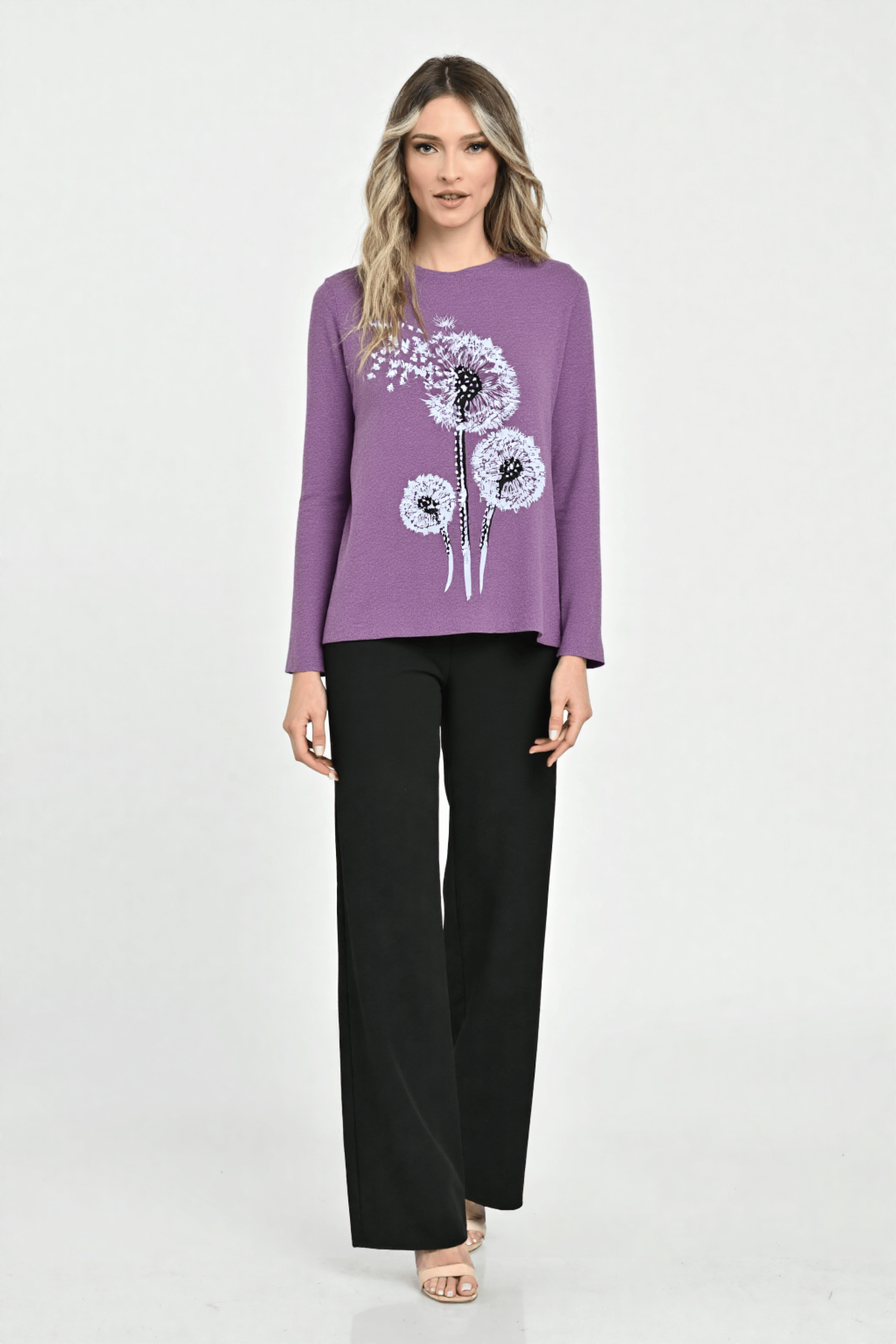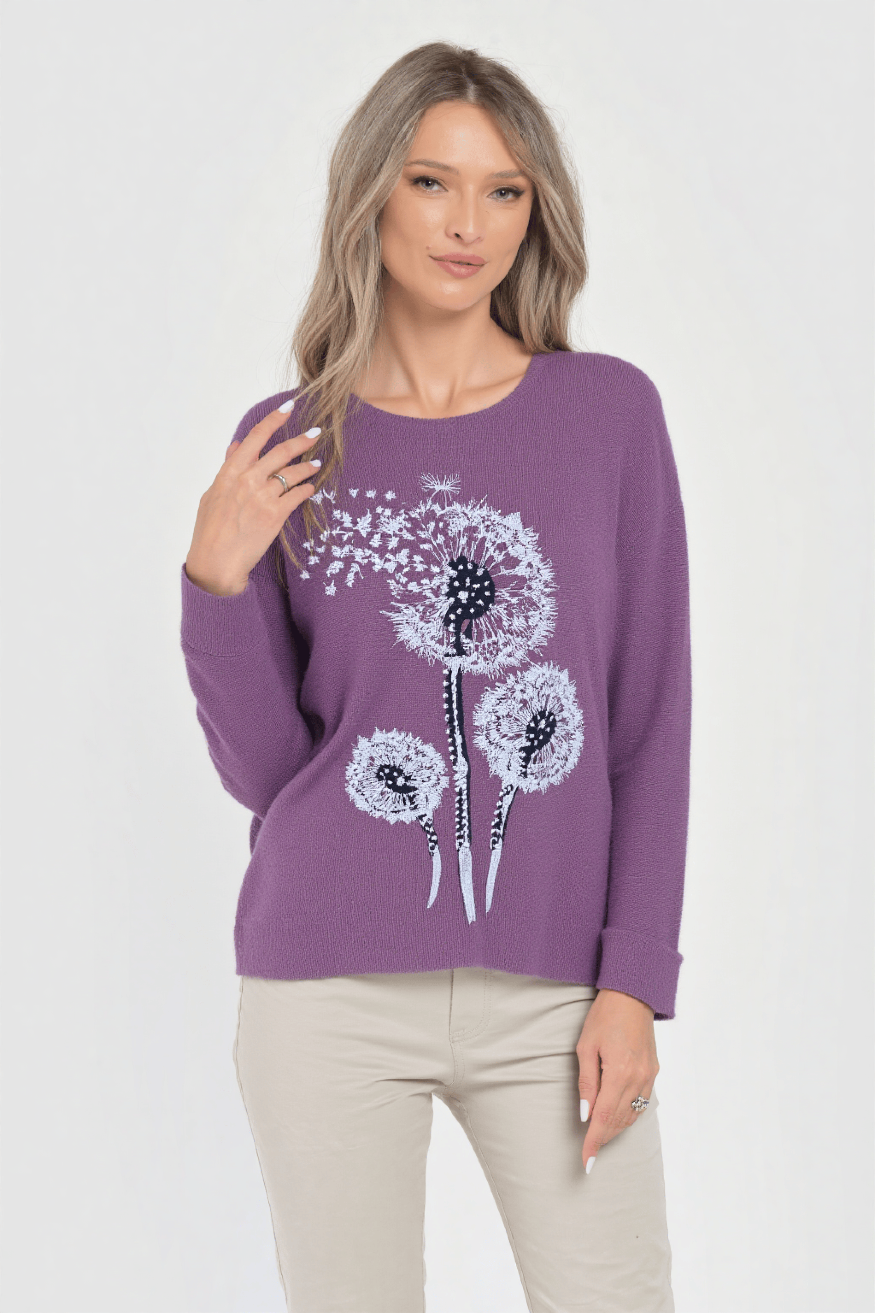 Pulover damă mov Carina feminin și rafinat, în nuanță de mov delicat, decorat cu imprimeu artistic de păpădii – simbol al libertății și visării. Confecționat dintr-un material moale, plăcut la atingere, oferă confort și eleganță în același timp. Croiala lejeră și manșetele fine îi conferă un aer modern, perfect pentru ținute casual-chic sau de birou.
