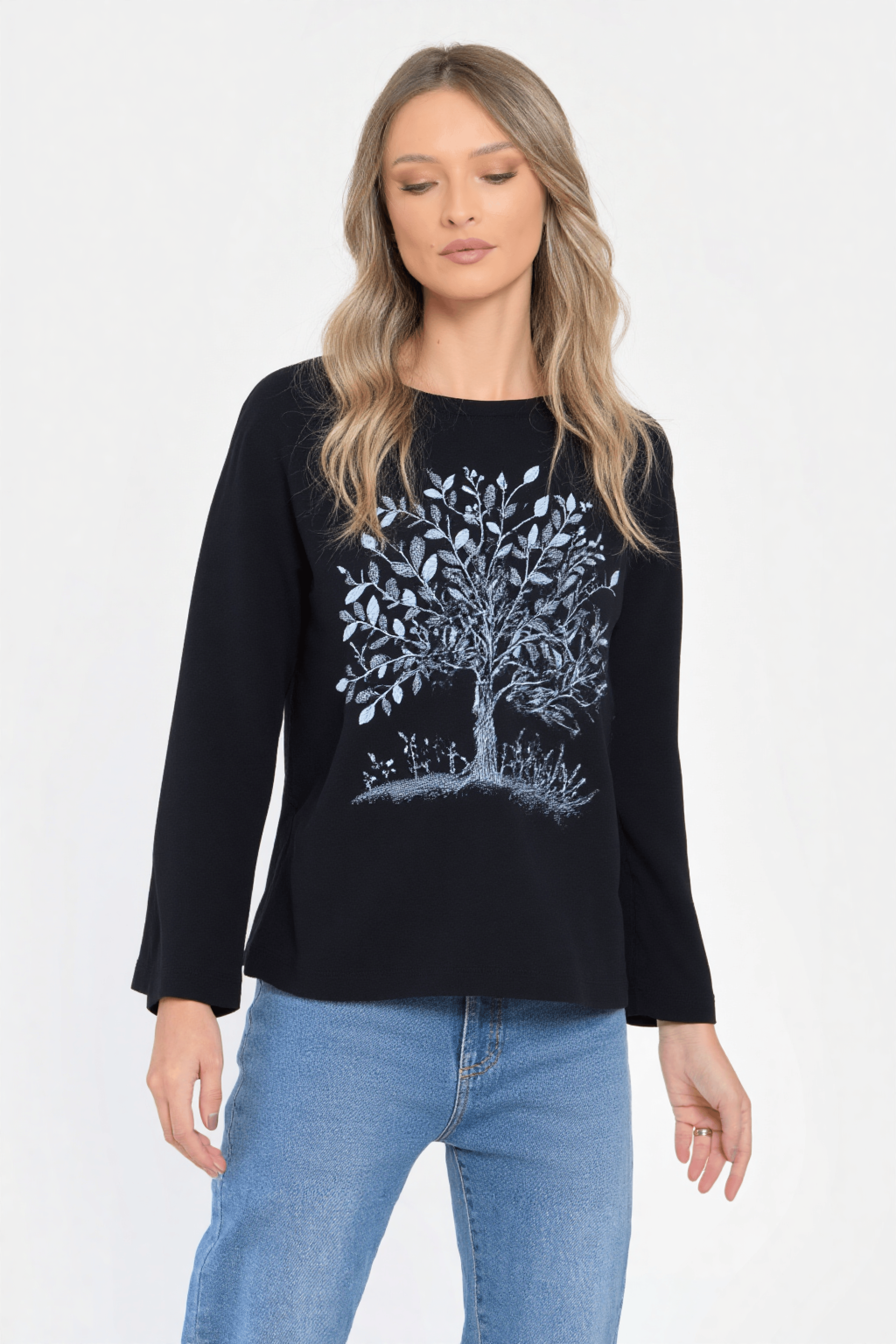 Rafinat și versatil, acest pulover negru se remarcă prin imprimeul argintiu în formă de arbore, un detaliu elegant ce adaugă un plus de stil oricărei ținute. Confecționat dintr-un material moale și plăcut la atingere, oferă confort pe tot parcursul zilei. Croiala lejeră și designul minimalist îl fac ușor de integrat atât în outfituri casual, cât și în combinații elegante. O piesă esențială pentru garderoba de sezon.