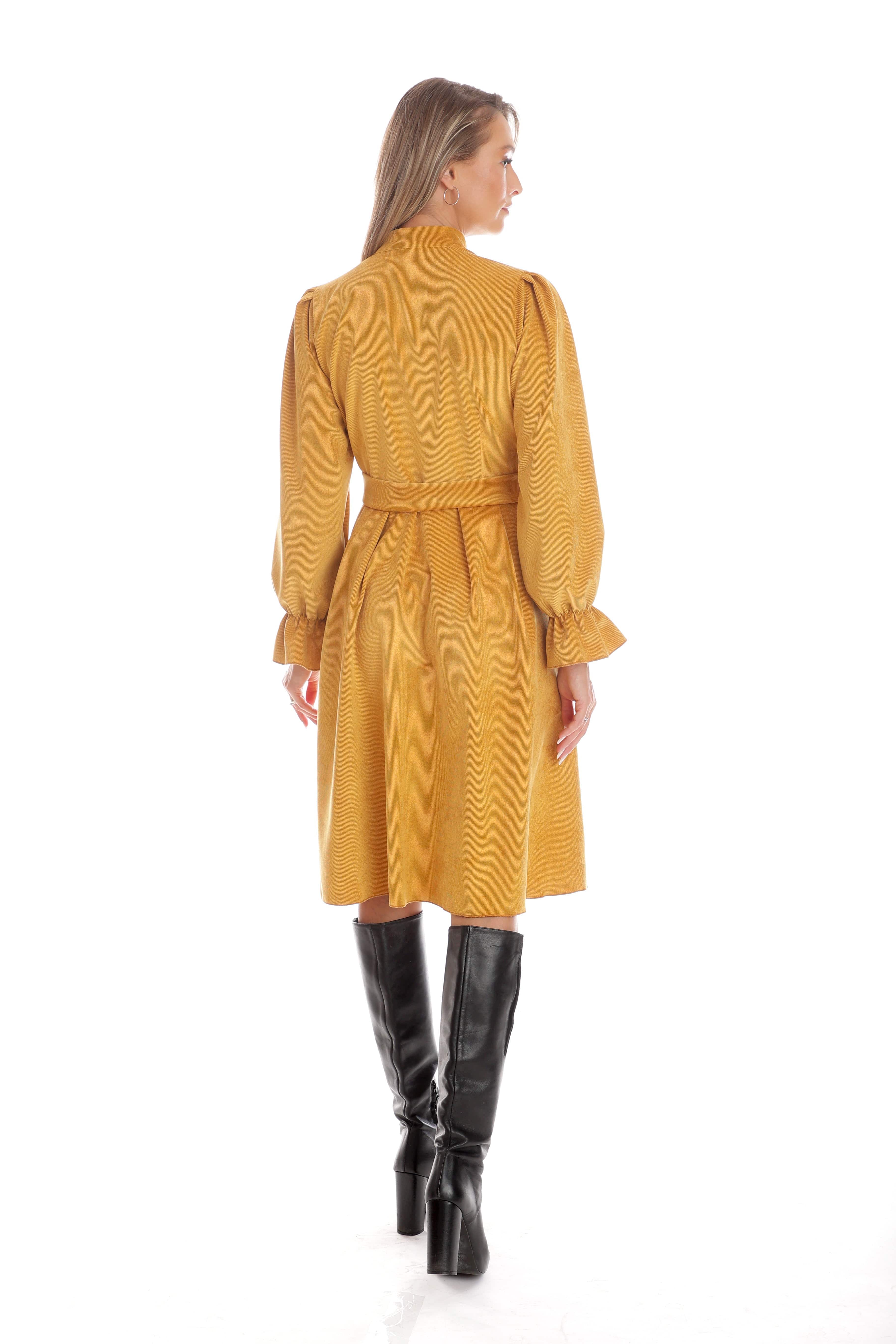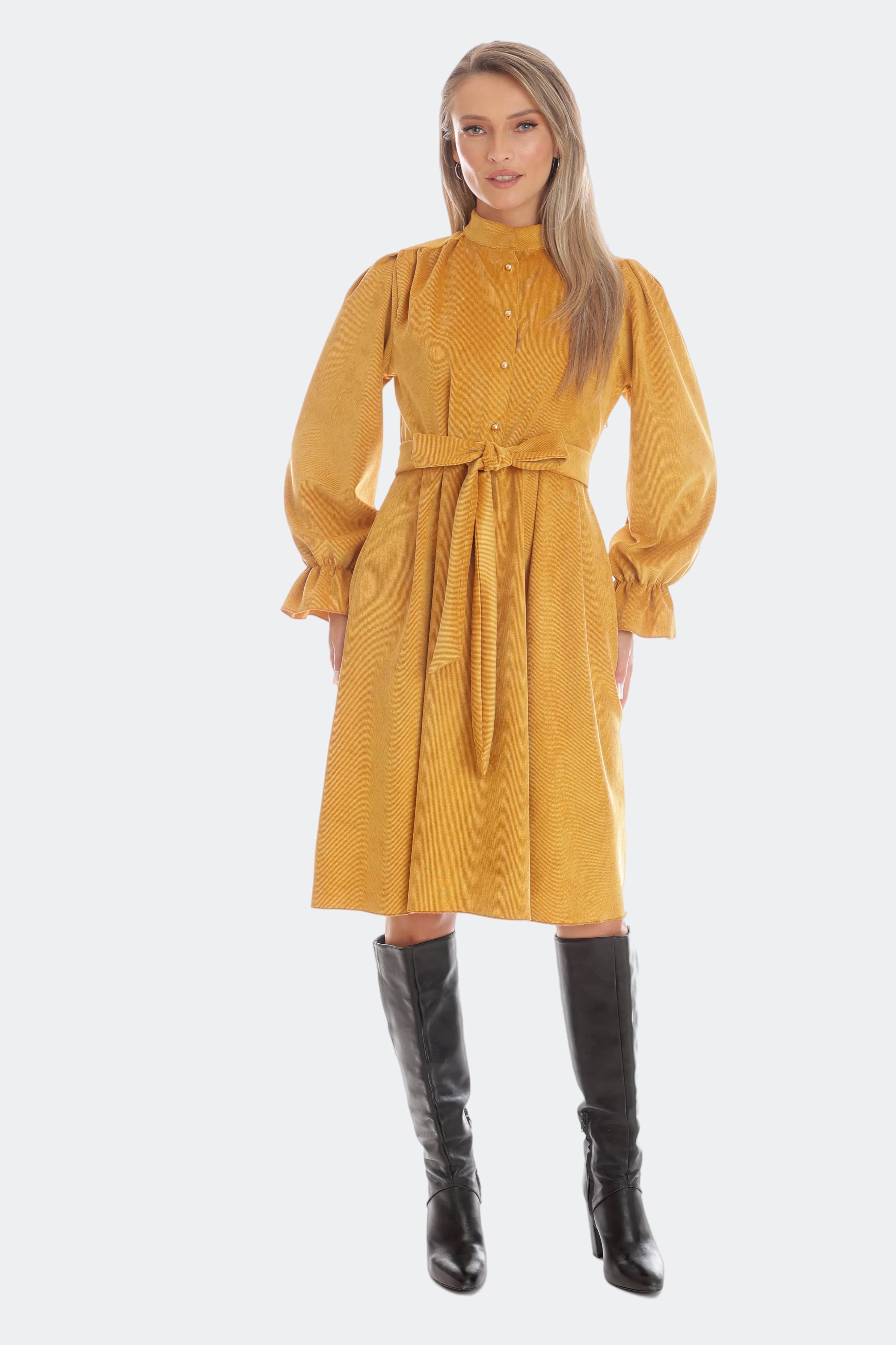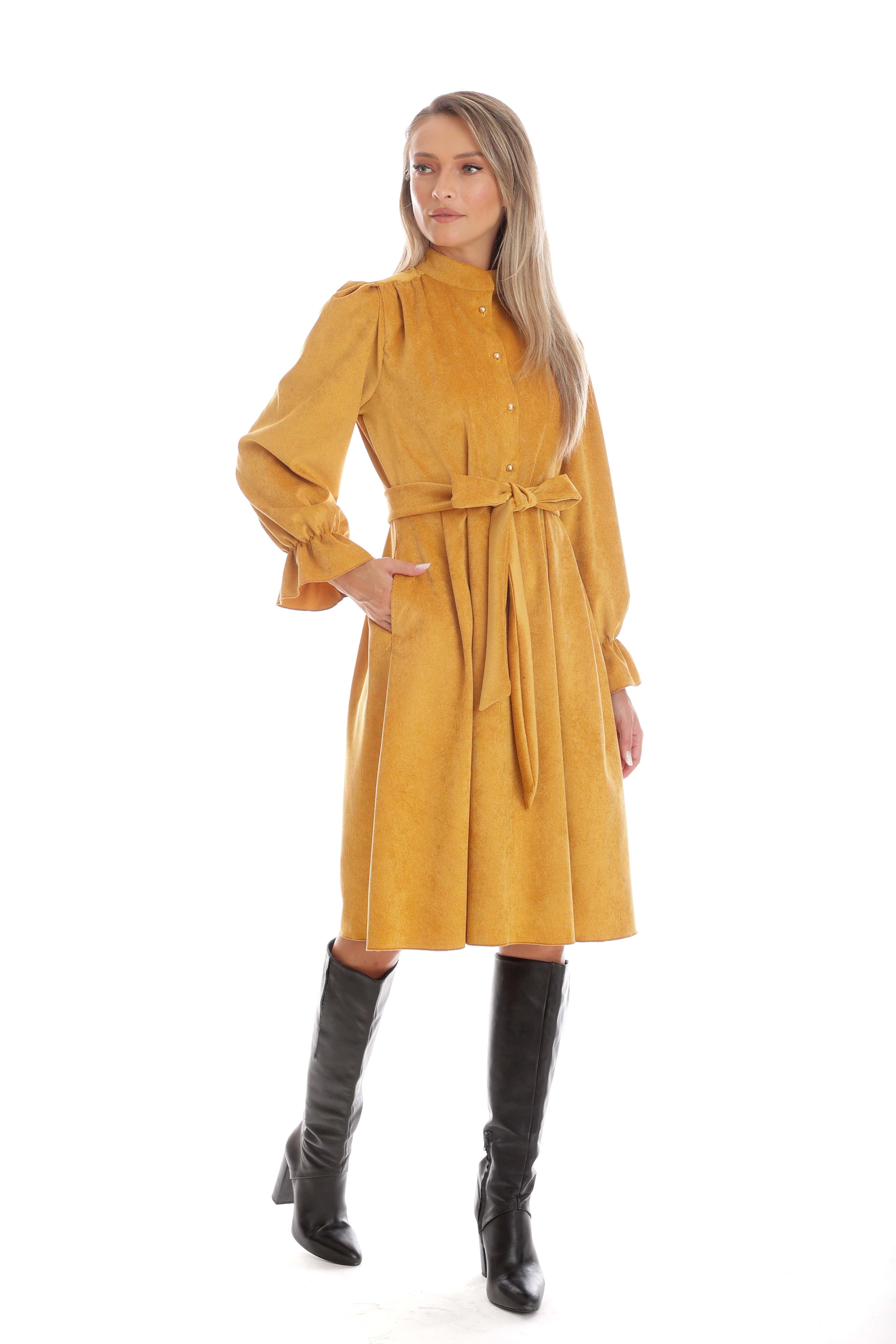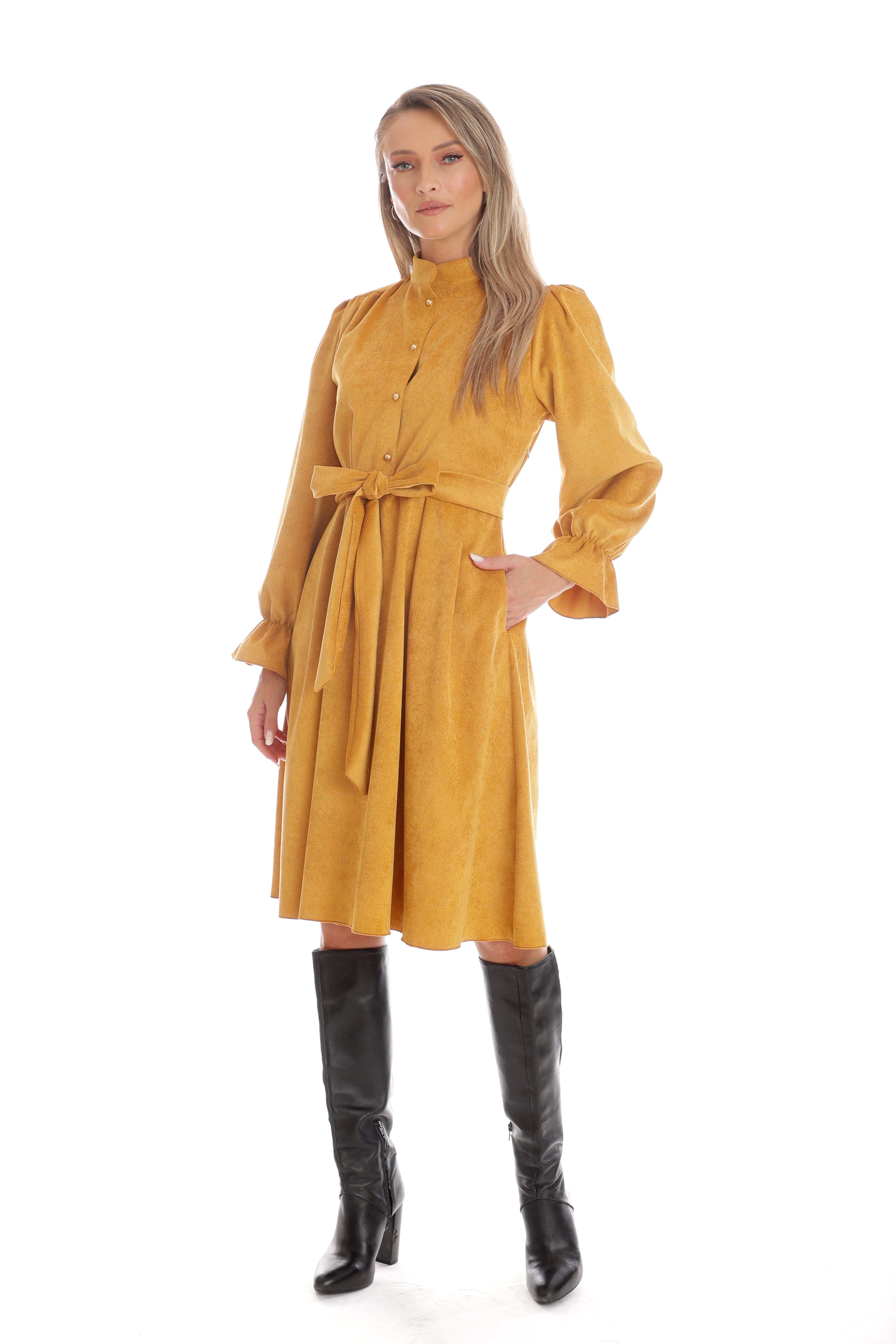 Rochia Amalia este alegerea ideală pentru zilele de toamnă, când îți dorești o apariție elegantă și plină de personalitate. Confecționată din catifea reiată moale, în nuanța intensă de muștar, are o croială midi cu nasturi discreți pe bust și cordon în talie, ce subliniază frumos silueta. Mânecile lungi, ușor bufante, cu manșete elegante, îi dau un aer rafinat și versatil. Rochia Amalia poate fi purtată atât la birou, cât și la evenimente de zi, fiind ușor de asortat cu cizme sau pantofi.