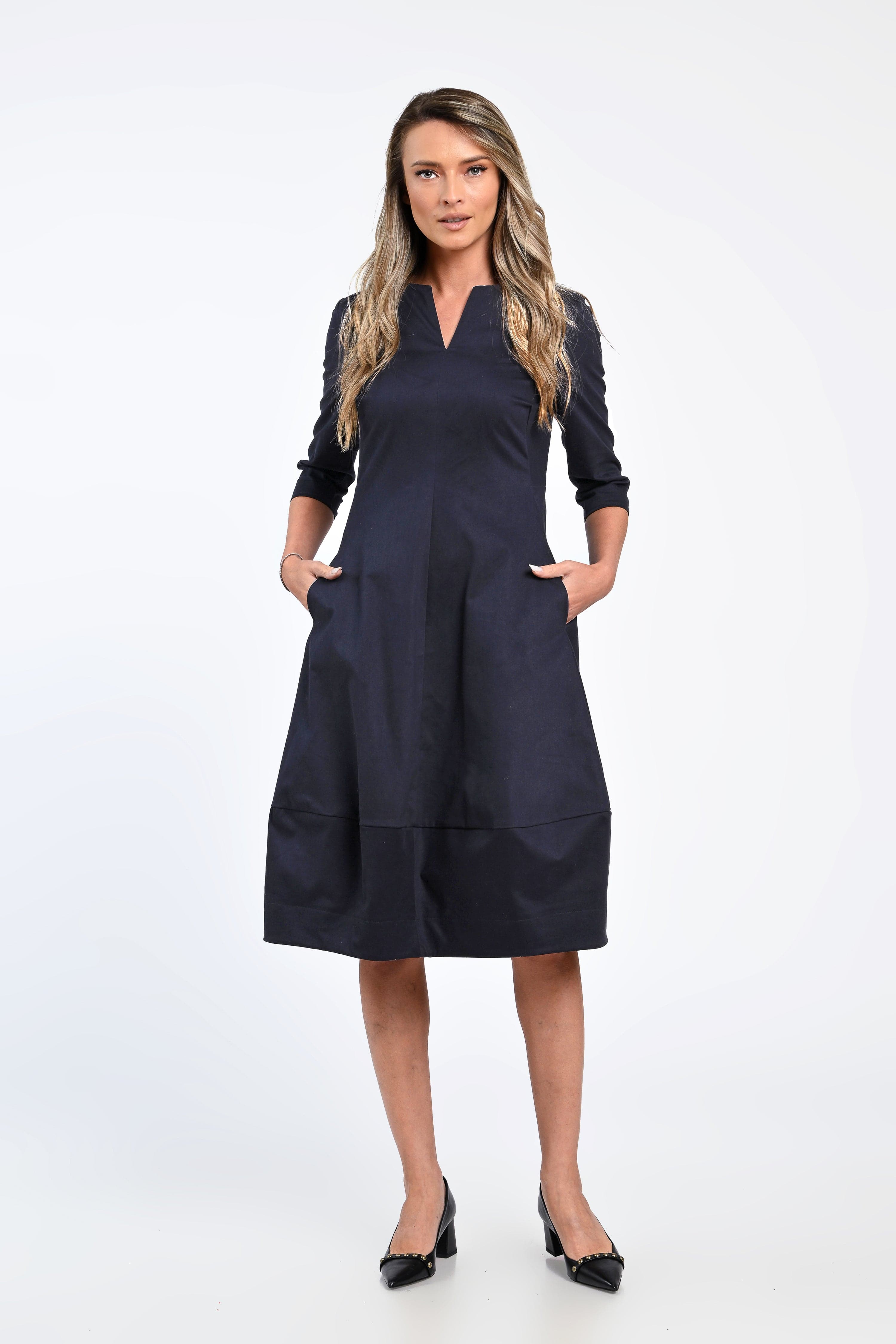 Rochia Clara cucerește prin simplitatea elegantă și rafinamentul discret al tonului bleumarin închis. Realizată dintr-o combinație de bumbac, poliester și elastan, oferă confort și o cădere frumoasă pe siluetă. Croiala lejeră, cu fermoar ascuns la spate și buzunare funcționale, o face ideală pentru zilele active la birou sau pentru o ieșire relaxată. Un model clasic reinterpretat, ce pune accent pe naturalețe și bun gust.
