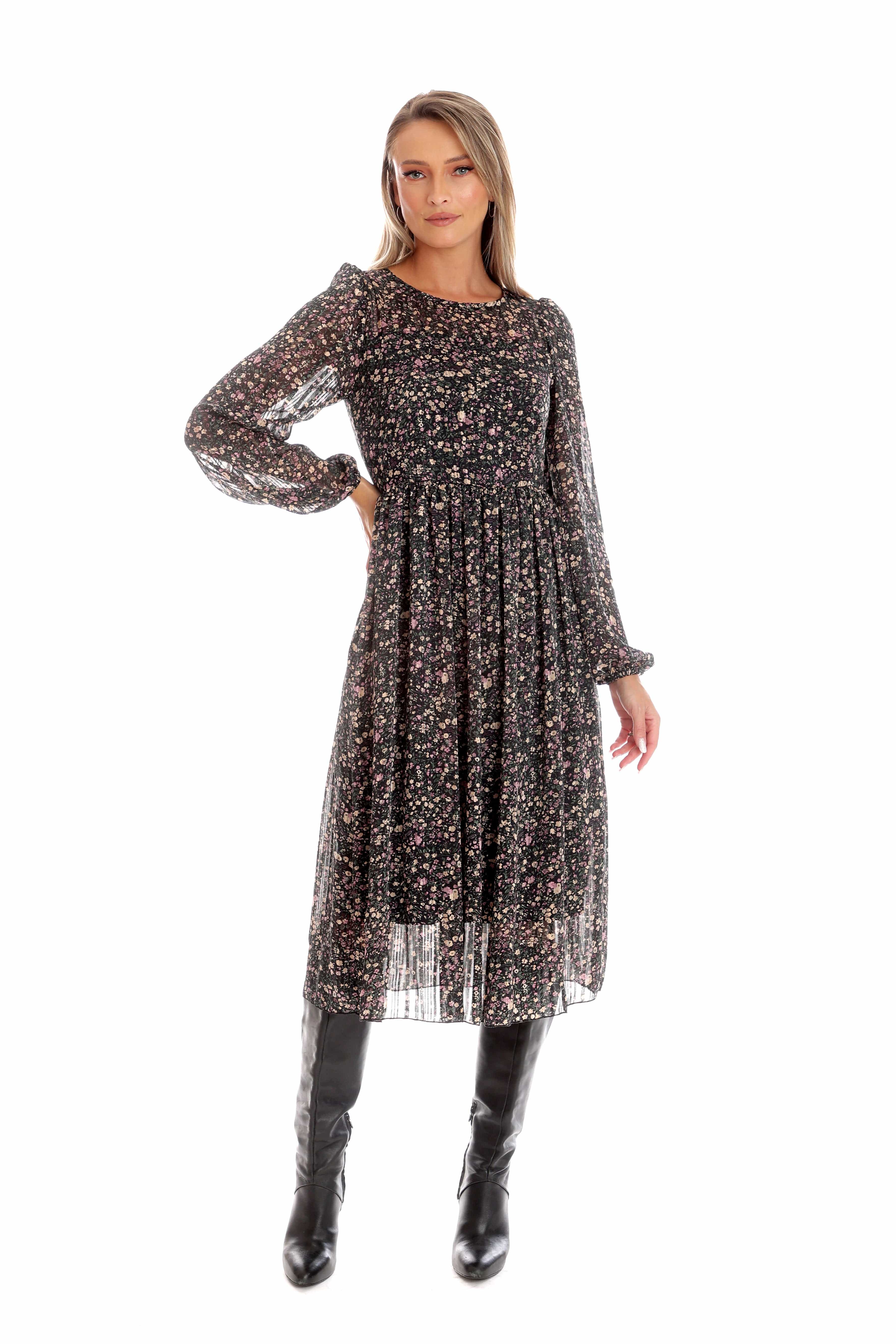 Rochie din voal Corina imprimeu floral pe fond negru îmbină rafinamentul cu confortul. Croiala cu talia marcată și fusta amplă îi oferă o linie feminină și fluidă, iar mânecile lungi, ușor transparente, adaugă un aer romantic. Tivul este decorat cu detaliu plisat, care îi conferă o notă aparte de eleganță.