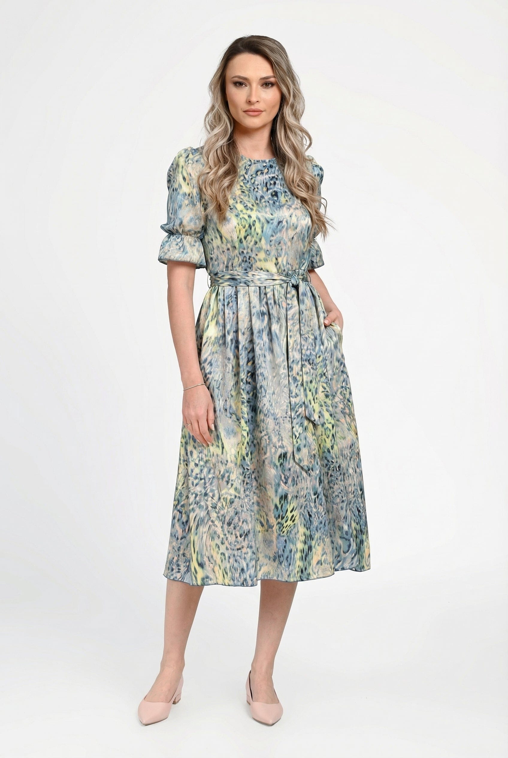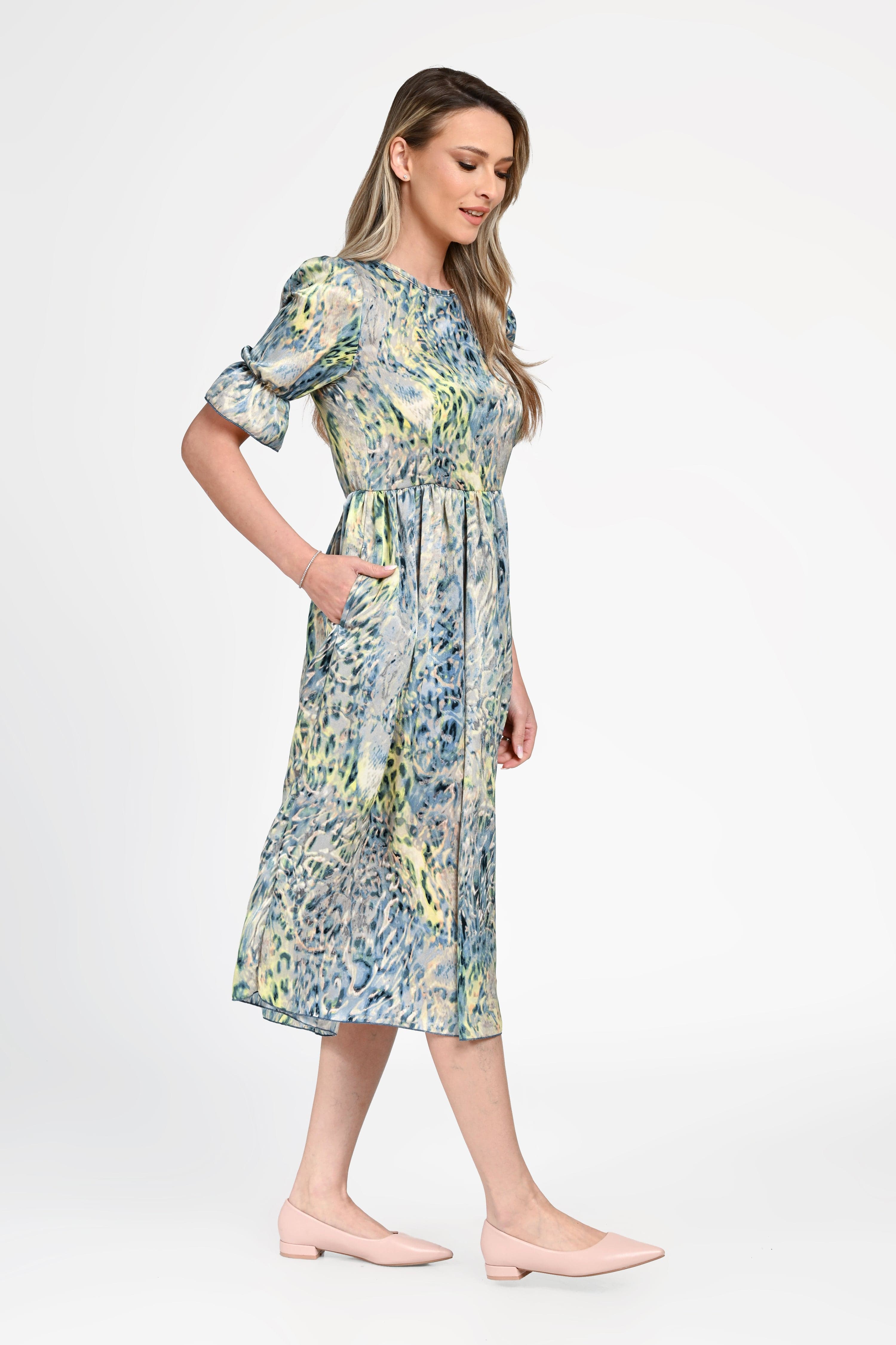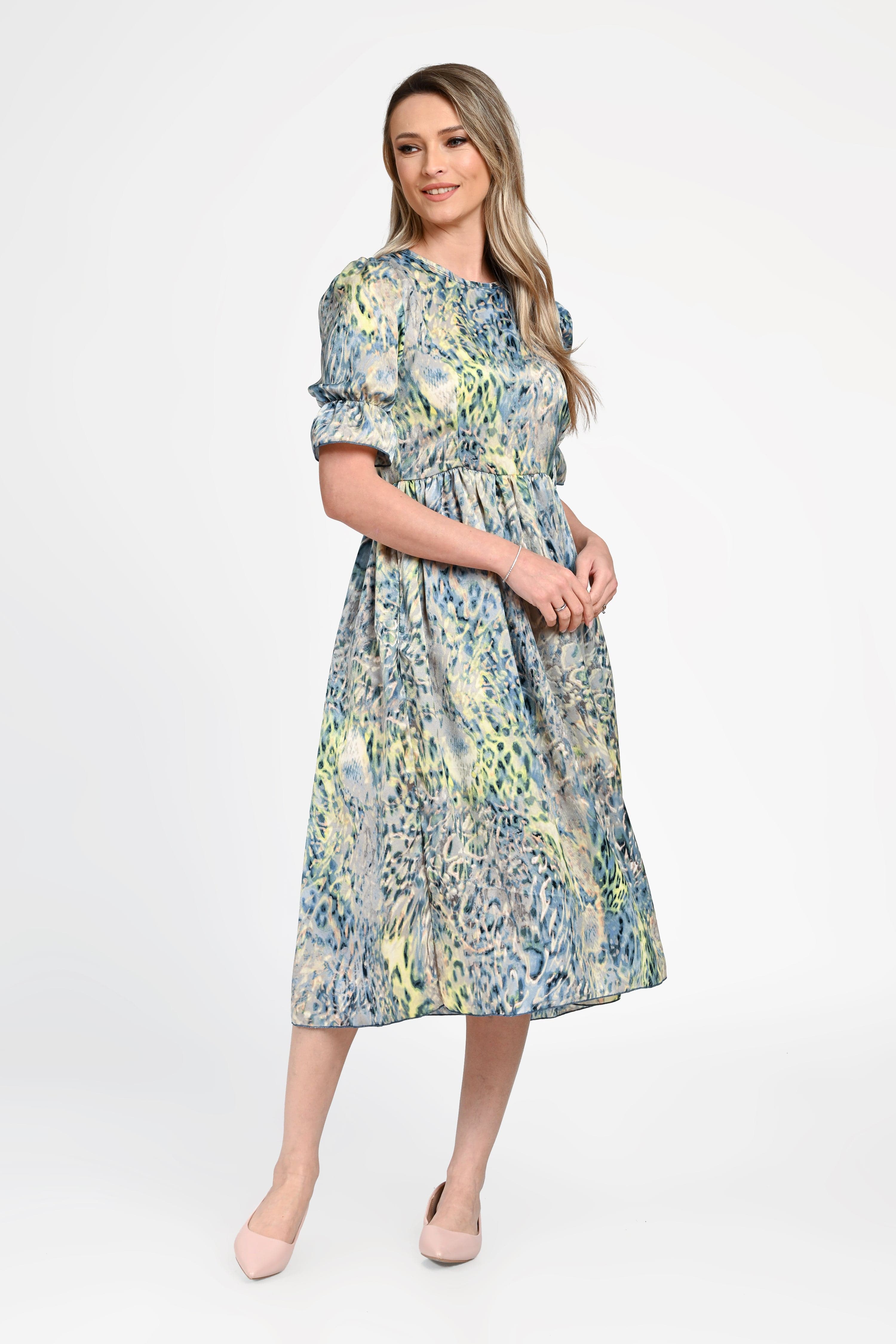 Croiala midi, ușor evazată, pune în valoare silueta și oferă libertate de mișcare, în timp ce talia este subliniată de un cordon delicat, ajustabil, ce adaugă un plus de feminitate. Imprimeul abstract, în nuanțe armonioase de verde, albastru și tonuri neutre, oferă un aer sofisticat și versatil.