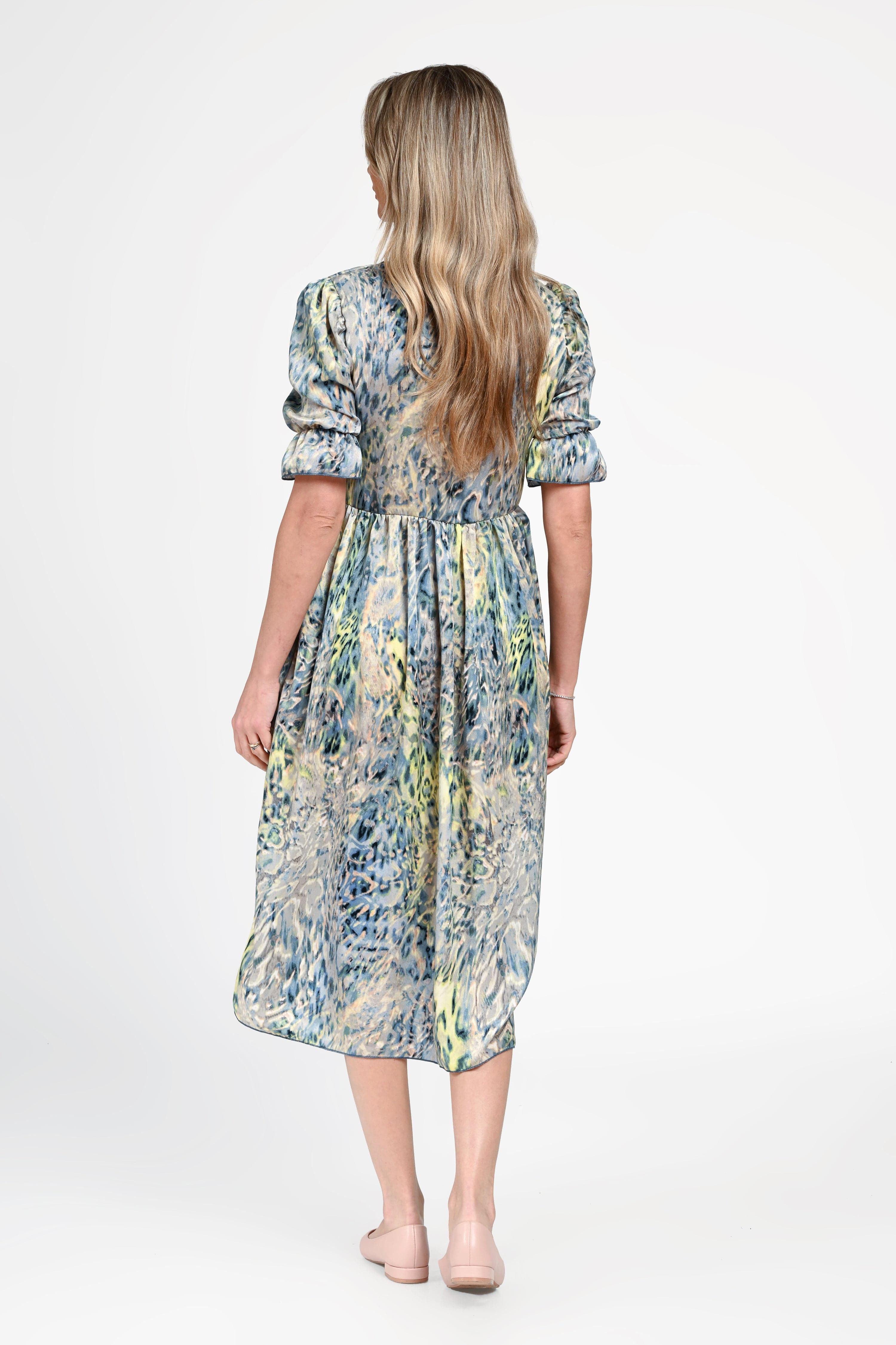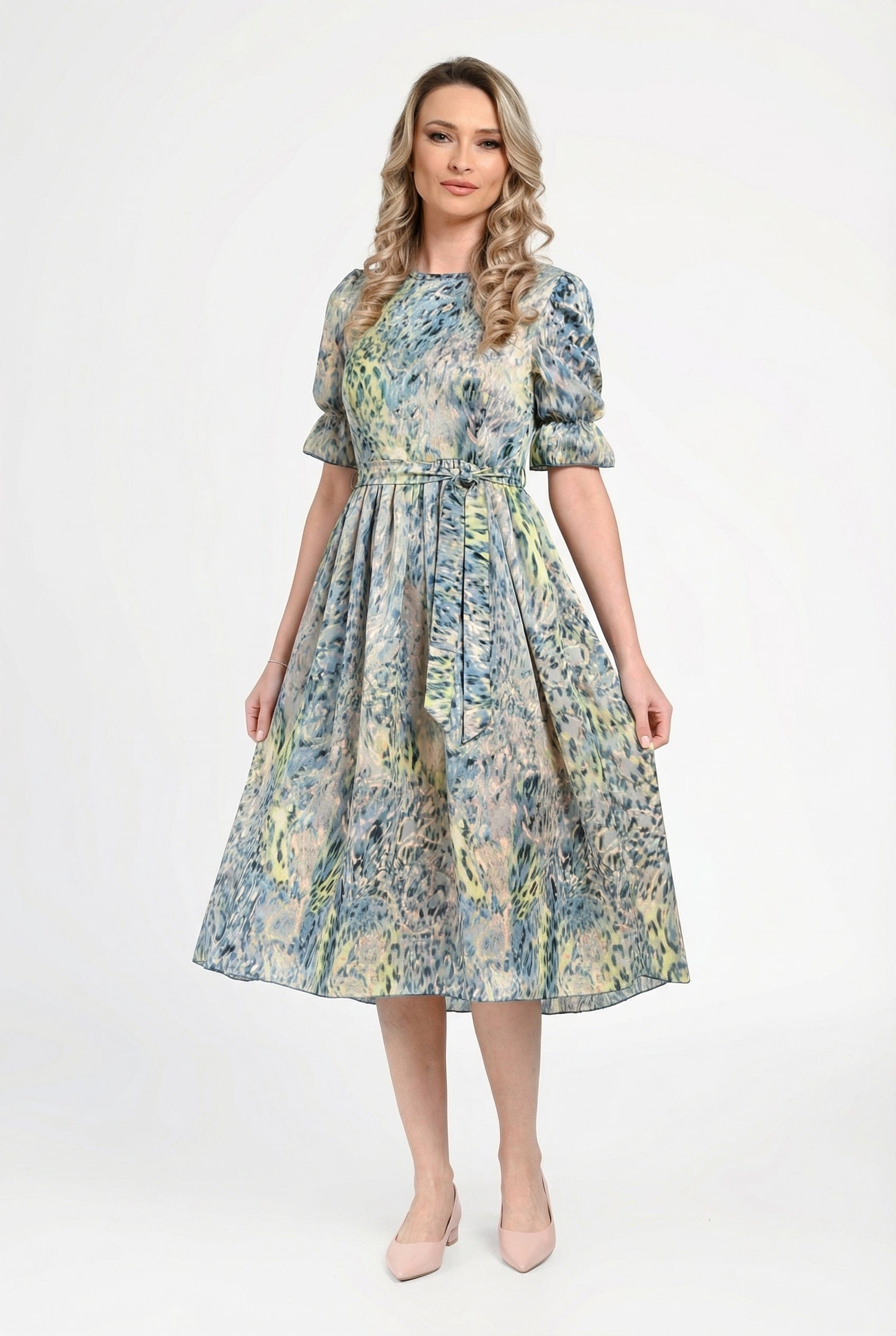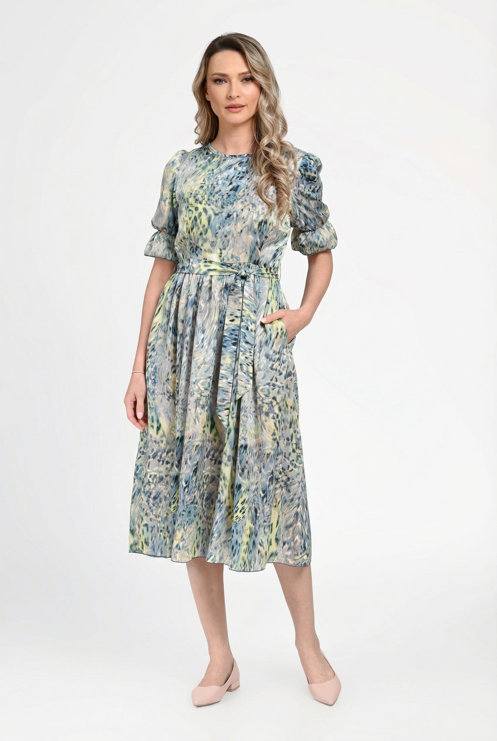 Croiala midi, ușor evazată, pune în valoare silueta și oferă libertate de mișcare, în timp ce talia este subliniată de un cordon delicat, ajustabil, ce adaugă un plus de feminitate. Imprimeul abstract, în nuanțe armonioase de verde, albastru și tonuri neutre, oferă un aer sofisticat și versatil.