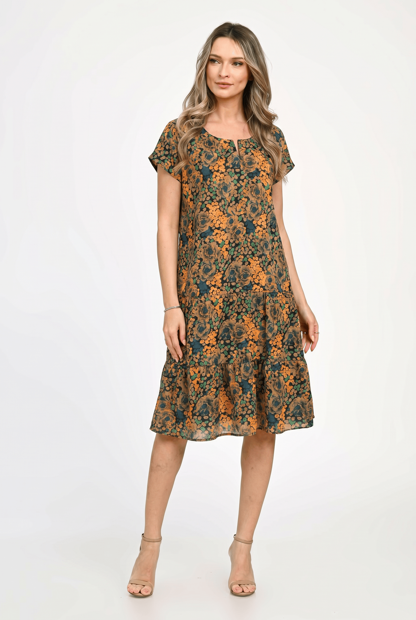 Imprimeul floral în nuanțe calde de verde și portocaliu adaugă un aer rafinat și ușor vintage, ideal pentru sezonul de toamnă sau pentru zilele în care vrei să ieși în evidență prin stil. Decolteul discret în V și mânecile scurte completează croiala lejeră, oferind confort pe tot parcursul zilei.
