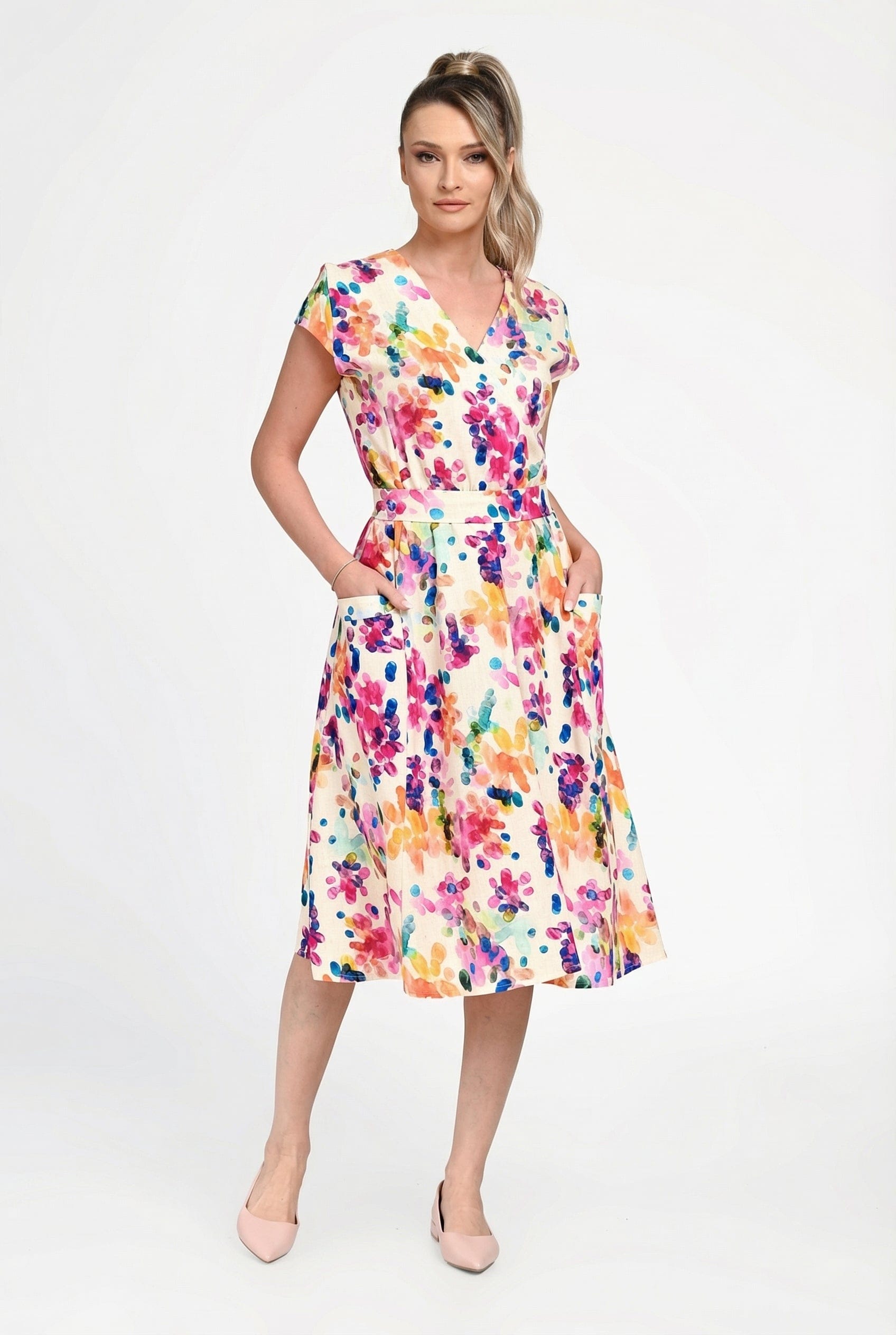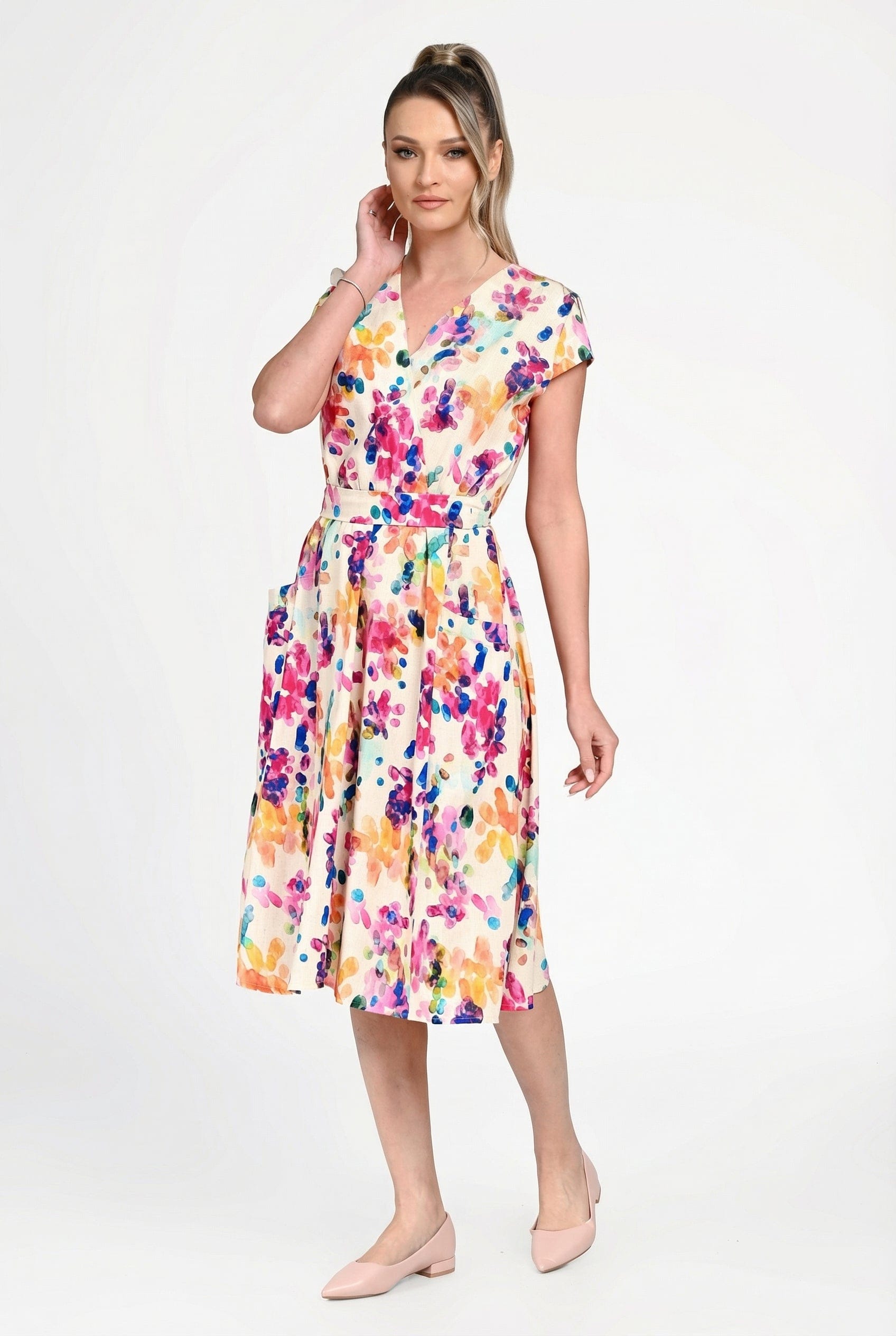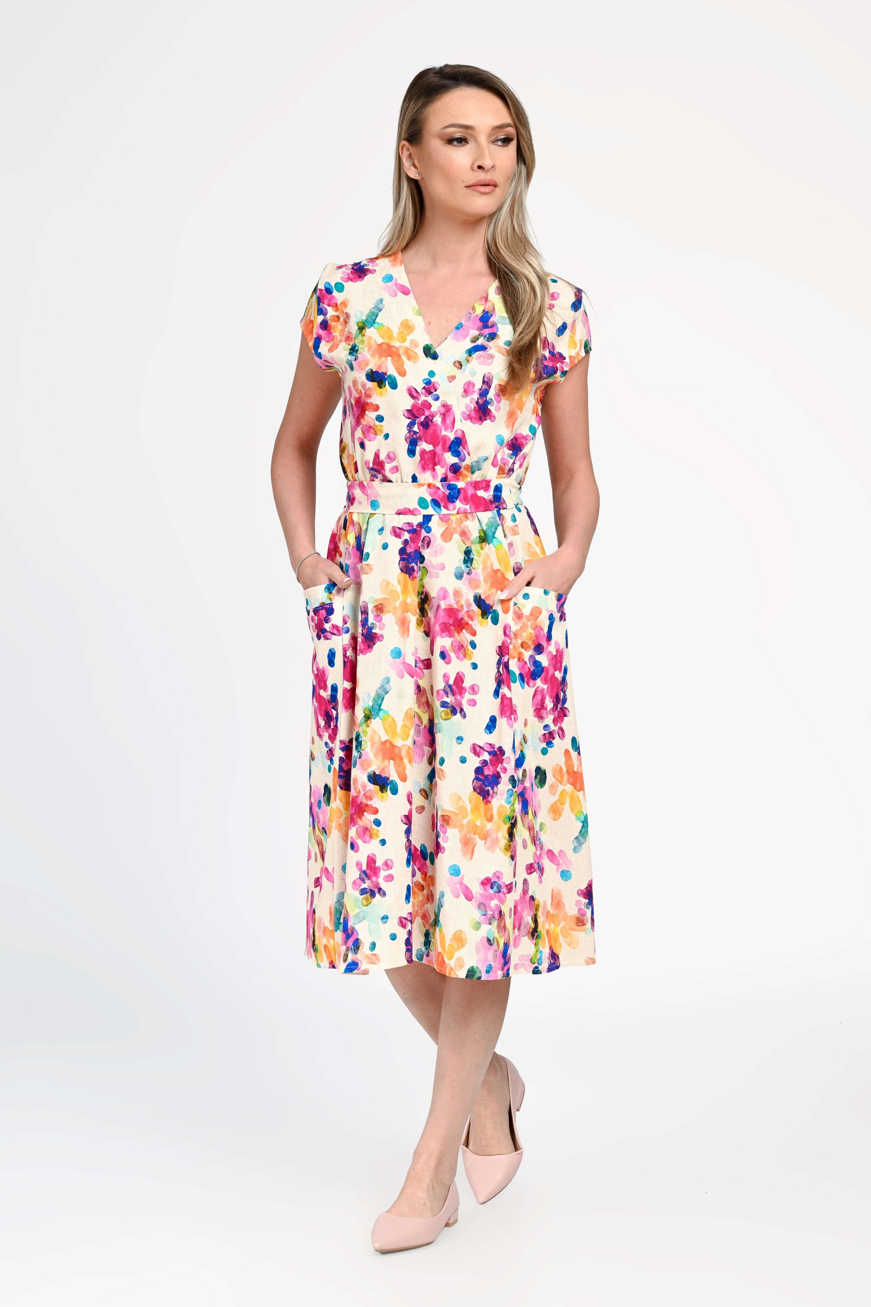 Imprimeul floral multicolor, în nuanțe vibrante, transformă rochia într-o piesă statement, ideală pentru plimbări, vacanțe sau evenimente de zi. Buzunarele laterale adaugă un plus de funcționalitate, fără a compromite eleganța.