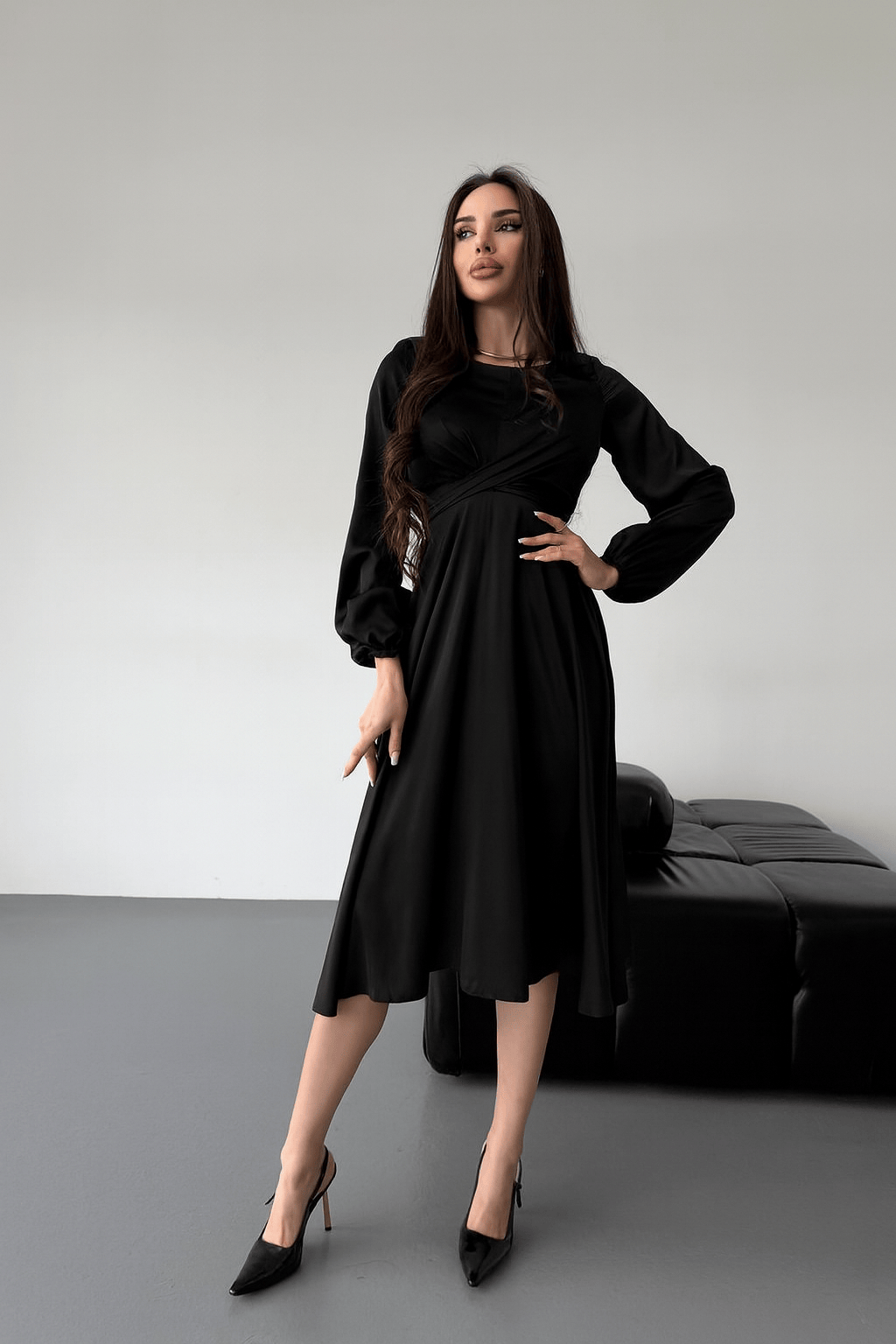 Rochie dama eleganta negra Gracie este definiția eleganței atemporale. Croiala lejeră, cu talia subtil evidențiată prin detaliul petrecut, creează o siluetă armonioasă și feminină. Mânecile lungi, ușor bufante, adaugă un aer sofisticat, iar materialul fluid asigură confort și libertate de mișcare. O piesă versatilă, ideală pentru evenimente speciale, seri elegante sau apariții rafinate în orice sezon.