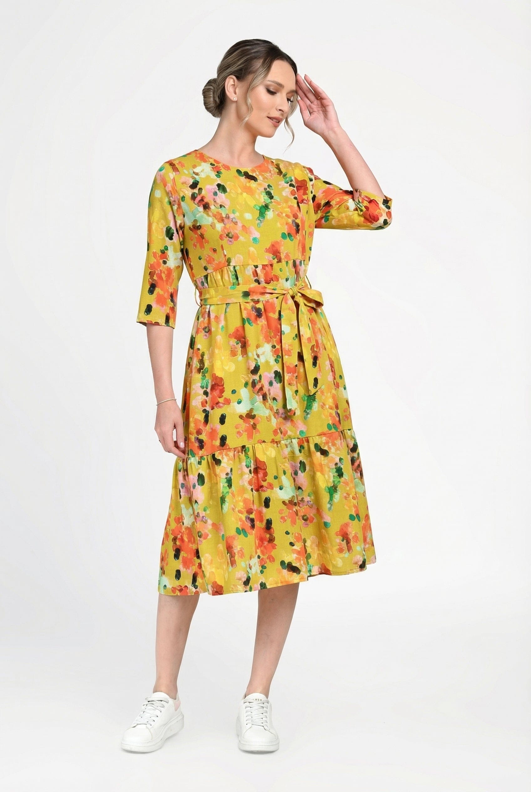 Rochie damă din in cu viscoză cu imprimeu floral galben Mirela