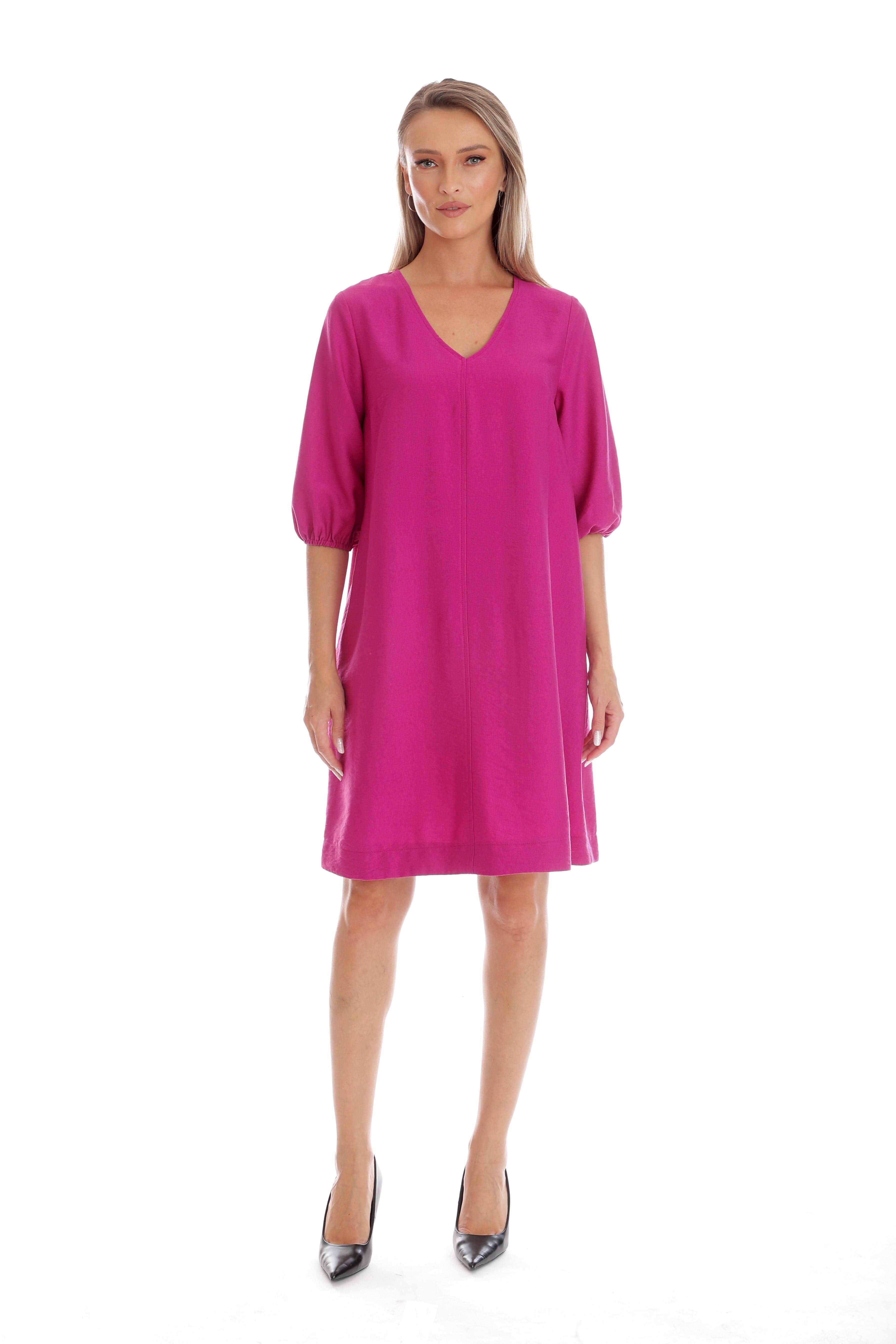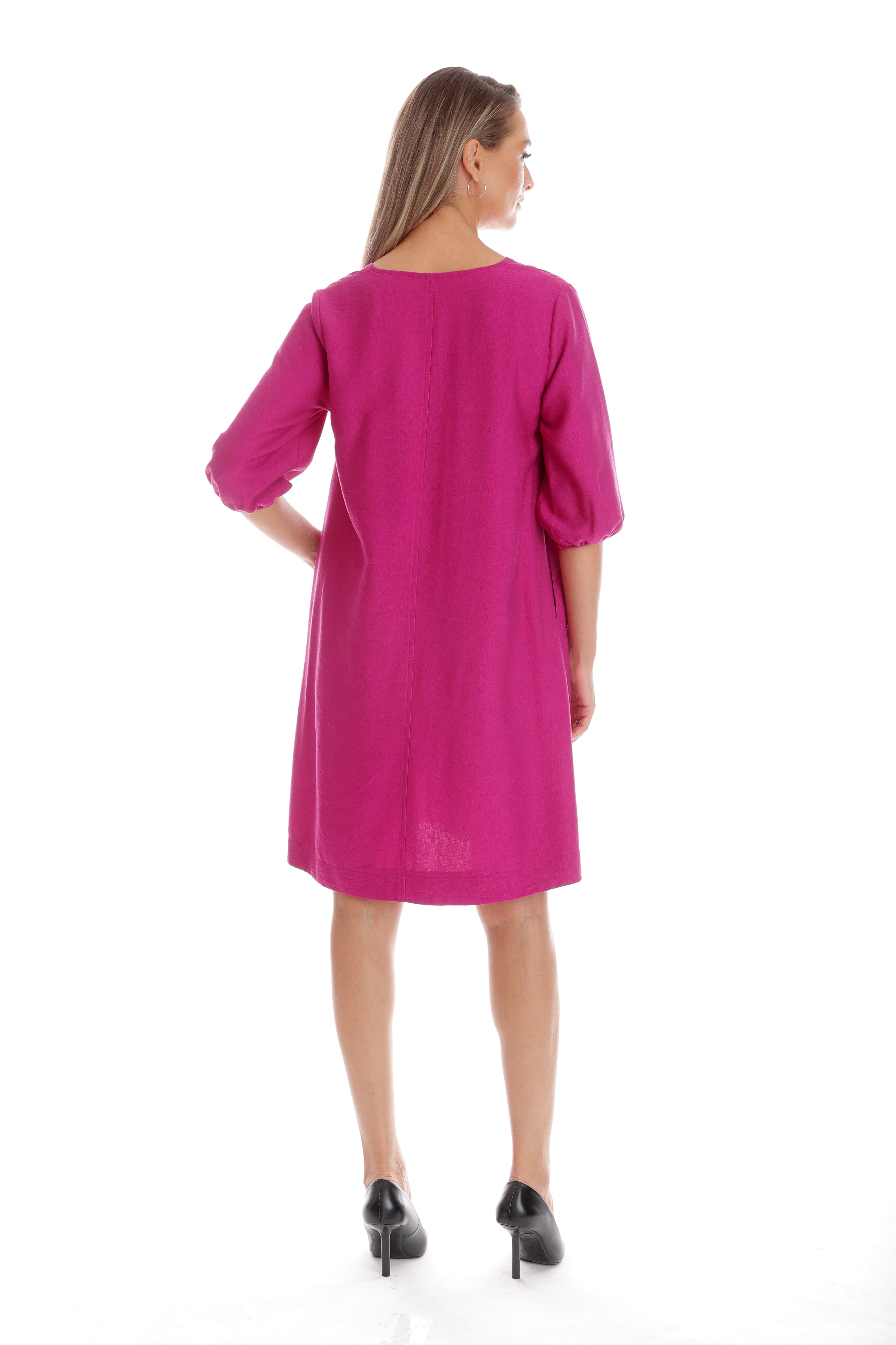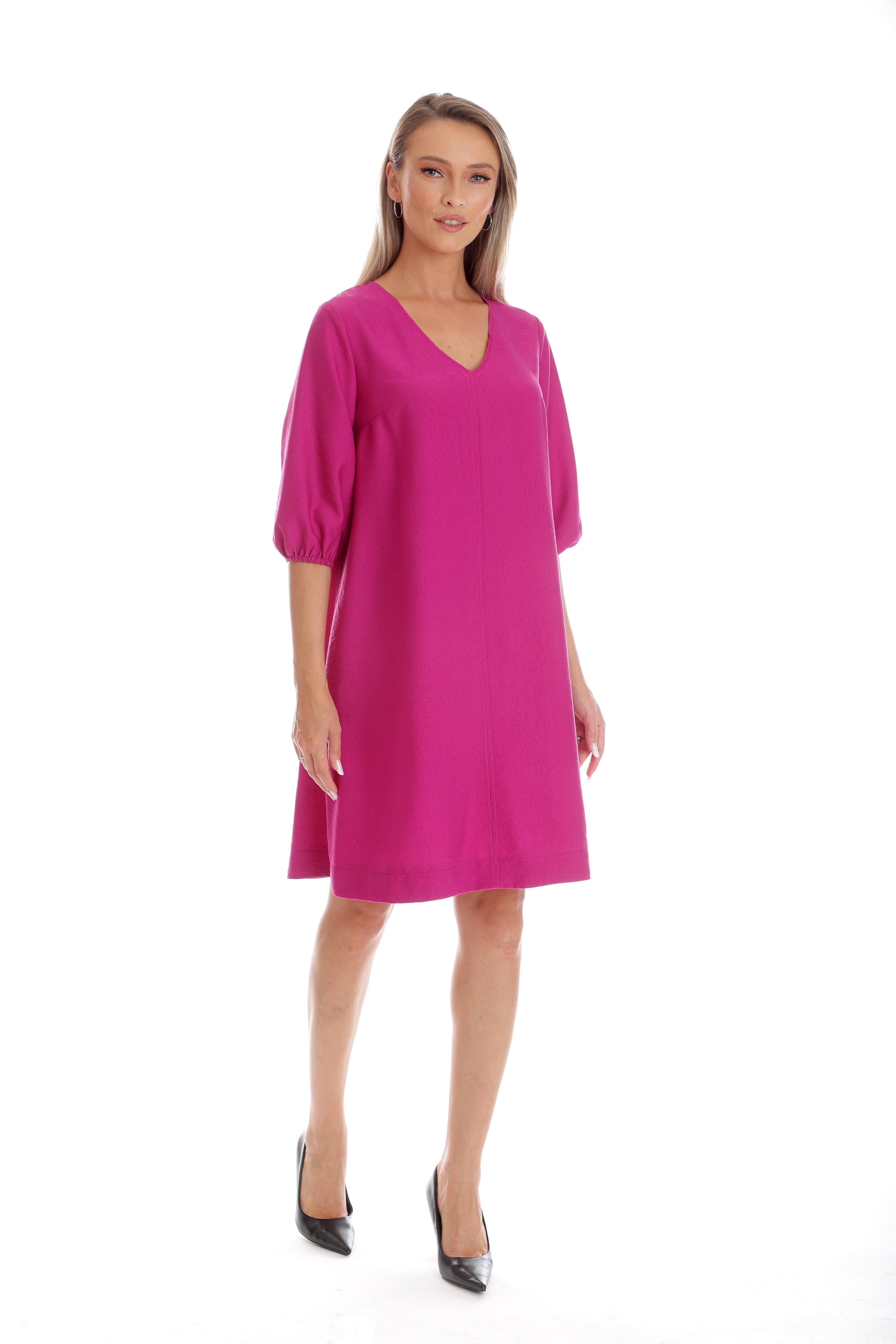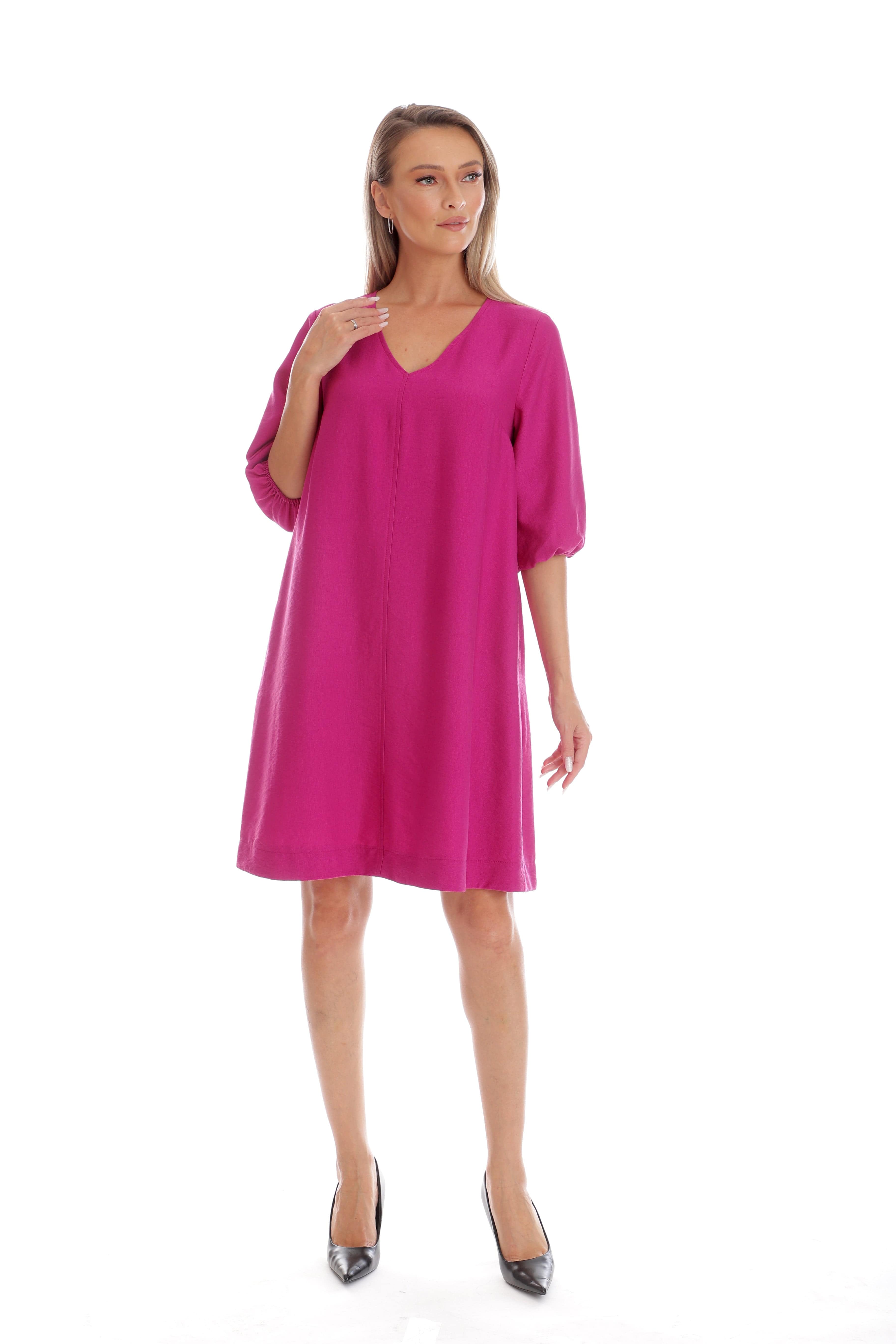 Aceasta rochie are un croi lejer, tip A-line, care cade fluid si ofera mult confort. Este realizata dintr-o viscoza mai plina, intr-o nuanta  de fuchsia, vibranta si feminina. Are decolteu in V, ce alungeste silueta si maneci 3/4 bufante care dau un aer relaxat si elegant in acelasi timp. Buzunarele laterale reprezinta un detaliu practic, ce adauga lejeritate tinutei.