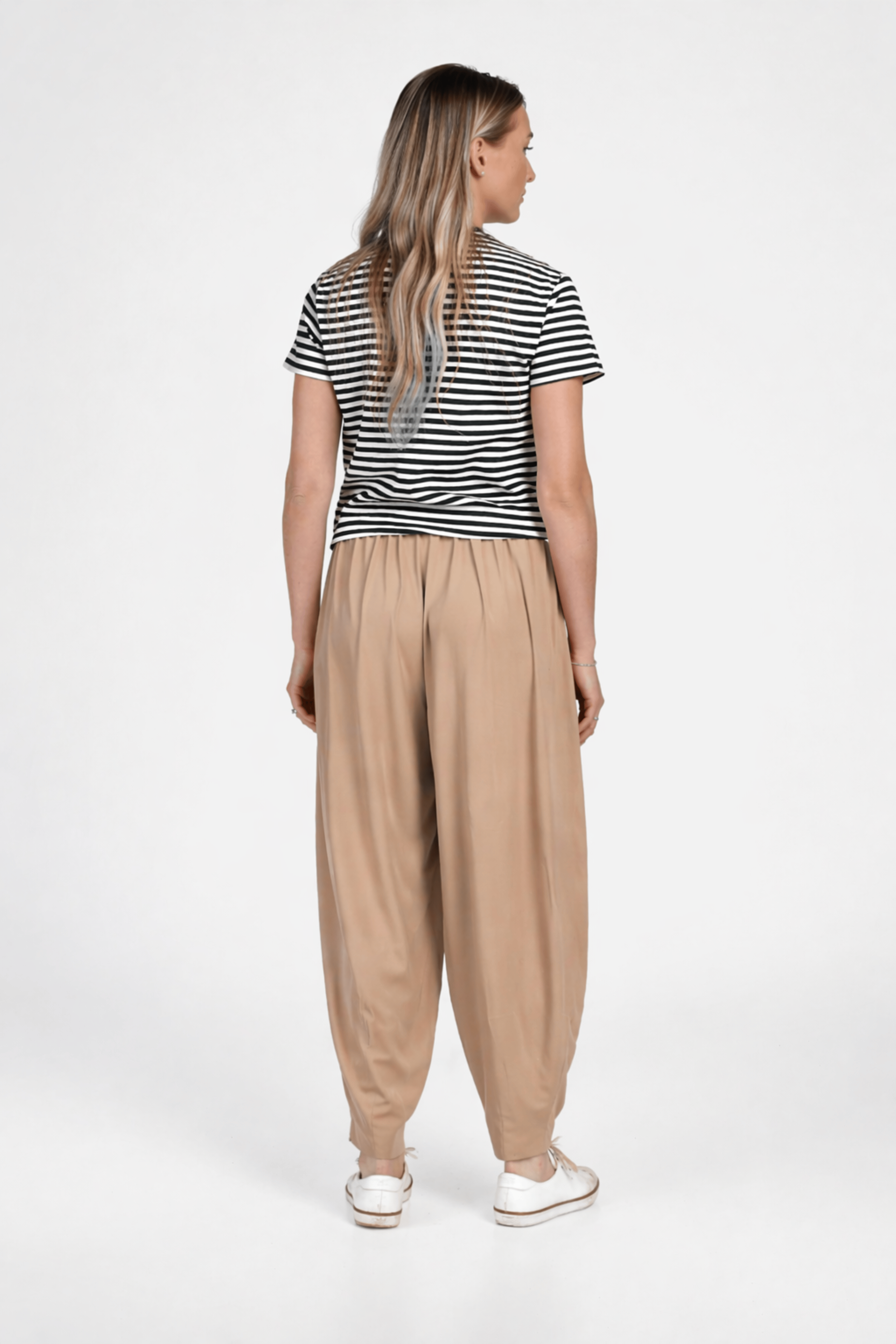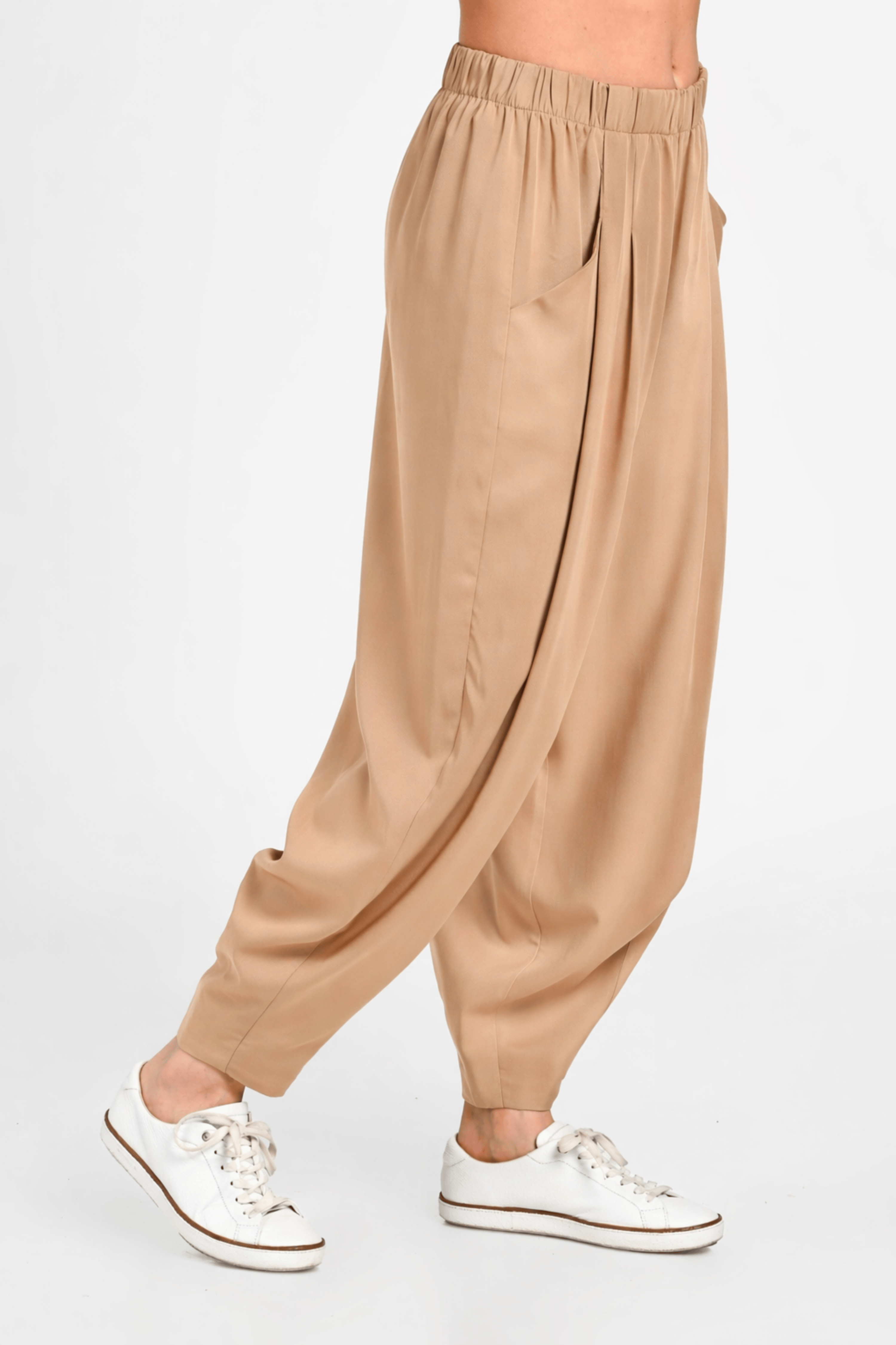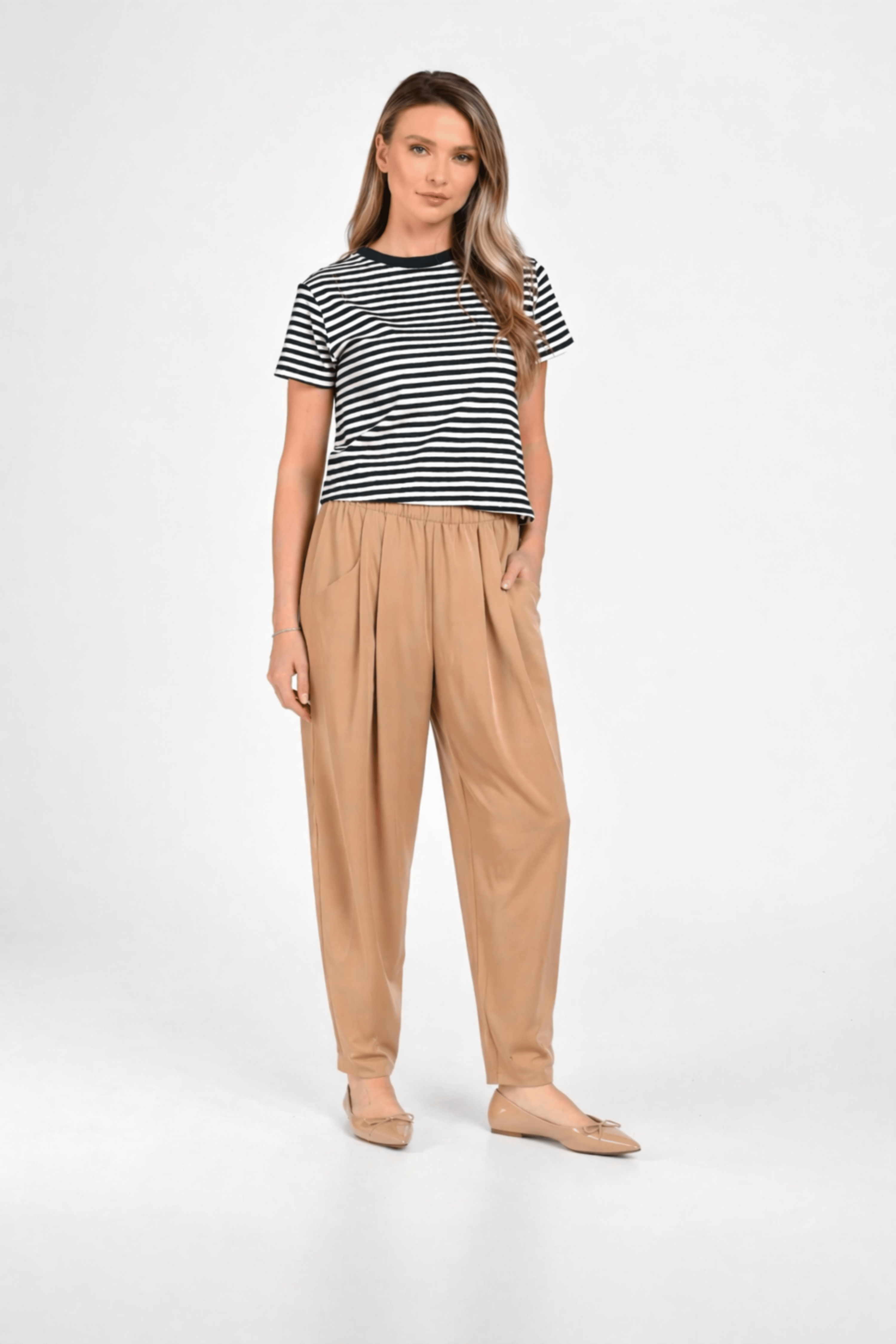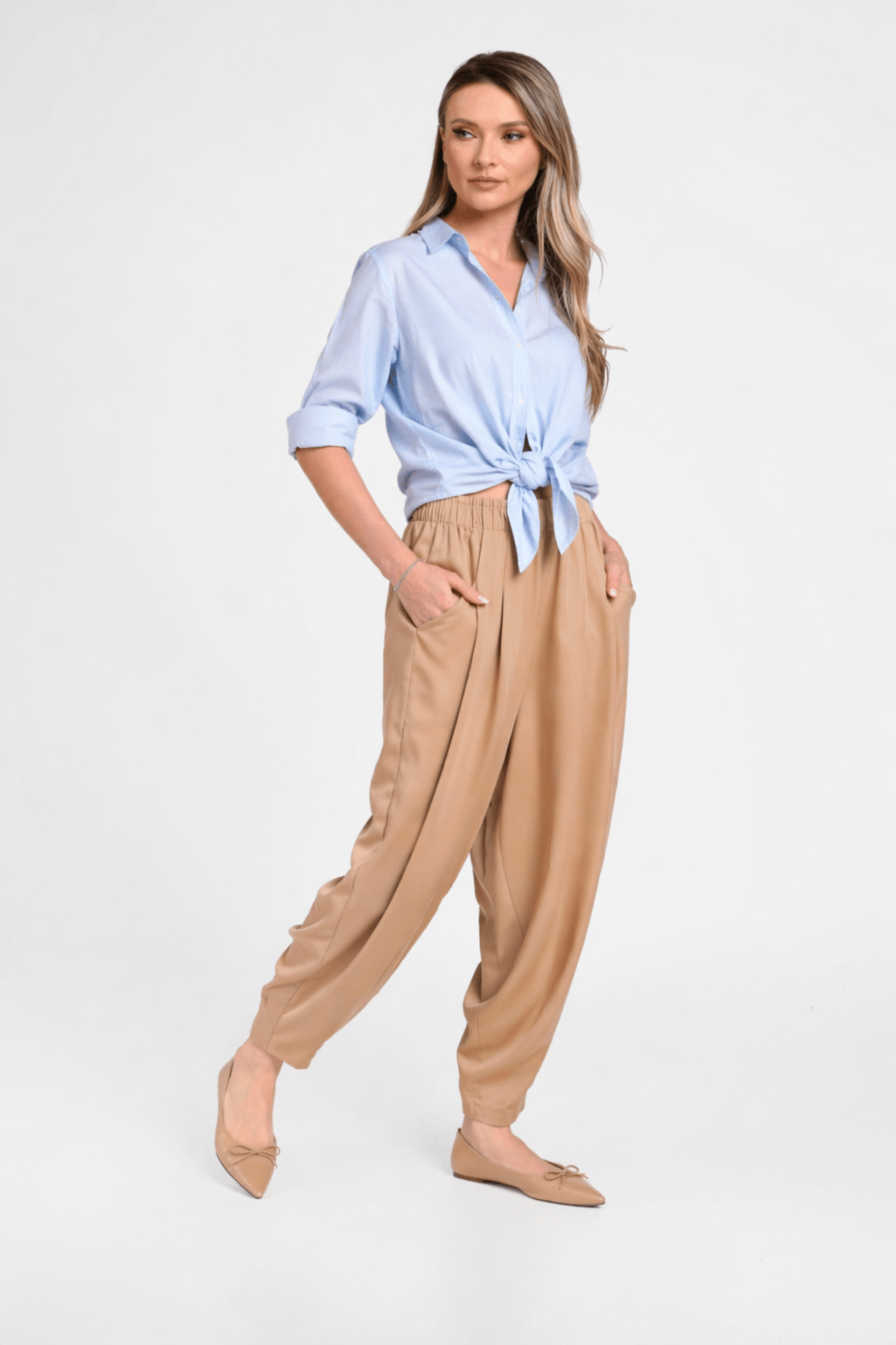 Pantaloni lejeri si comozi, confectionati din viscoza de culoare camel inchis, cu un croi amplu si fluid. Au talie elastica, ceea ce ii face usor de purtat si adaptati pe corp. Croiala este usor conica spre glezna, unde se strang discret, creind un efect relaxat, dar stilizat.  Buzunarele laterale sunt un detaliu functional care scoate in evidenta faldurile formate de materialul fluid.