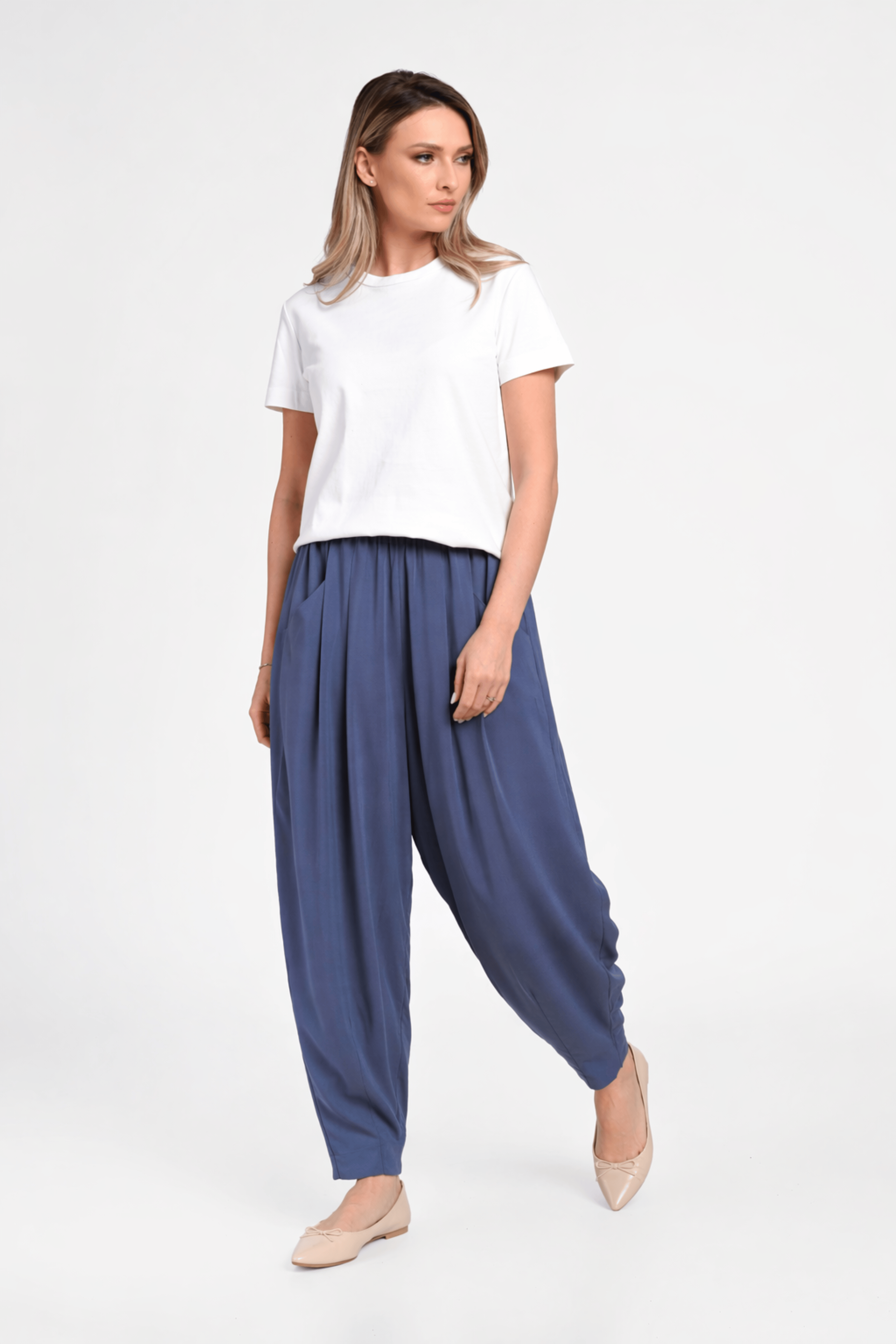 Salvari extrem de actuali, confectionati dintr-o viscoza moale si fluida, culoarea albastru prafuit (denim). Croiul este lejer, usor bufant iar pliurile formeaza falduri ample, puse in evidenta de materialul fluid. Talia este elastica si asigura confort si adaptabilitate, iar buzunarele laterale adauga un element practic.