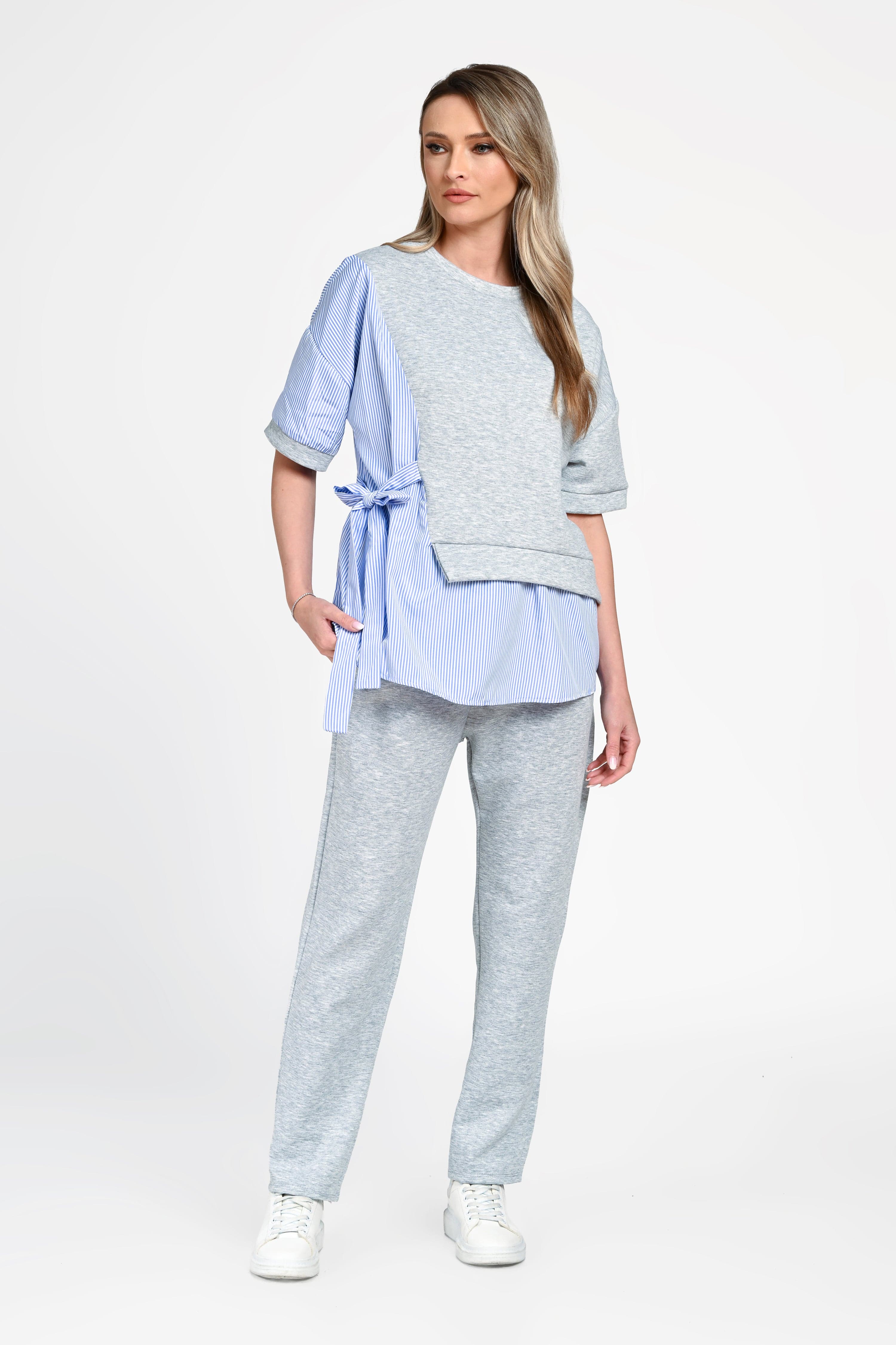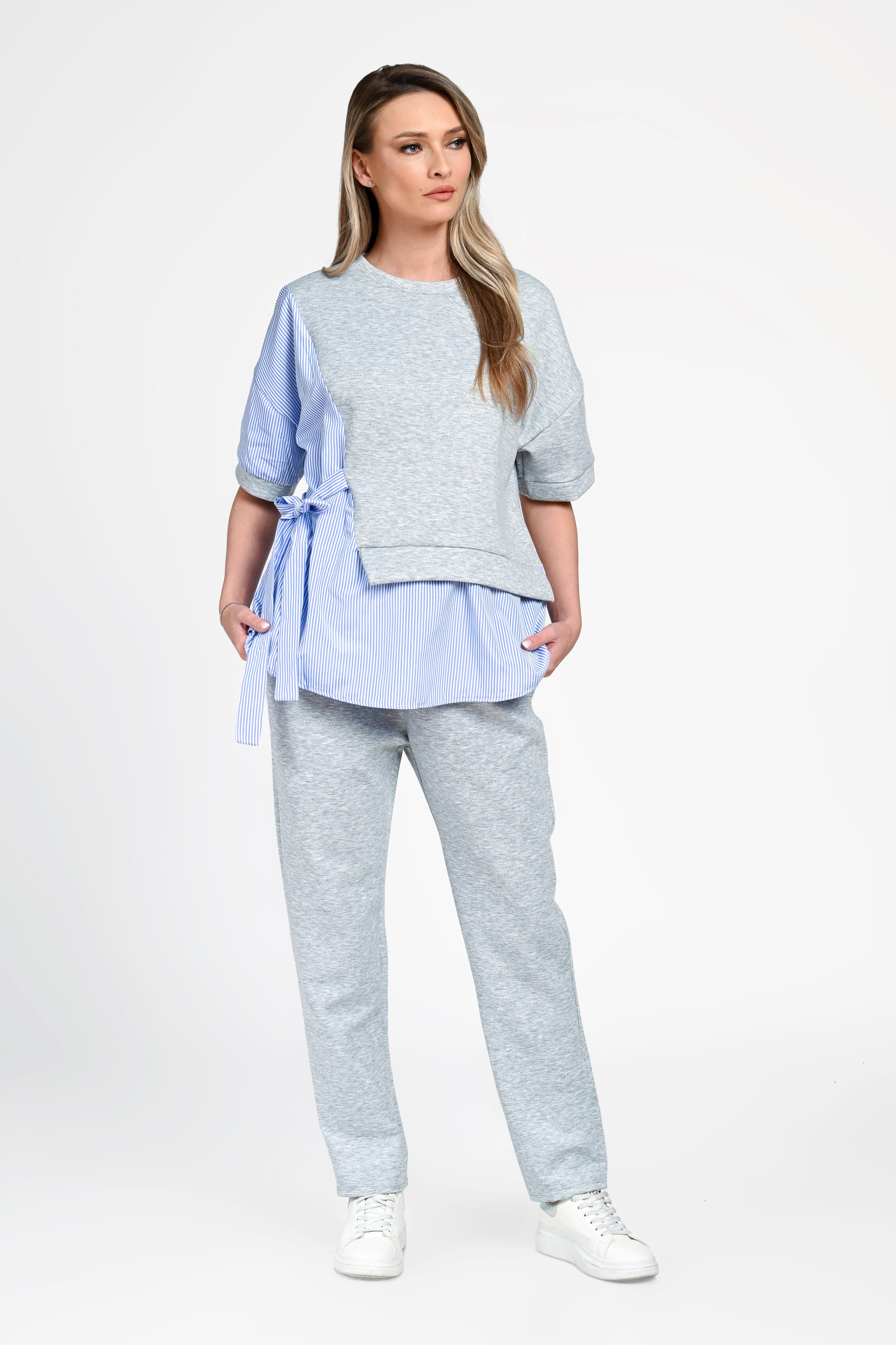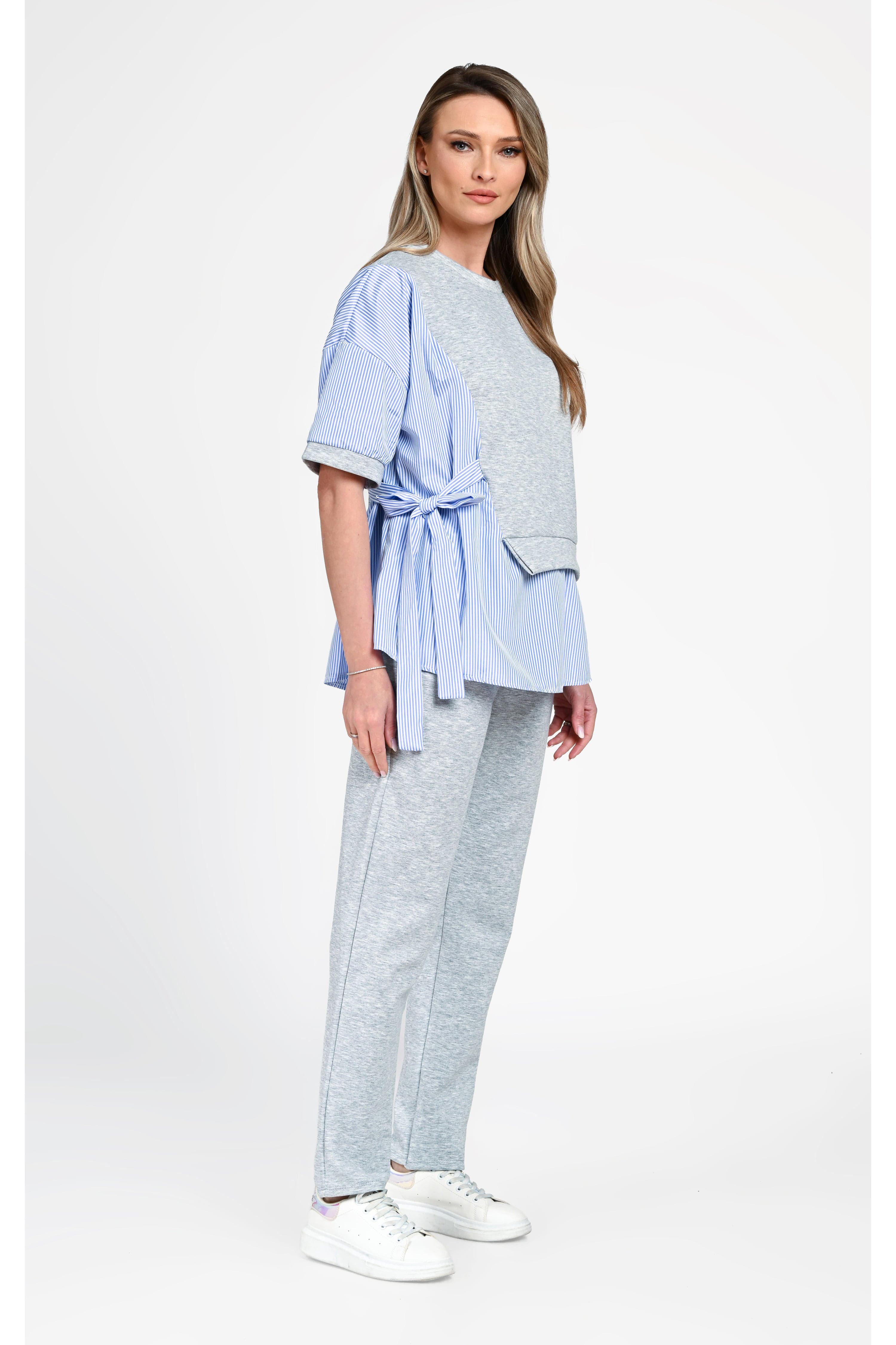 Bluza are o croială lejeră, cu design asimetric și inserții tip cămașă în dungi, care adaugă un plus de originalitate. Cordonul lateral evidențiază subtil talia, oferind un aspect feminin și modern. Mânecile scurte și croiala fluidă completează perfect partea superioară.