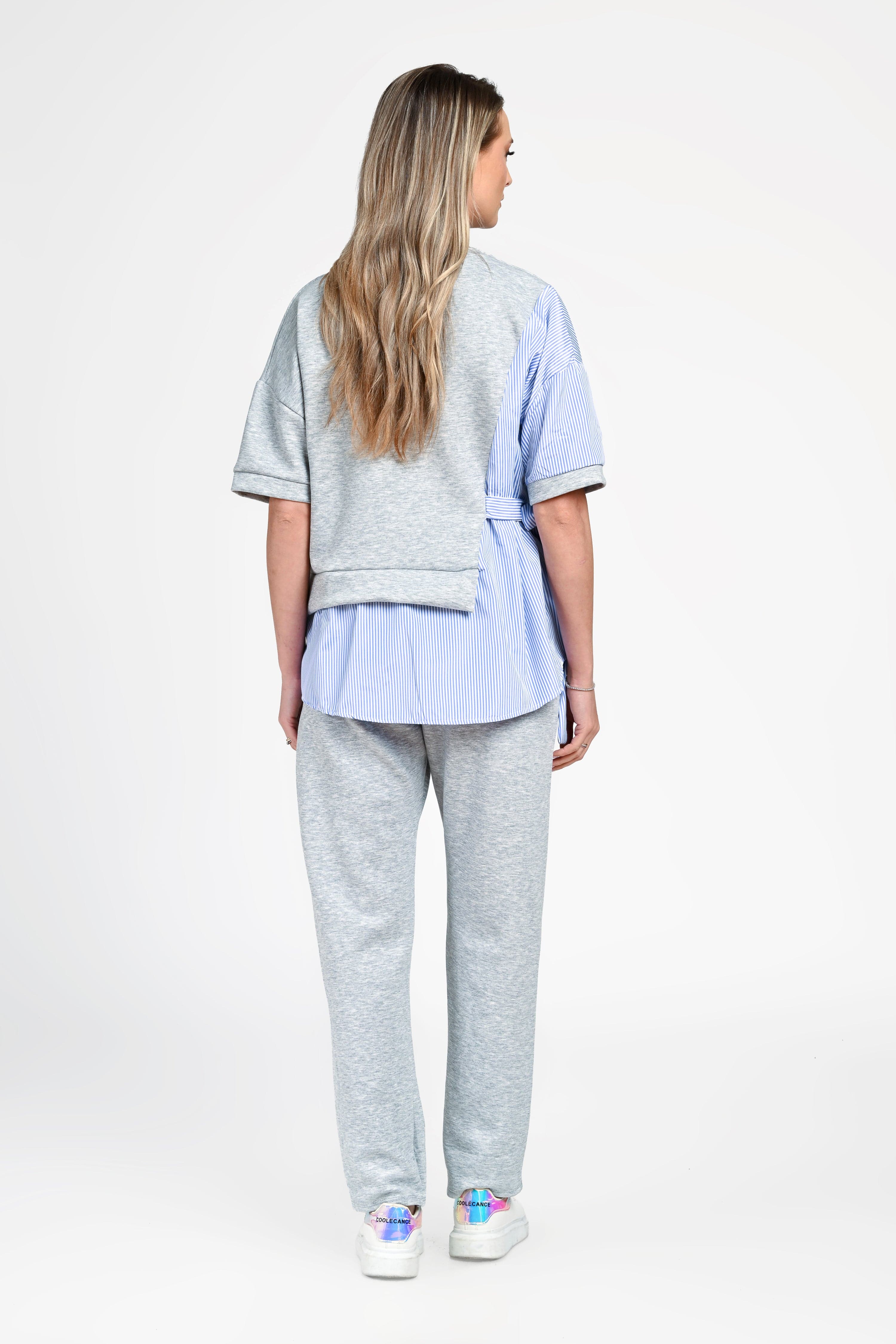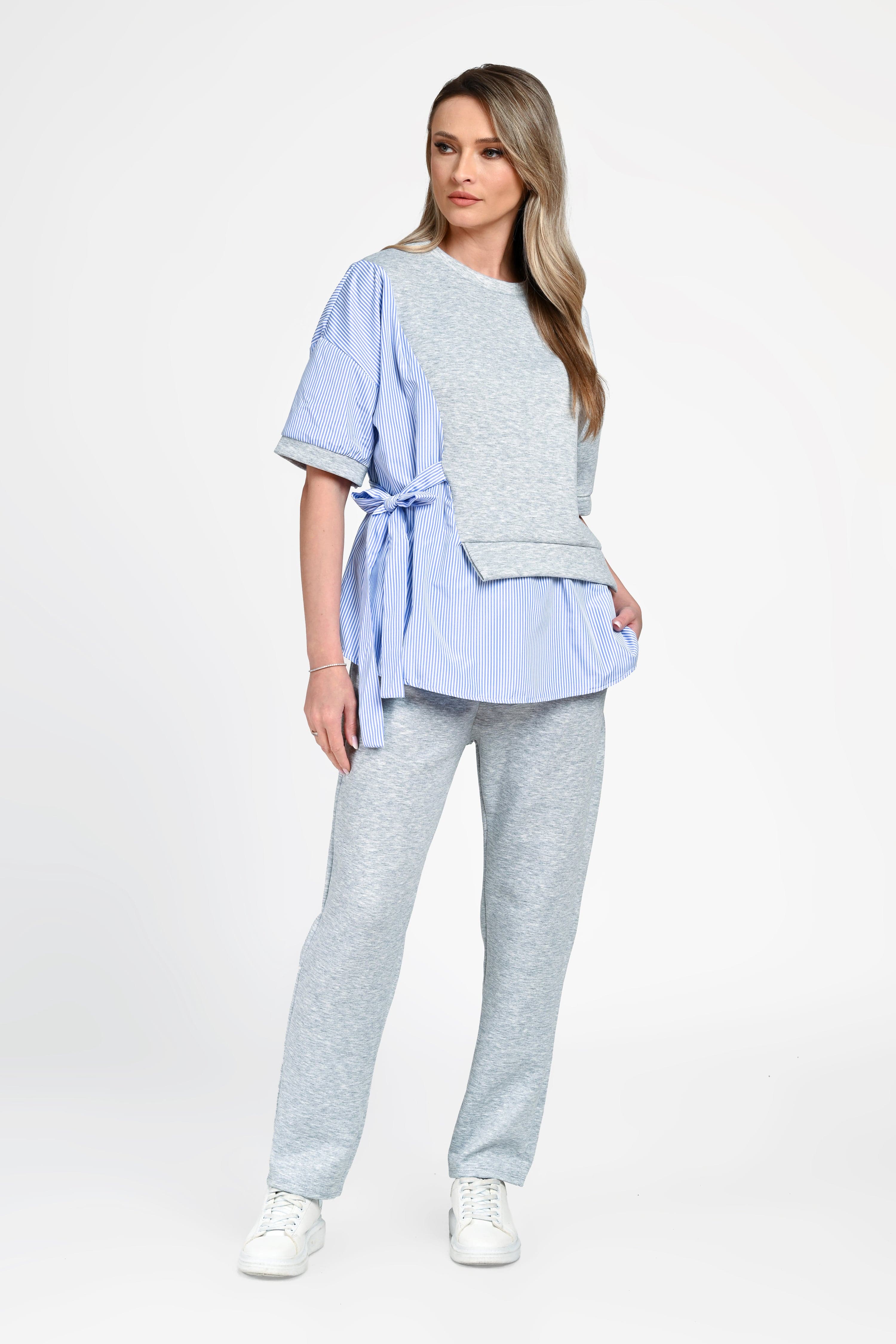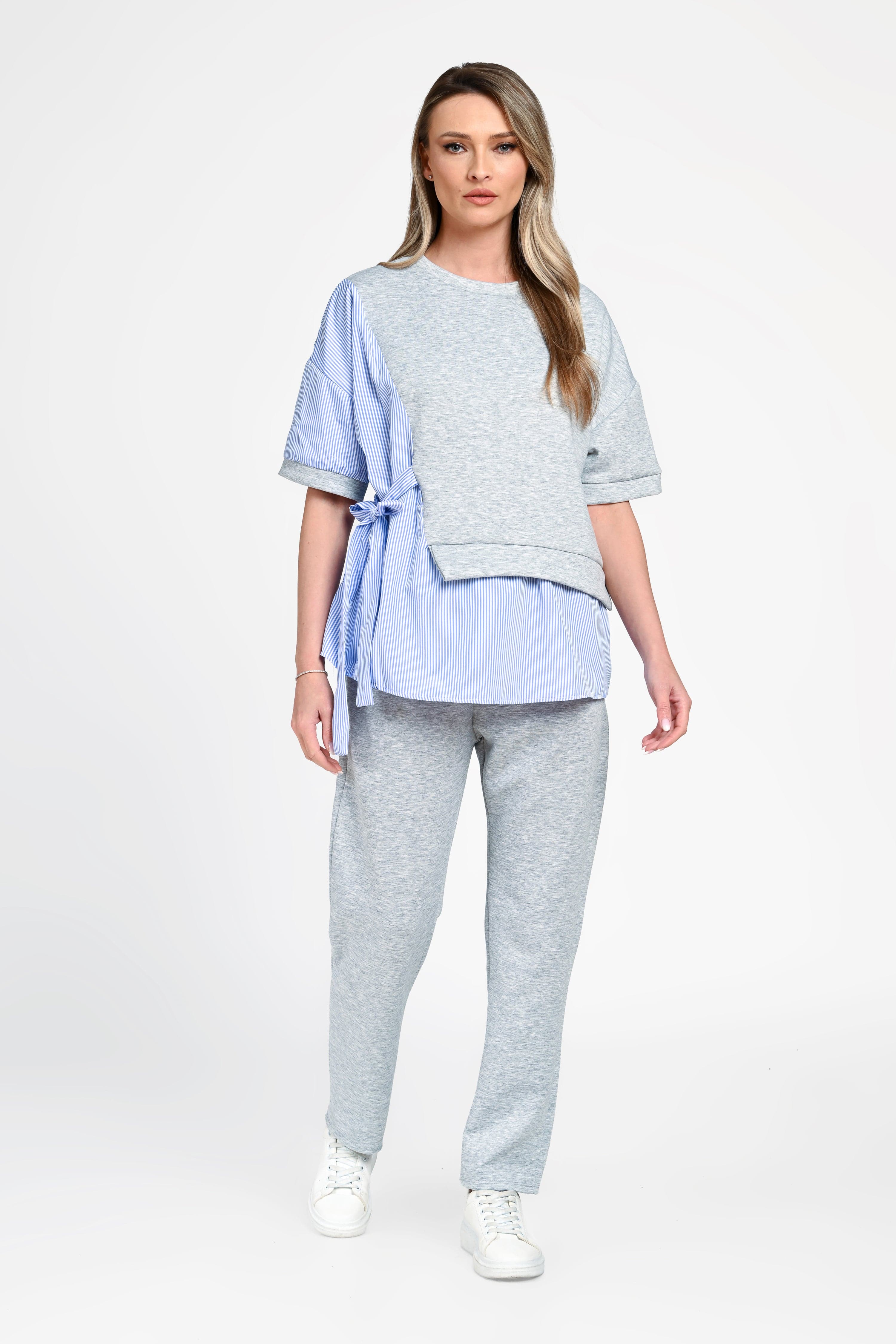 Bluza are o croială lejeră, cu design asimetric și inserții tip cămașă în dungi, care adaugă un plus de originalitate. Cordonul lateral evidențiază subtil talia, oferind un aspect feminin și modern. Mânecile scurte și croiala fluidă completează perfect partea superioară.